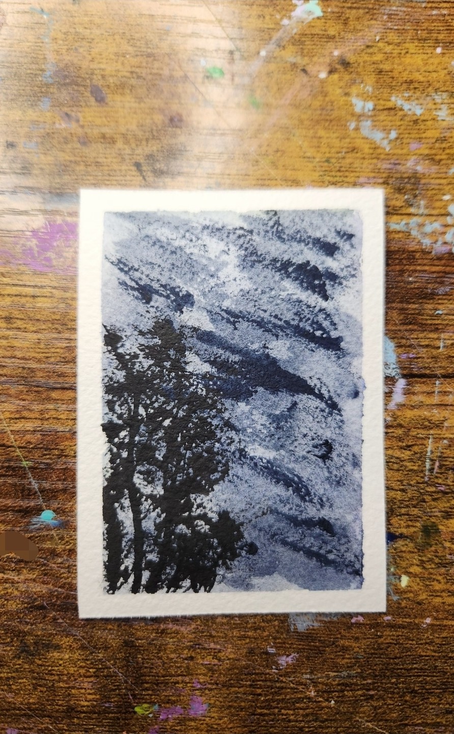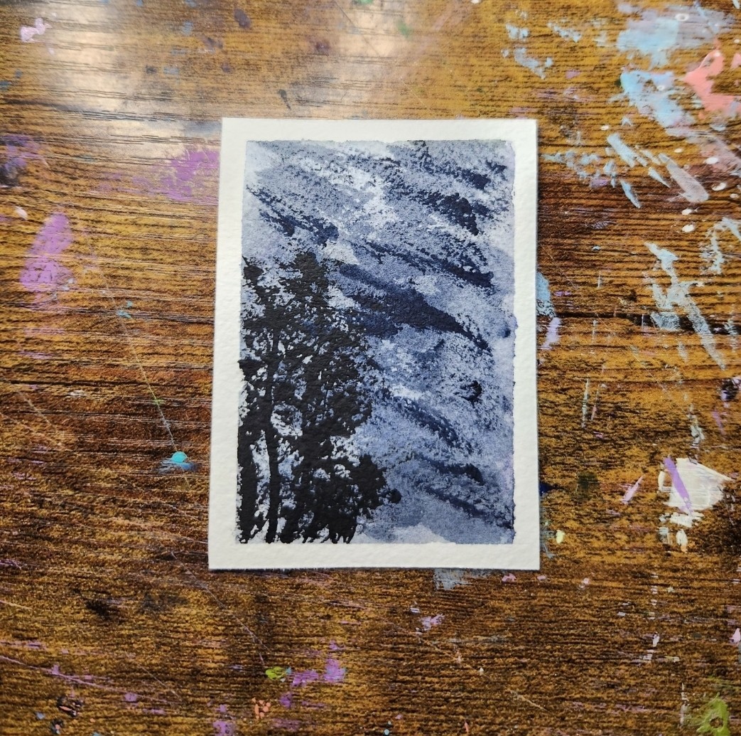 This ACEO art card features an original watercolor painting by artist El_duderino_Art, depicting a cloudy sky in a miniature size of 2.5" x 3.5". The painting is signed by the artist and is unframed, using paper as the material. The piece falls under the ultra contemporary period of 2020 to now and showcases a landscape with trees and a sunrise, making it a unique and handcrafted addition to any art collection.