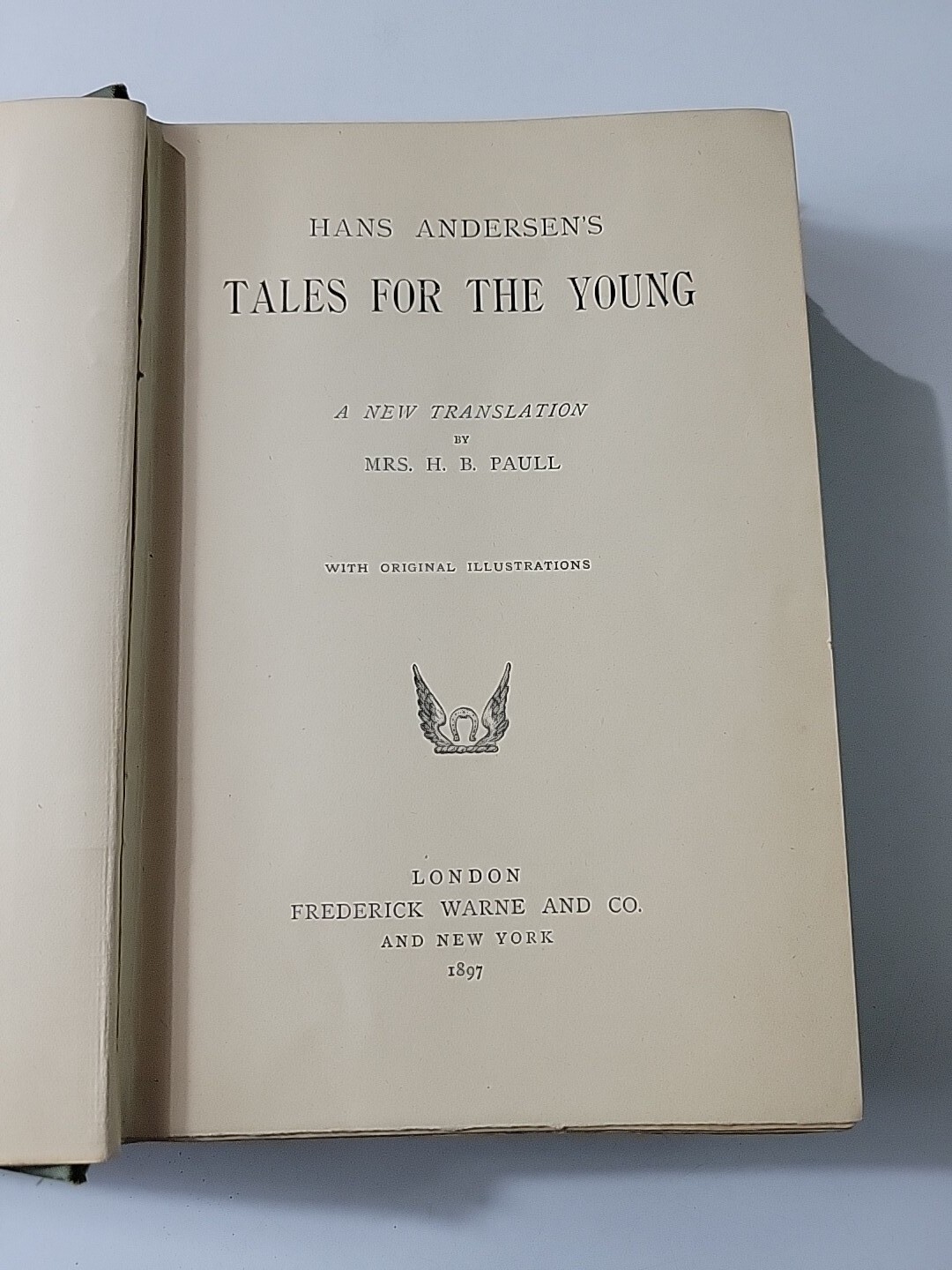 Hans christian anderson's tales for the young translated by h b paull. This is an antique copy and has Some spotting on the internal pages, a former owner's name written in the front and some damage to the bottom corner of the backboard. Please see photos for condition please ask any questions before you buy.