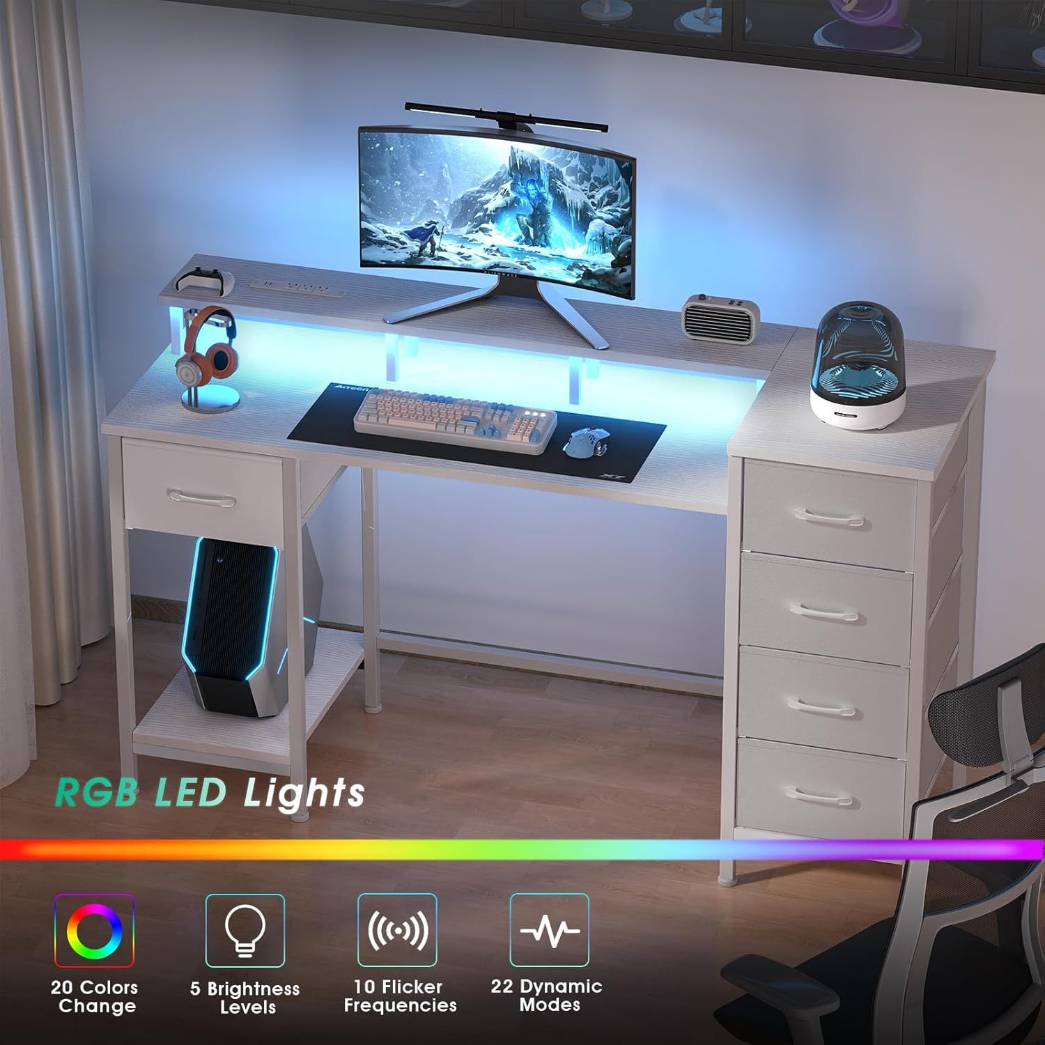 Computer Desk with Power Outlets & LED Lights, Reversible Gaming Desk with 5 Fabric Drawers for Bedroom, Home Office Desk with Monitor Stand & Storage Shelves for Working, Rustic Brown