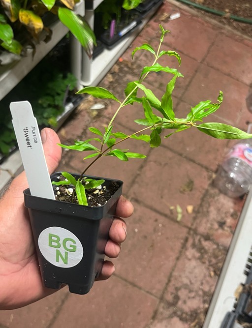 The Pomegranate Punica granatum 'Sweet' is a prized variety known for its exceptionally sweet, low-acid flavor. Unlike tart commercial types, the ‘Sweet’ pomegranate produces large, round fruits with soft pink to light red skin and juicy, pale pink arils that offer a mild and pleasant taste—perfect for fresh eating.