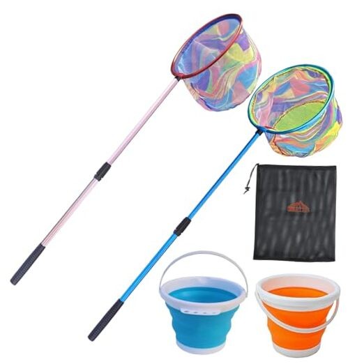 PACKAGE INCLUDES - Each portable fishing net set includes 2 nets (1 blue, 1 pink), made of similar material as adult nets with colorful patterns, making the nets more professional fishing gear for teens.2 Silicone Buckets (1 blue, 1 orange), the folding buckets are made of high-grade silicone material, thick and soft, very sturdy, take up little space and light weight.1 x Nylon net storage bag, very easy to carry and store, perfect gift for little fisherman.