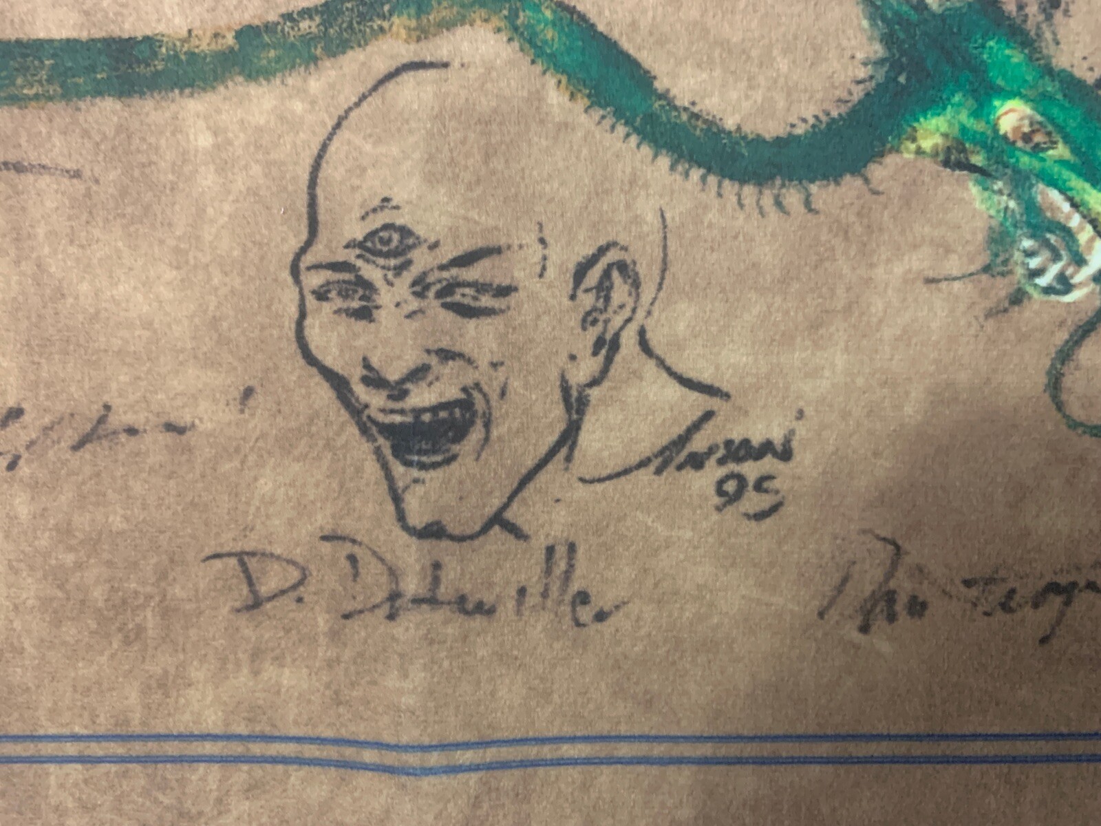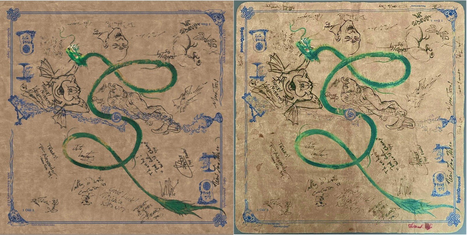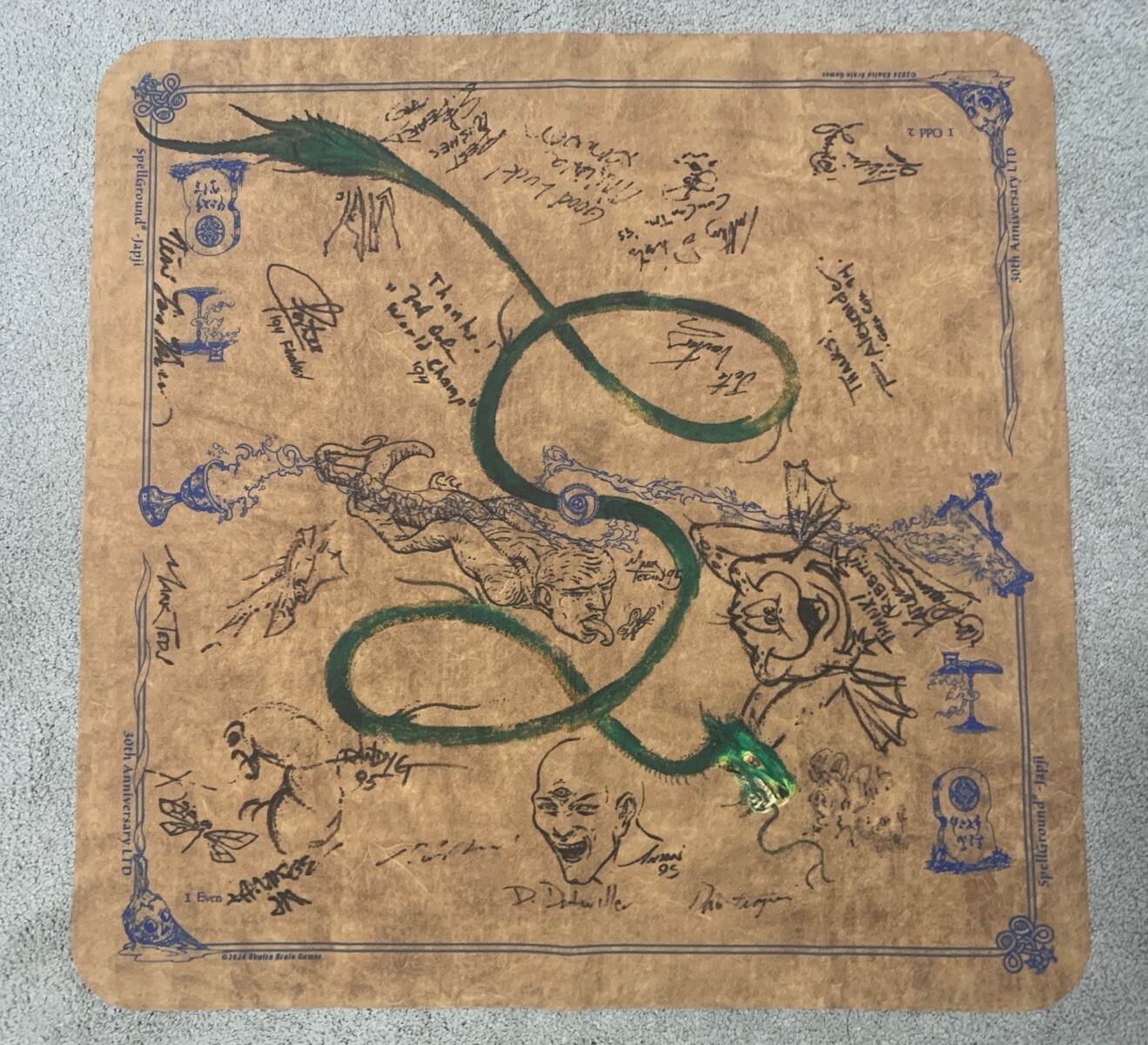 This is a replica of Japji Khalsa's own personal playmat that he played on that he would take to tournaments and conventions. This iconic playmat has famous Magic The Gathering artist sketches and signatures such as Mark Tedin, Melissa Bensen, Peter Venters, Anson Maddocks, Rob Alexander and Mark Poole. The original SpellGround artist himself Jeff Brain has graced this playmat with a green dragon that flows across the SpellGround mat. This playmat also features signatures from the inagrual 1994 Magic the Gathering World Championship players such as Zak Dolan and Bertrand Lestree.