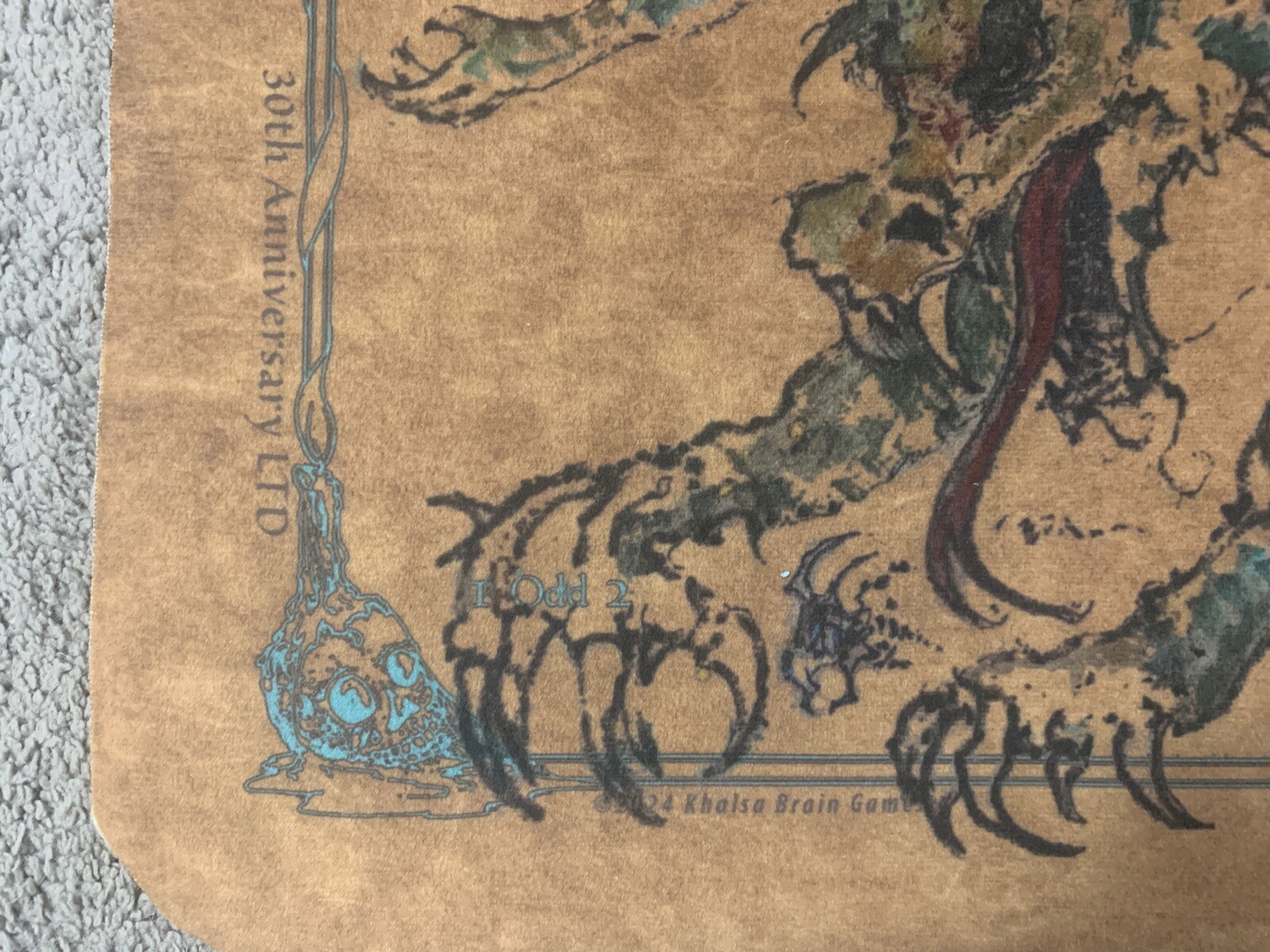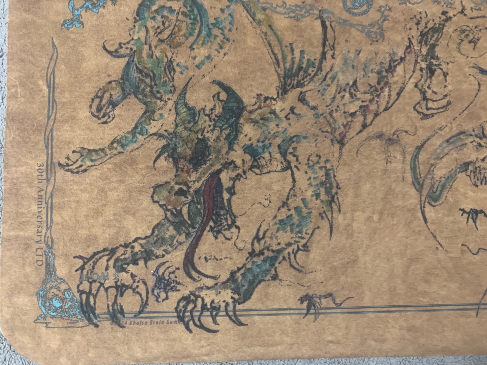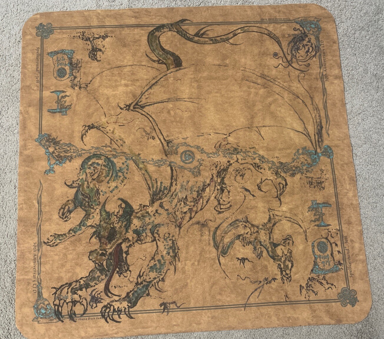 Up for sale is the 30th Anniversary LIMITED EDITION JEFF SPELLGROUND 2-Player Playmat made out of V8x fabric material by Khalsa Brain Games the original CCG playmat! This is a replica of Jeff Brain's own personal playmat that he would take to tournaments and conventions. Jeff, being an artist, couldn't help but adorn his mat with images and color. So in the course of his personal mat's travels, another industry was spawned...doodling and signing of SpellGround mats from industry icons.
