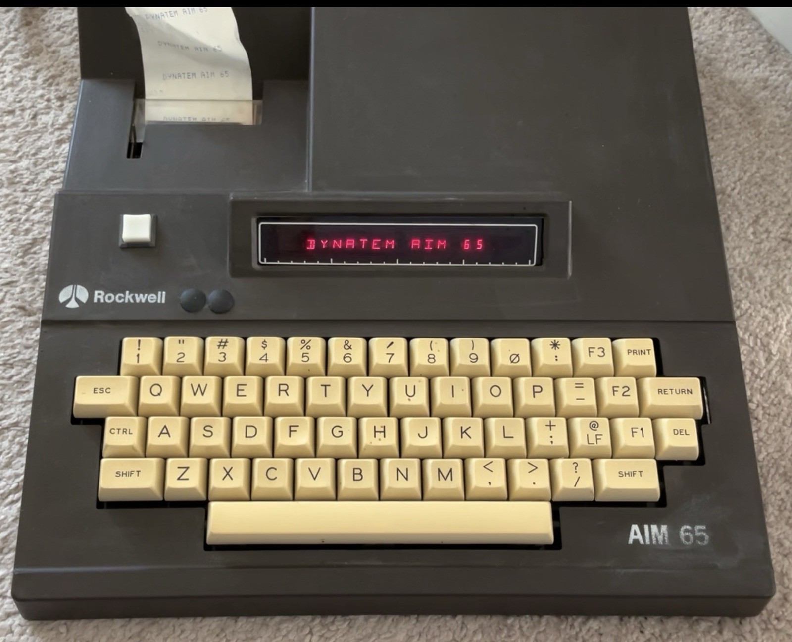 This is a Rockwell / Dynatem AIM65 manufactured in 1986. It powers on and accepts keyboard commands, and the printer works across all columns of the paper. I do not know how to use the machine well enough to do further testing.