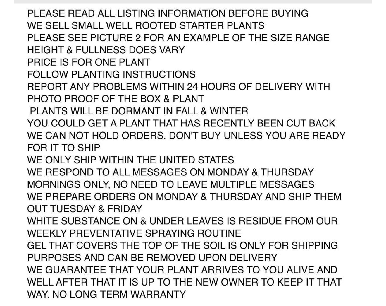 WARNING: Always retrieve packages from the mail as soon as it is delivered. If left in a mailbox during freezing temps it will kill the plant(s). If left in mailbox during extreme heat it will kill the plant(s), It is the buyers responsibility to track the package and get it as soon as it is delivered. Tracking information automatically uploads so buyer is able to see exactly what day there package will arrive. So buyers please make sure that you are going to be able to get your package as soon as it arrives. Seller not responsible for plants that are dead due to being left out in the mailbox in extreme heat or cold.