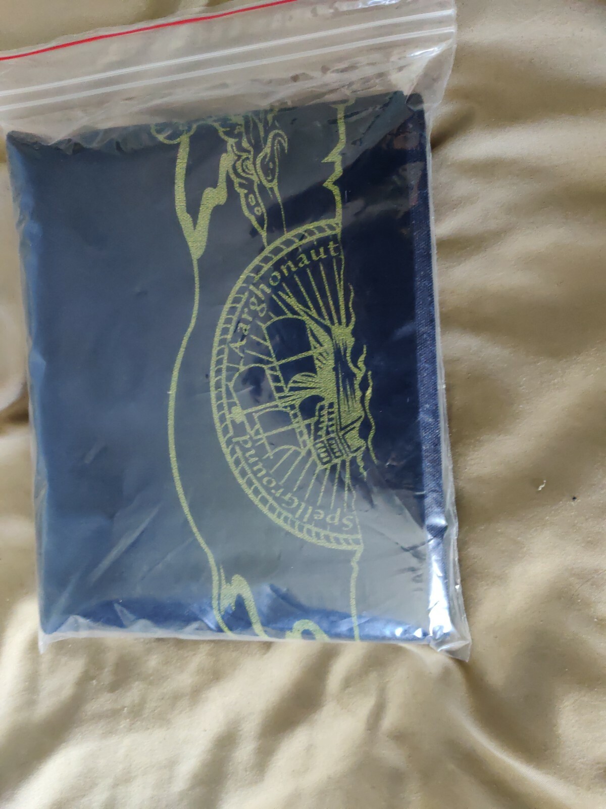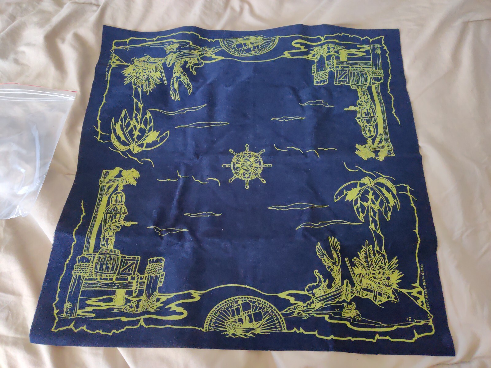 Spellground Aarghonaut TEST PRINT ONE OF A KIND LTD 2 Player Playmat. This particular mat was never released to the public. Khalsa Brain Games tested this fabric by making an aarghonaut in this scheme, and decided against mass release due to the way the fabric cut when mass produced. This is a one of a kind piece, a midnight blue fabric with yellow ink.