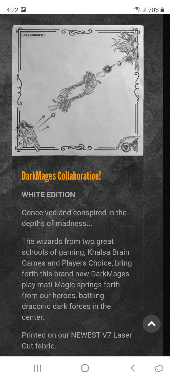 The wizards from two great schools of gaming, Khalsa Brain Games and Players Choice, bring forth this brand new DarkMages play mat! Magic springs forth from our heroes, battling draconic dark forces in the center.