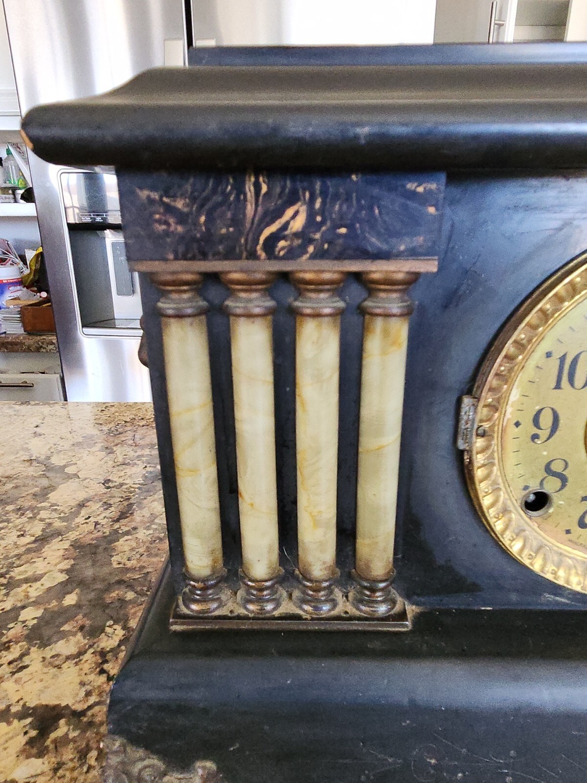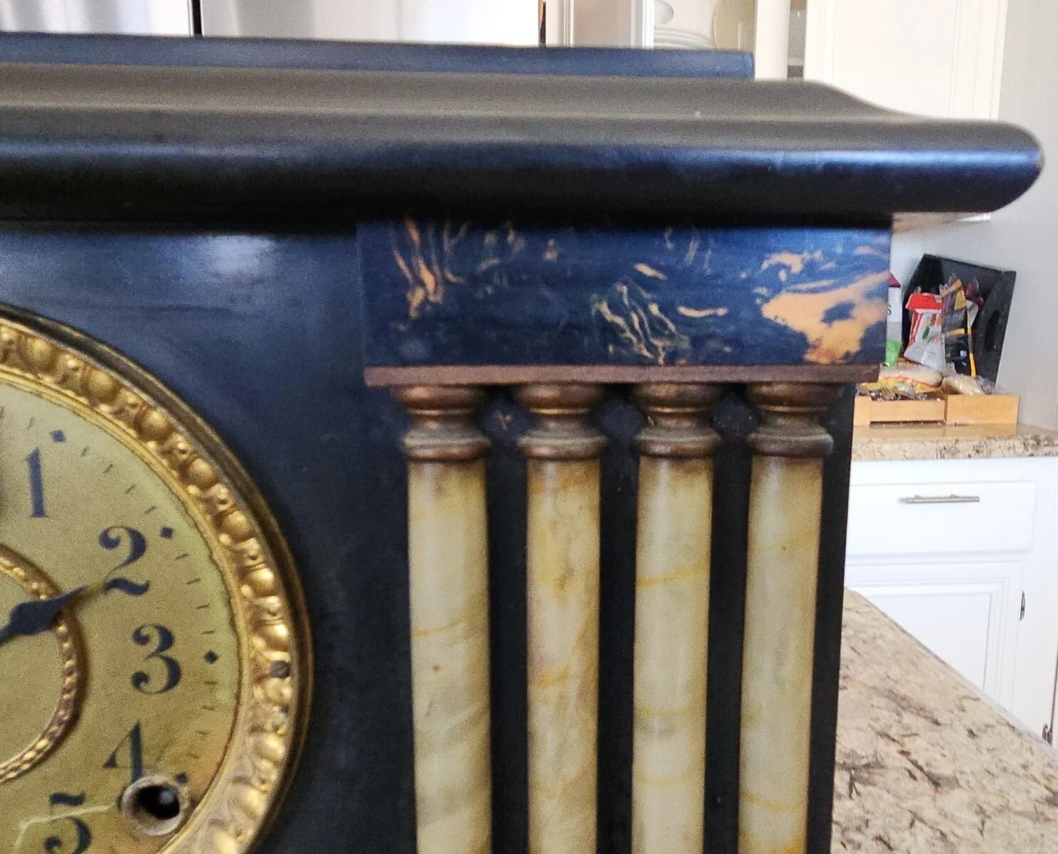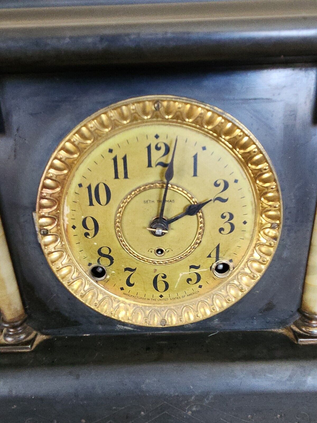 Antique Seth Thomas Adamantine Mantle Clock with Key Works. I think the back wooden plate was replaced. The keys are missing. Sold as is.