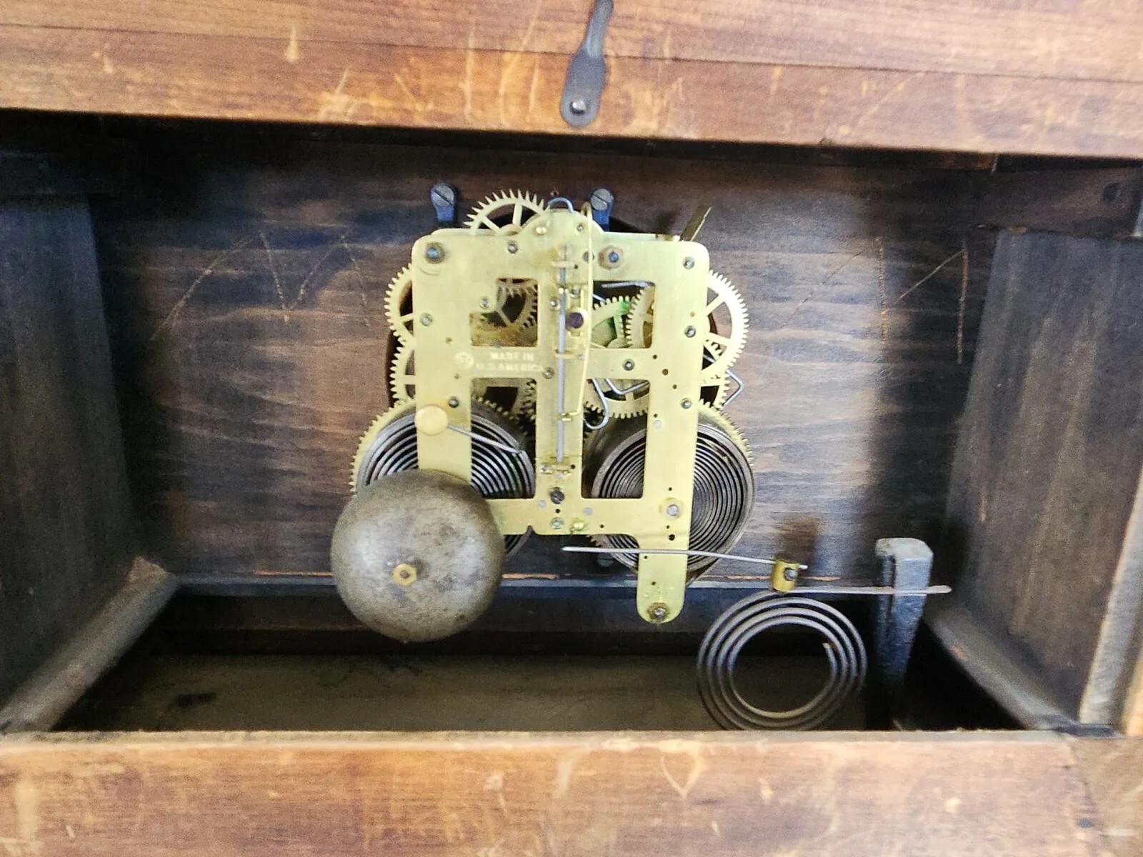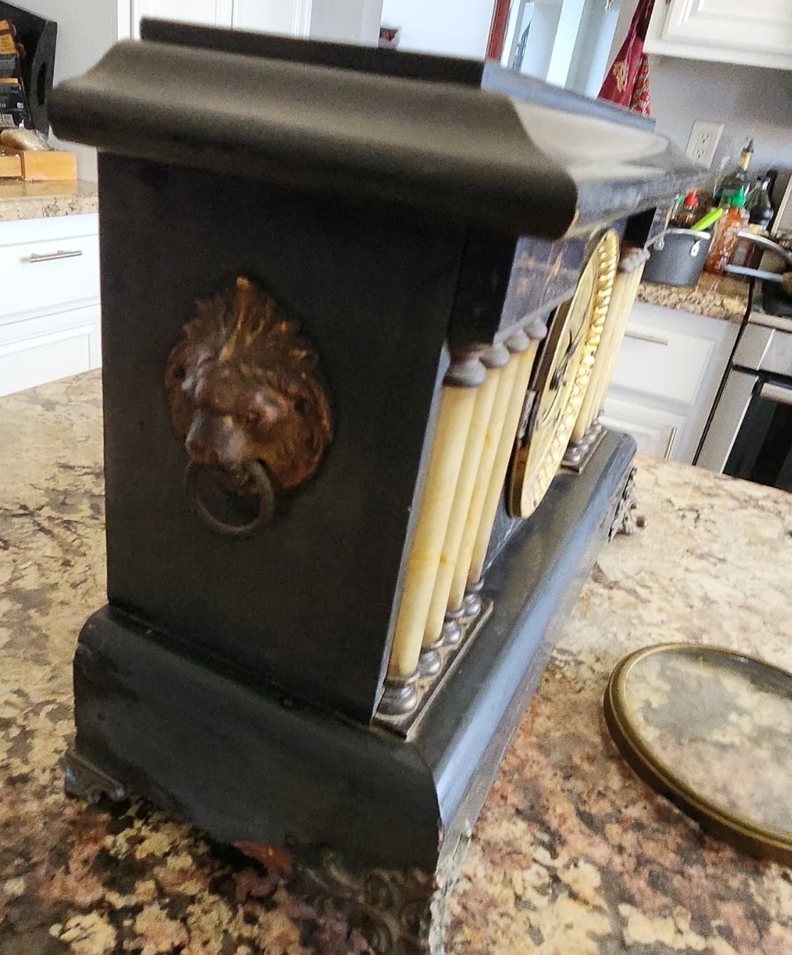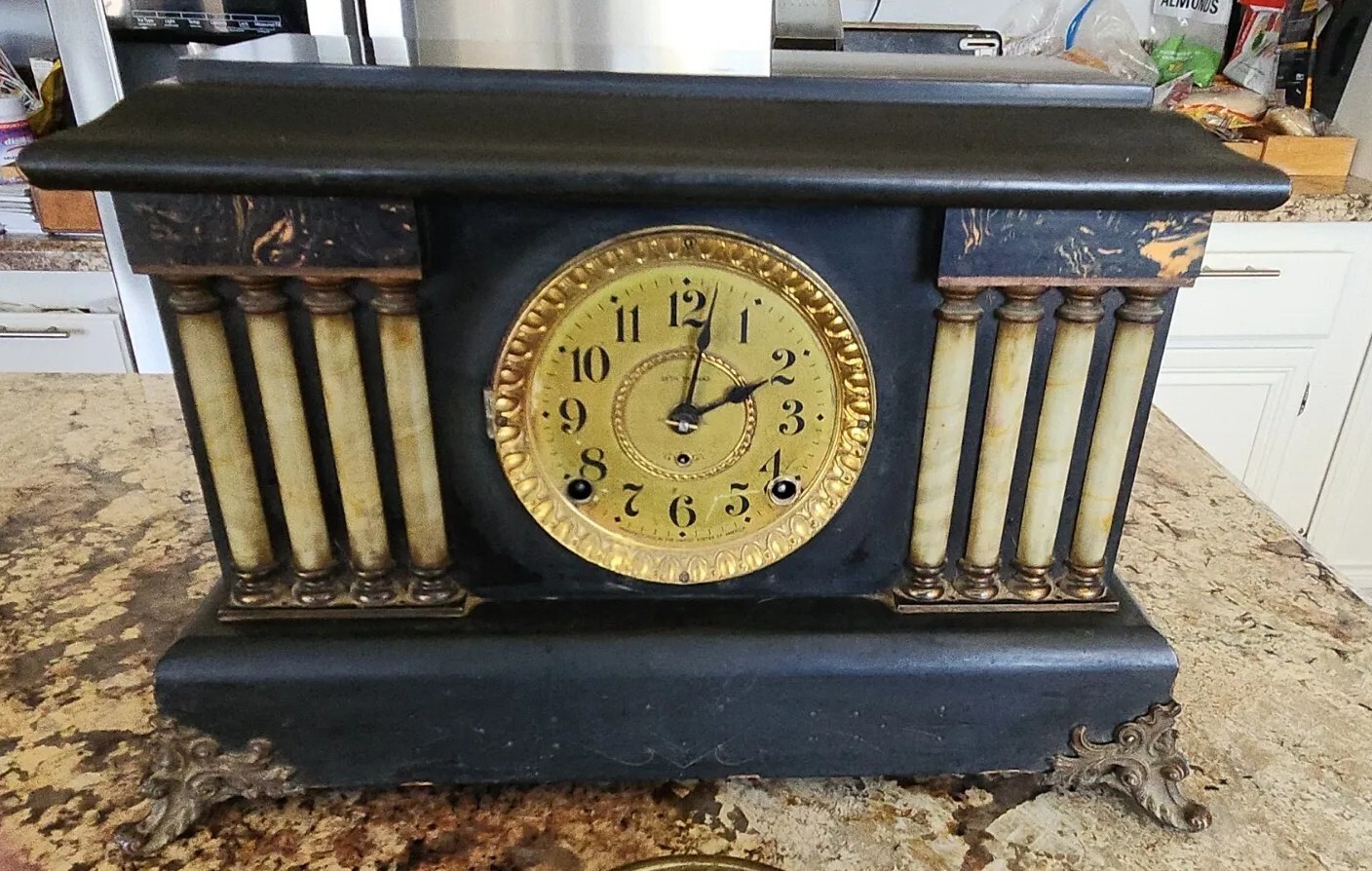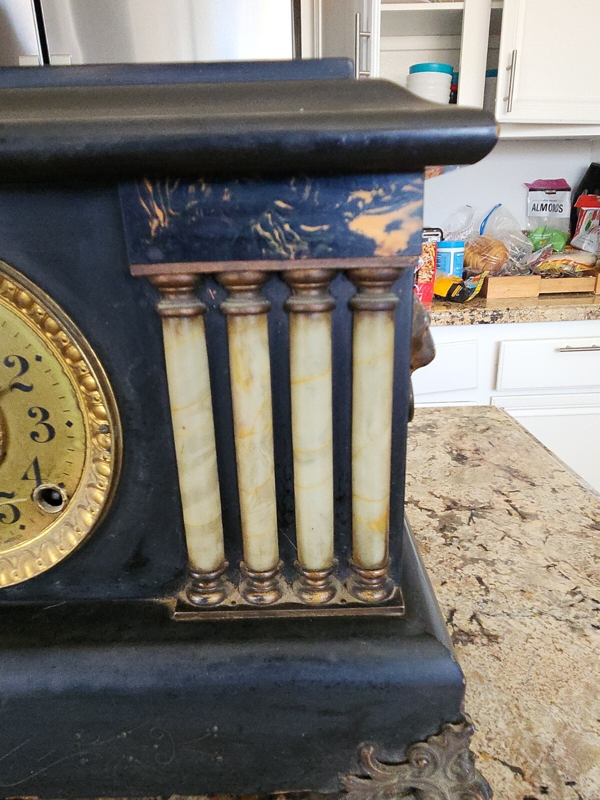 Antique Seth Thomas Adamantine Mantle Clock with Key Works. I think the back wooden plate was replaced. The keys are missing. Sold as is.