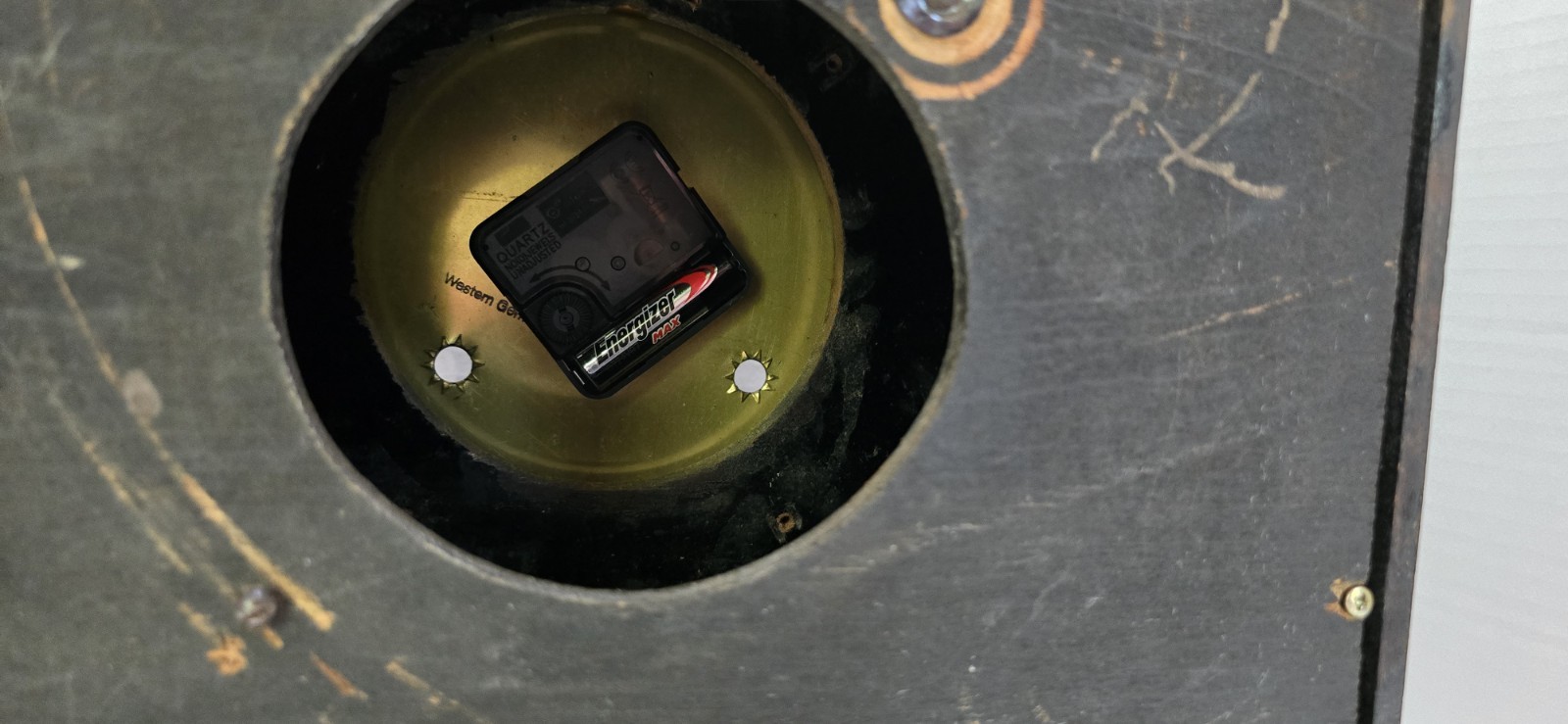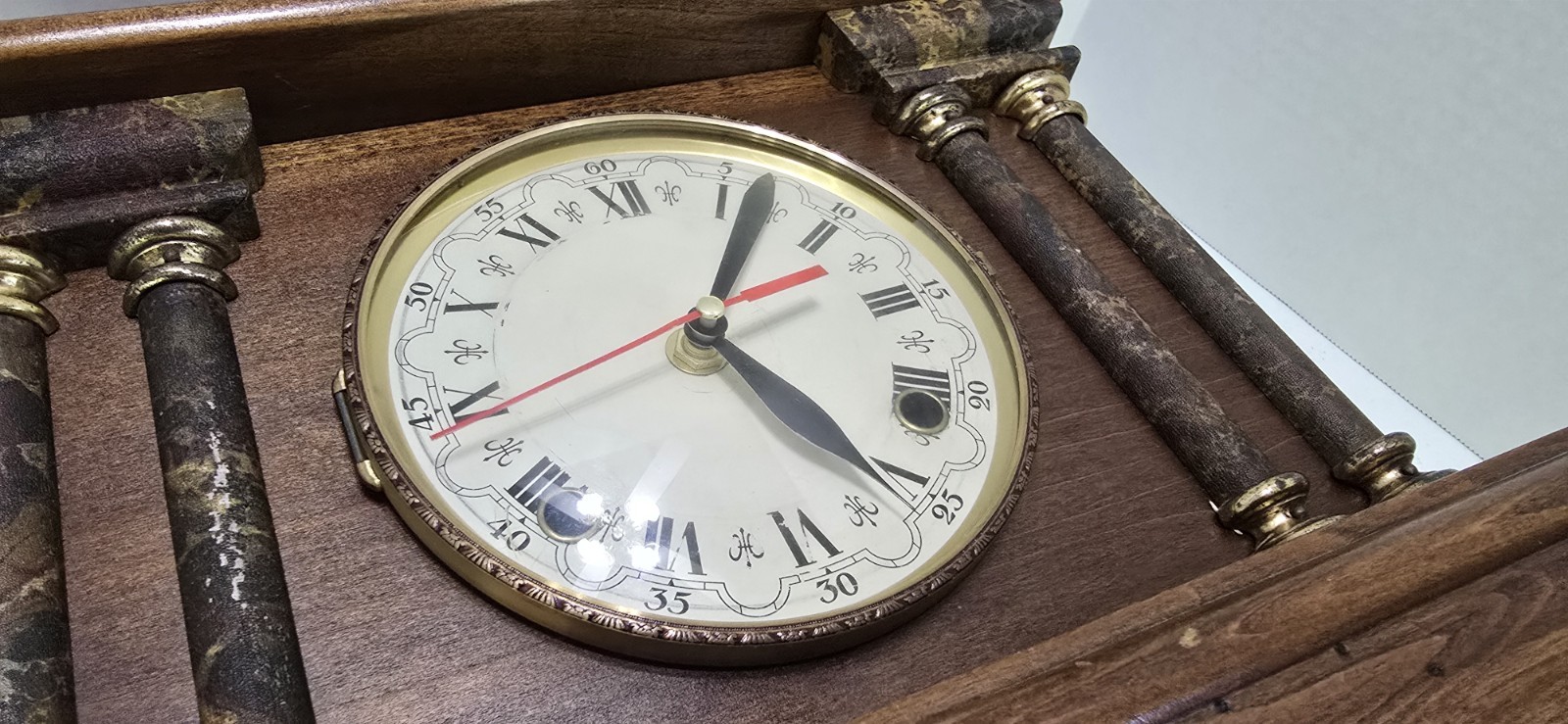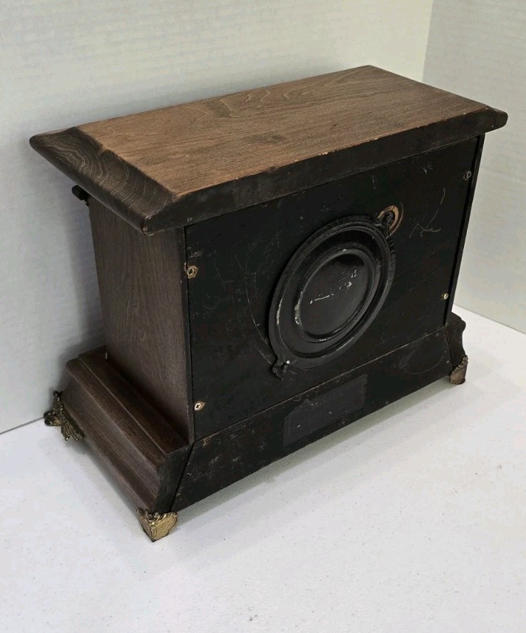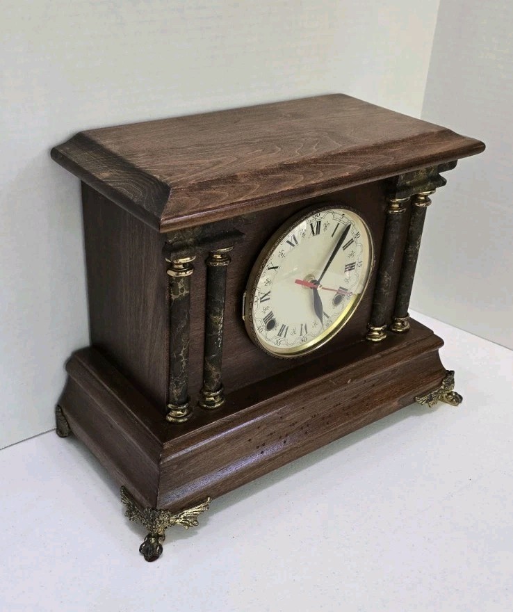 This antique Seth Thomas mantel clock features a beautiful walnut finish. The clock is made of wood, brass, glass, and plastic, and has been modified to a quartz battery movement. The clock is from the 1900s, and has been restored and converted to battery power. Runs on 1 AA battery which is included.