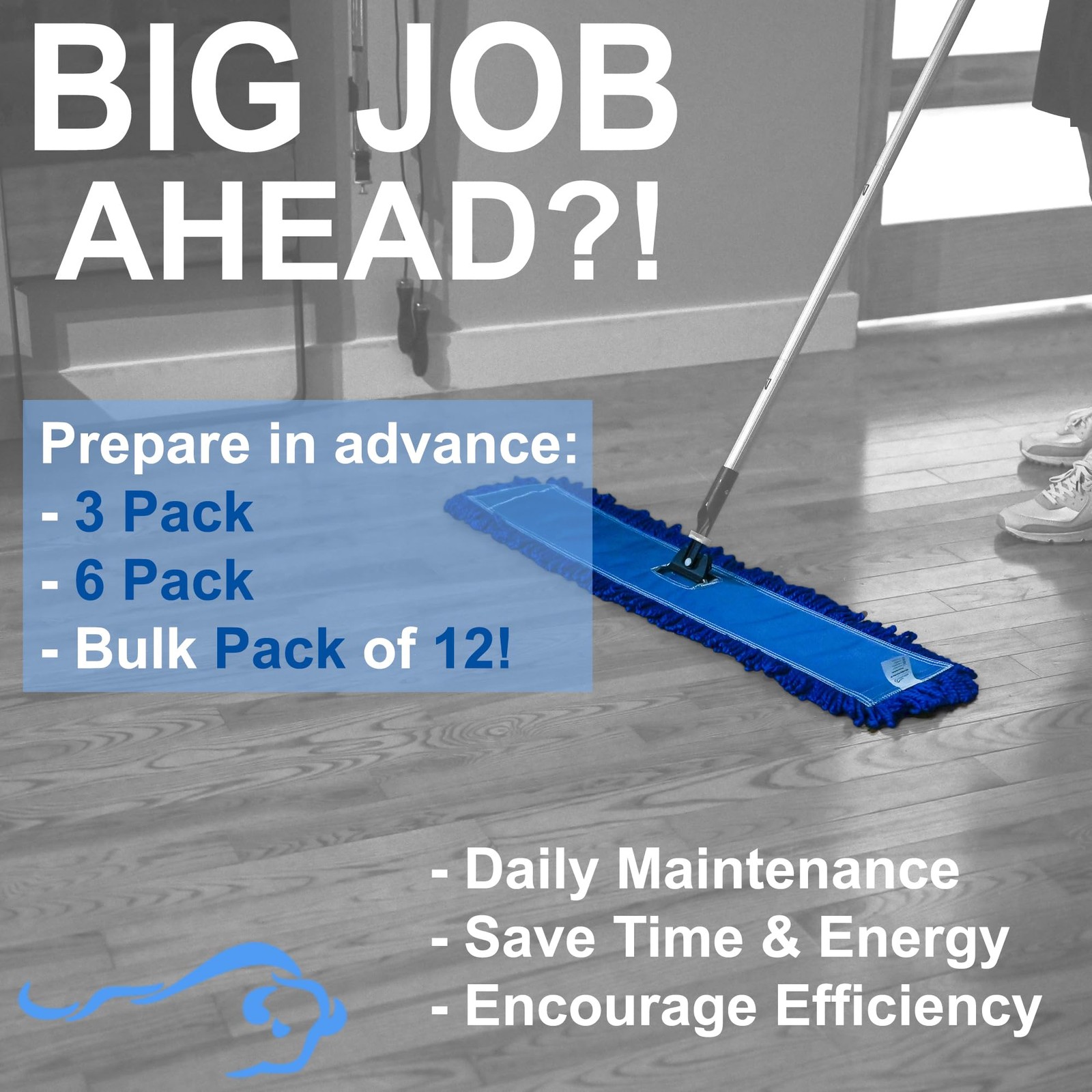 BULK & PACK SIZES – Offering sizes of 1 dust mop head, dust mop 3 pack, dust mop 6 pack, and a bulk case pack of 12 dust mop heads, allowing use for multiple locations, for segregated purposes, or to easily store and keep on hand for homes, small businesses, and other larger facilities. Bulk janitorial supplies are meeting the needs for larger companies, schools, offices, kitchens, food pantries, and other larger facilities that have a higher demand for cleaning supplies.