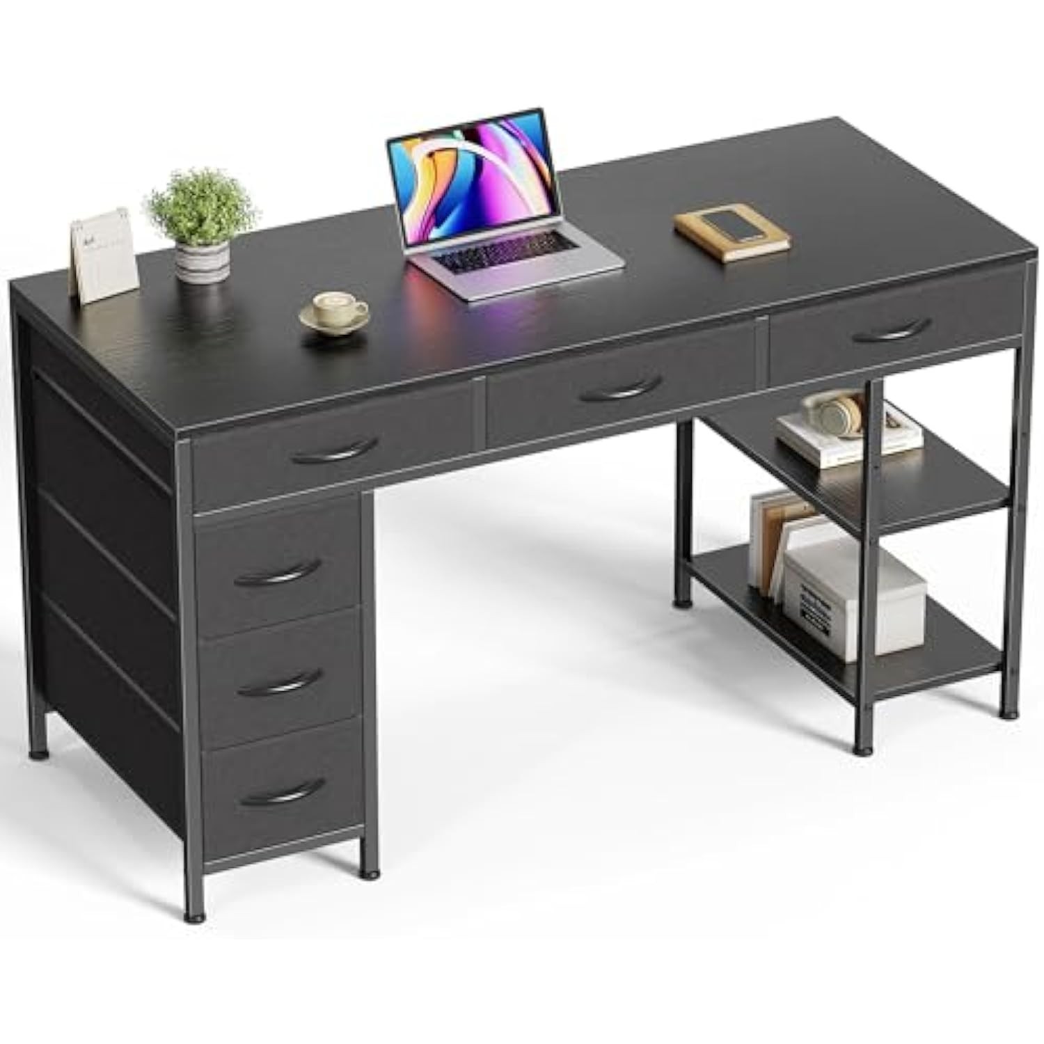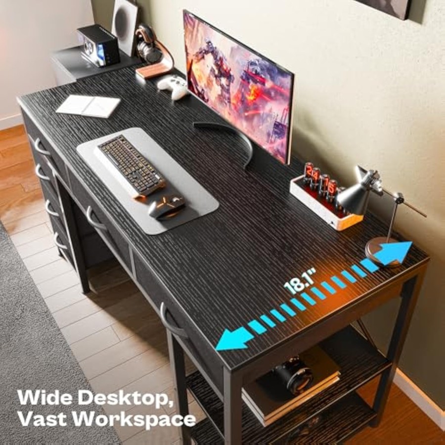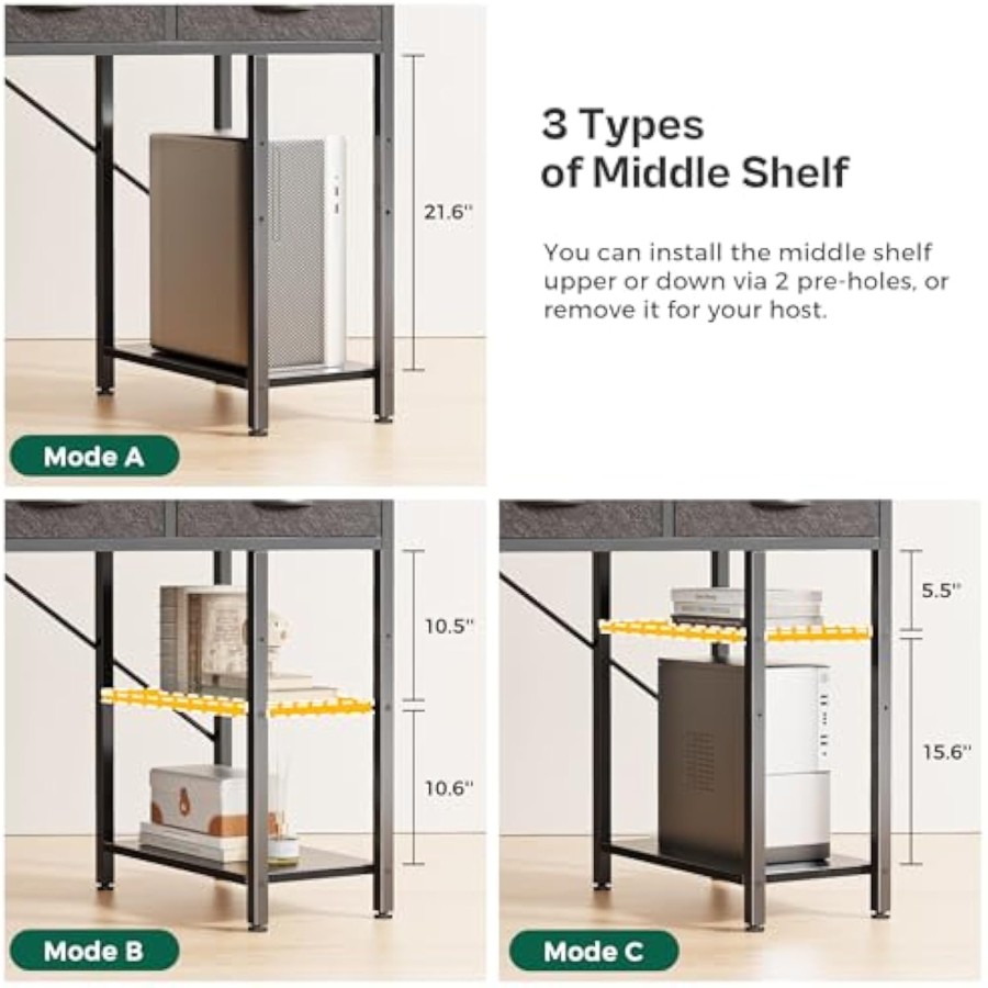 6 Drawers Computer DeskWith 6 spacious fabric drawers, this home office desk is perfect for keeping your home office or gaming items organized. Drawer Size: 14.3 x 17.7 x 3.7 Inch; 8.5 x 17.7 x 6.8 Inch. Get a designated and divided spot for everything from books and files to gadgets. Whether you're working from home or gearing up for a gaming session, enjoy the benefits of a tidy, efficient space Reversible Design & Adjustable ShelfYou can choose to install the fabric drawers on either the left or right side, making this writing desk adaptable to your space. With 2-level pre-drilled holes for the middle shelf, you can adjust its height to hold tall or short items or remove it entirely to accommodate your host. This flexibility allows you to create a work space that’s perfect for your needs Multiple UsesThis desk with shelves isn't just for work or play, it's multi-functional and can serve as a computer desk with storage, gamer desk, or even a makeup vanity. Need more storage in your home office? Done. Want a sleek, organized gaming room? No problem. Just add a mirror, and it transforms into a stylish vanity desk. This balck desk is a one-stop solution for multiple needs in your home Solid ConstructionCrafted with solid particleboard, sturdy metal frame, and durable fabric drawers, this studio desk is built to last. The robust construction ensures stability, even during intense gaming sessions or heavy workload days. The sturdy strut behind the desk provides additional support, so you can trust it to hold up over time Easy AssemblyDon't stress about setting up your new bedroom desk. With the provided tools, clearly numbered components, and straightforward instructions, you'll have your gaming computer desk assembled within 45 minutes. Adjustable feet under the desk keep balance and protect the floor from scratches. Thickness of P2 Particle Board: 12mm; Thickness of Steel Tube: 20mm..