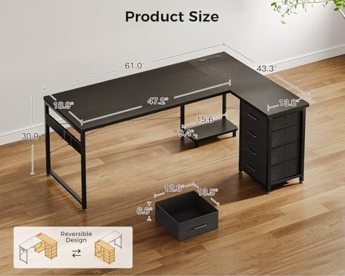 【Optimized Storage Space】Featuring 4 spacious drawers and 2 sturdy iron hooks, this L-shaped desk maximizes organization by effortlessly accommodating documents, stationery, and personal items. Its thoughtful design keeps your workspace uncluttered, while the ample surface area supports your printer, scanner, and more, ensuring everything is conveniently at hand.