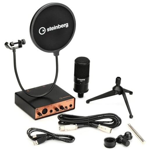 Includes UR12 B interface, condenser microphone ST-M01, mic mount, mic stand legs and stand shaft, mic pop screen, XLR cable, USB Type-B to Type-A cable, Cubase AI, WaveLab Cast and Cubasis LE license 24-bit/192 kHz USB 2.0 audio interface with 2 x 2 analog I/O One Class-A D-PRE mic preamp (which supports +48 V phantom power) and one Hi-Z input "Rugged metal cg for ultimate durability, with two color options" Loopback function for live internet broadcasting