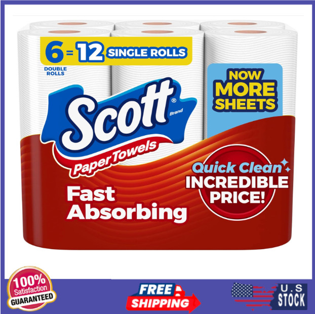 6 Double Rolls of Scott Paper Towels, 108 sheets per roll (6 double rolls = 12 regular rolls); now with MORE sheets!