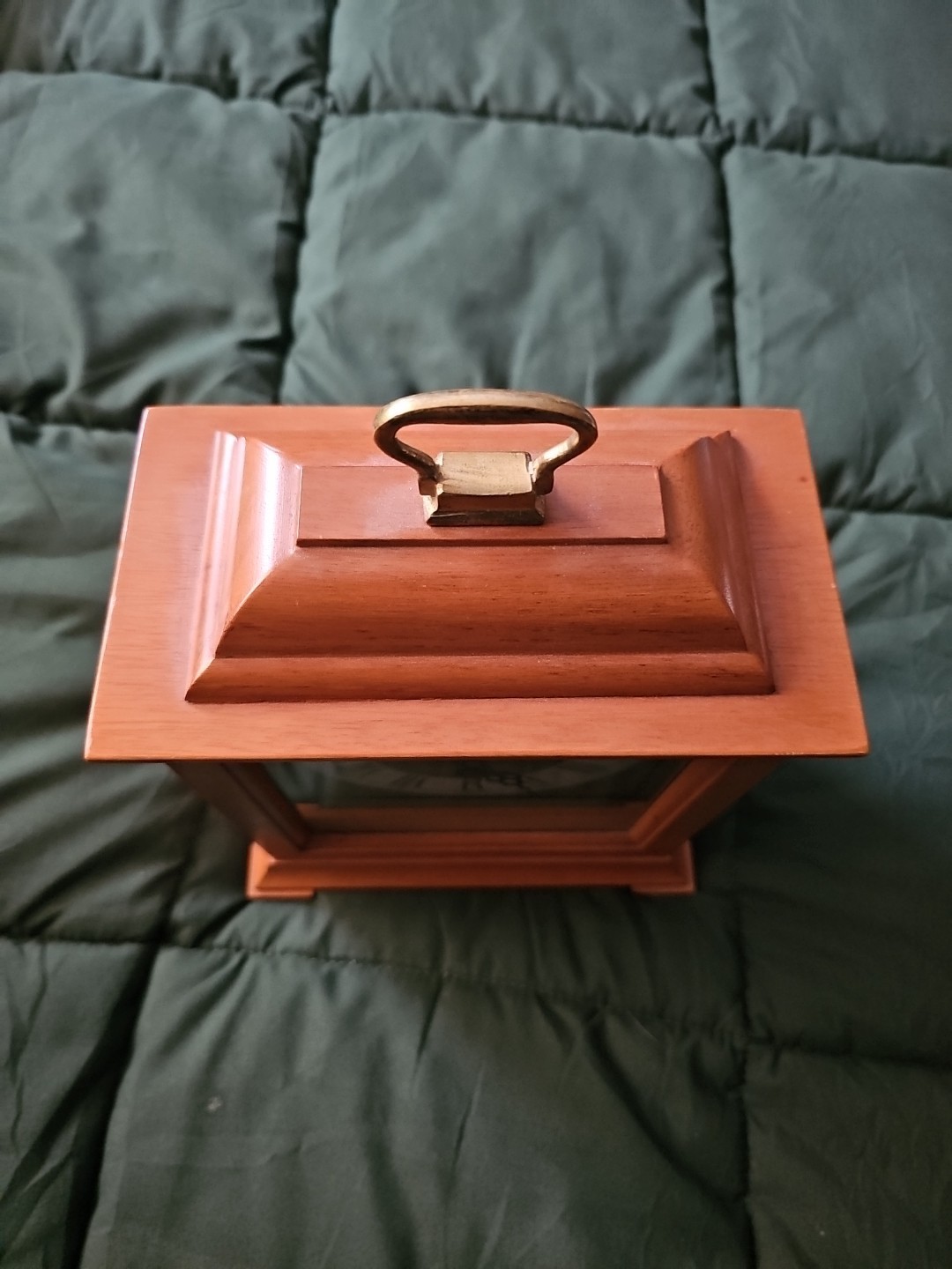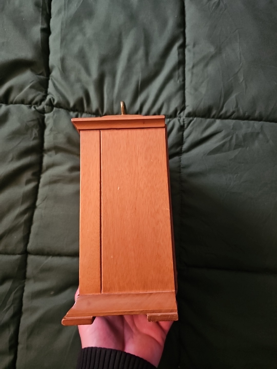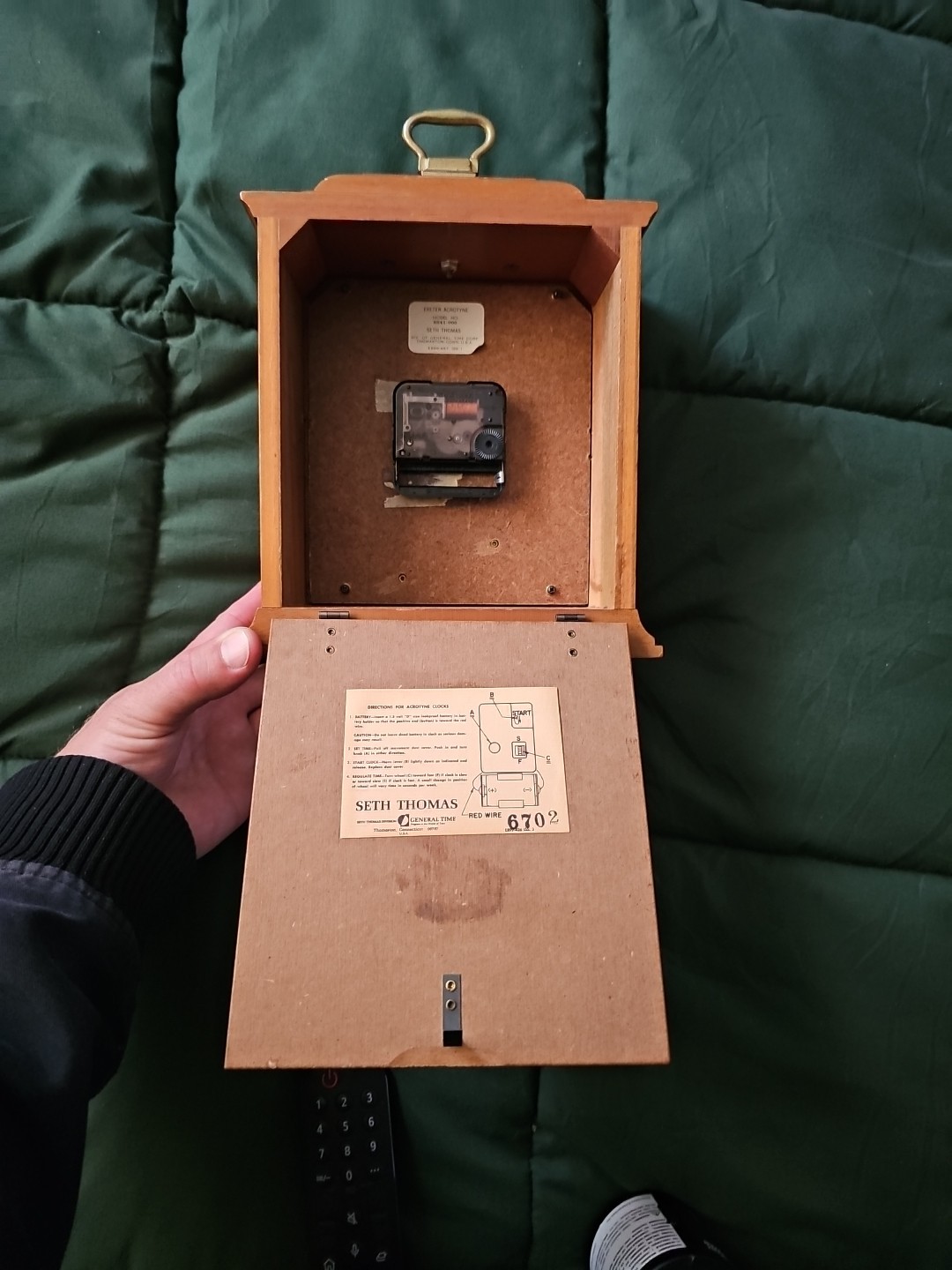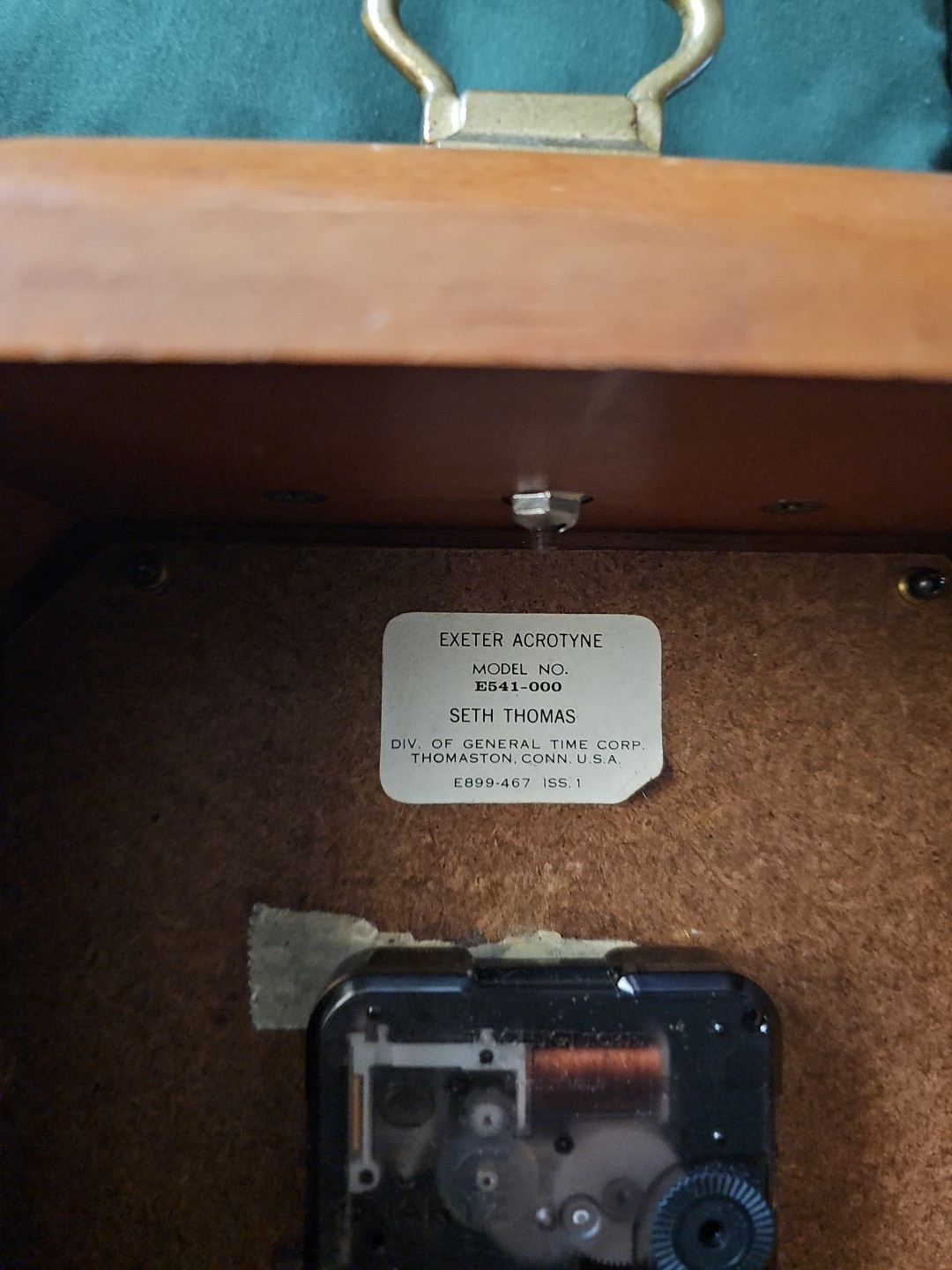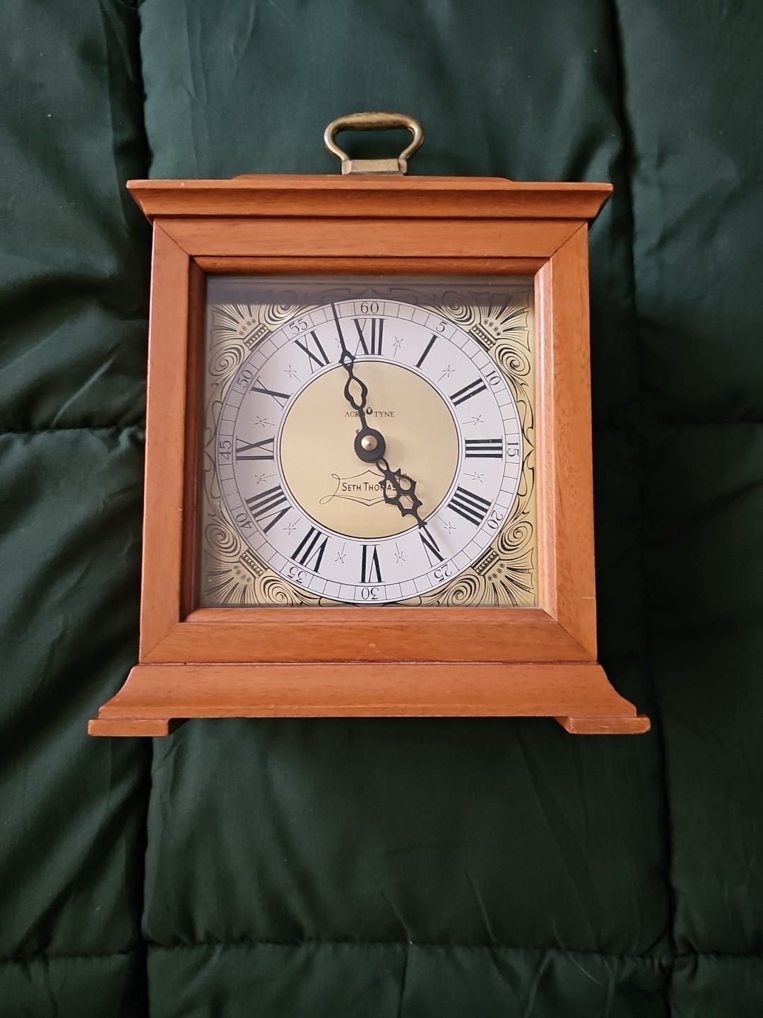 The product is a vintage Seth Thomas desk clock made of mahogany wood with a rectangular shape and analog display. The clock is signed by Seth Thomas and has Roman numerals as the number type. It is an original antique and was made in the United States. The clock is suitable for any room and has a vintage style.
