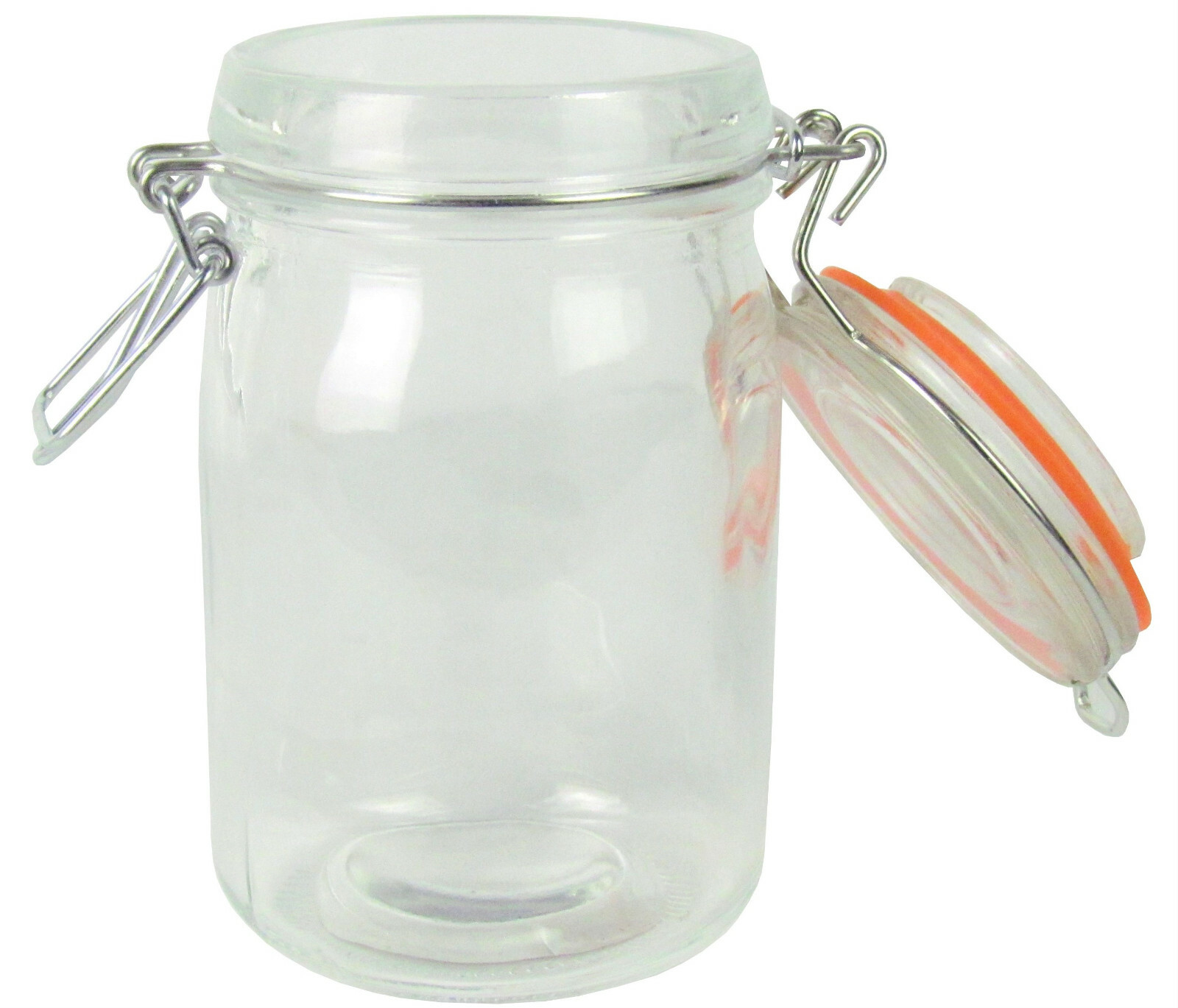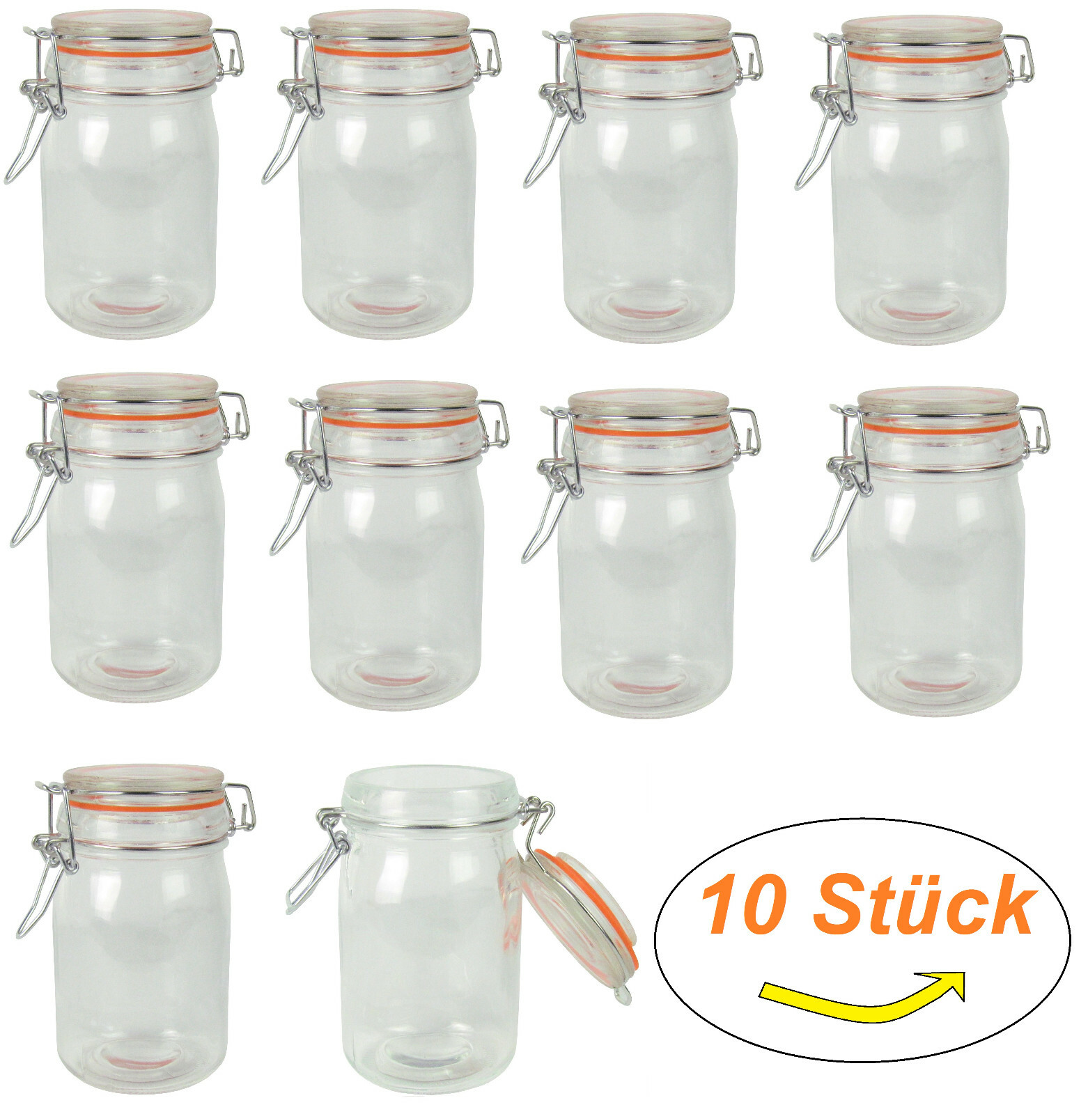 10er Set Einmachgläser mit Bügelverschluss. Diese Einweckgläser, Vorratsgläser, Bügelveschlussgläser, Drahtbügelgläser sind ideal geeignet zum Einkochen oder zum Aufbewahren. Klassiches, bauchförmiges Design mit orangenem Gummiring. Das Glas lässt sich durch den Bügelverschluss ganz bequem öffnen und schließen.
