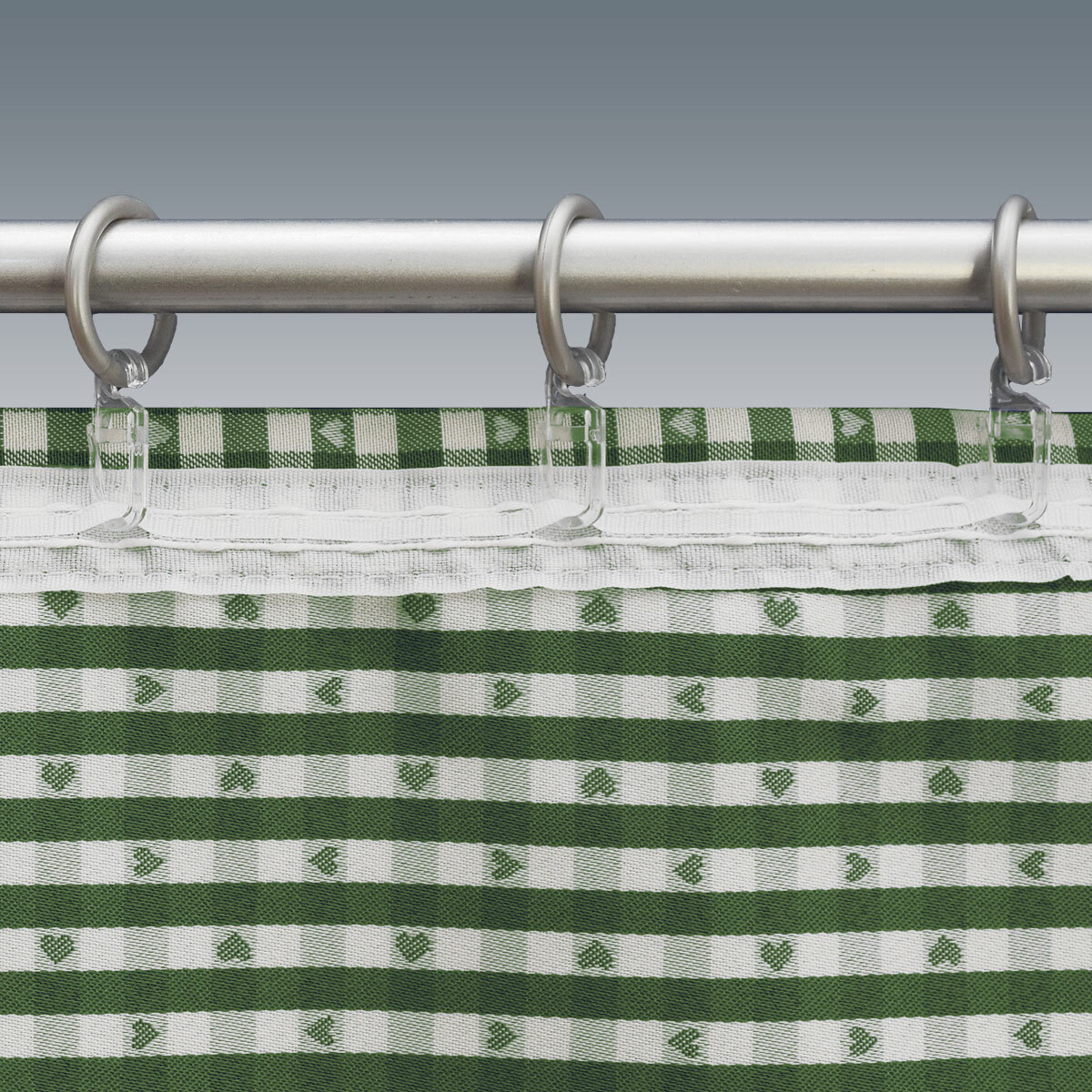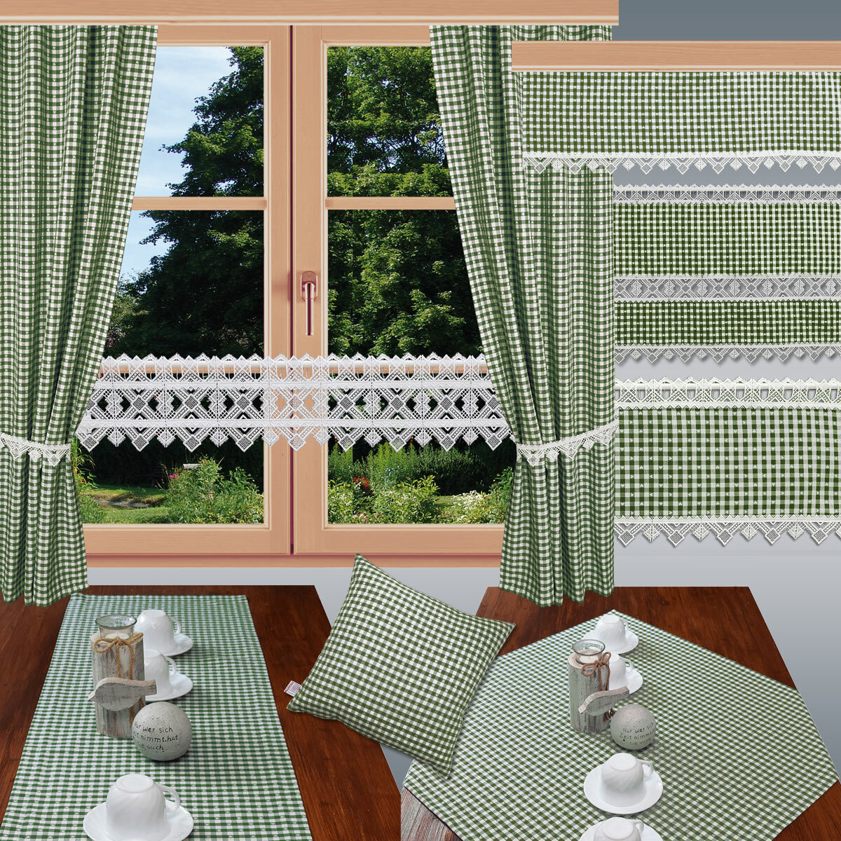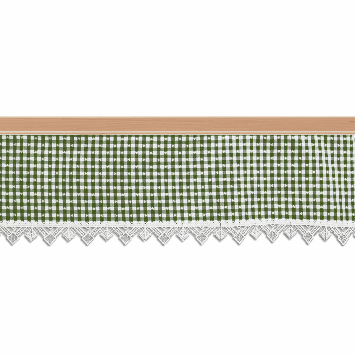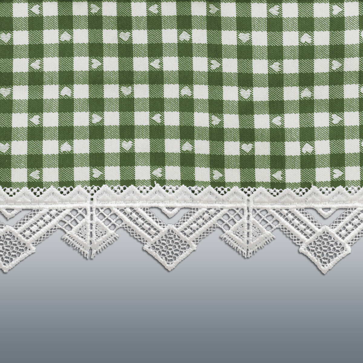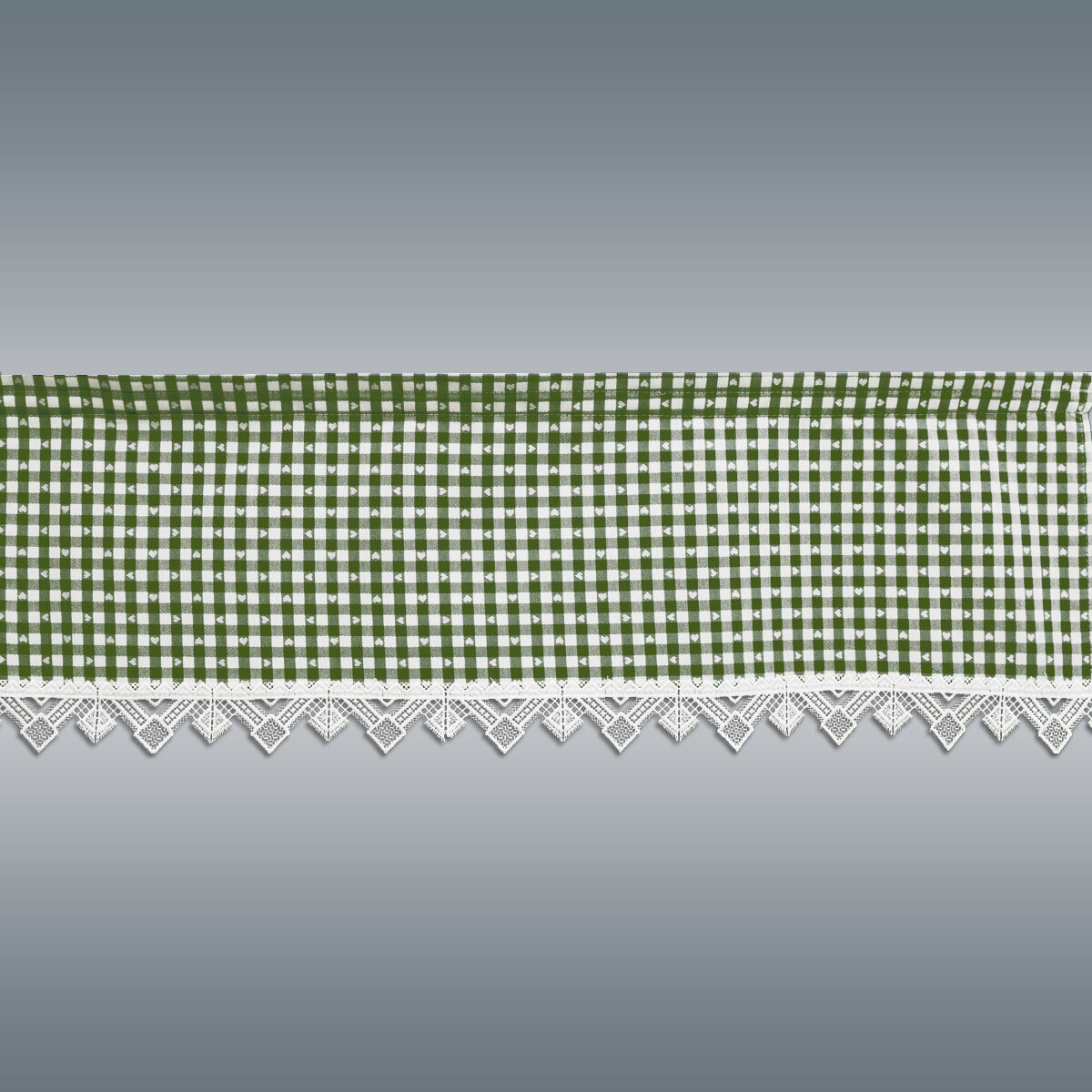 Ein ansprechendes rustikales Muster mit kleinen Herzen auf grün-weiß kariertem Webstoff, das macht diese Gardine zu einem hinreißenden Extra für Ihre Fenster. Ergänzt durch moderne Stickerei aus Plauener Spitze ist dieser Querbehang der Blickfang in jedem Raum.
