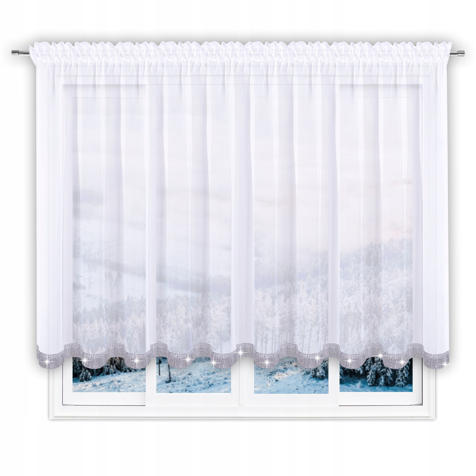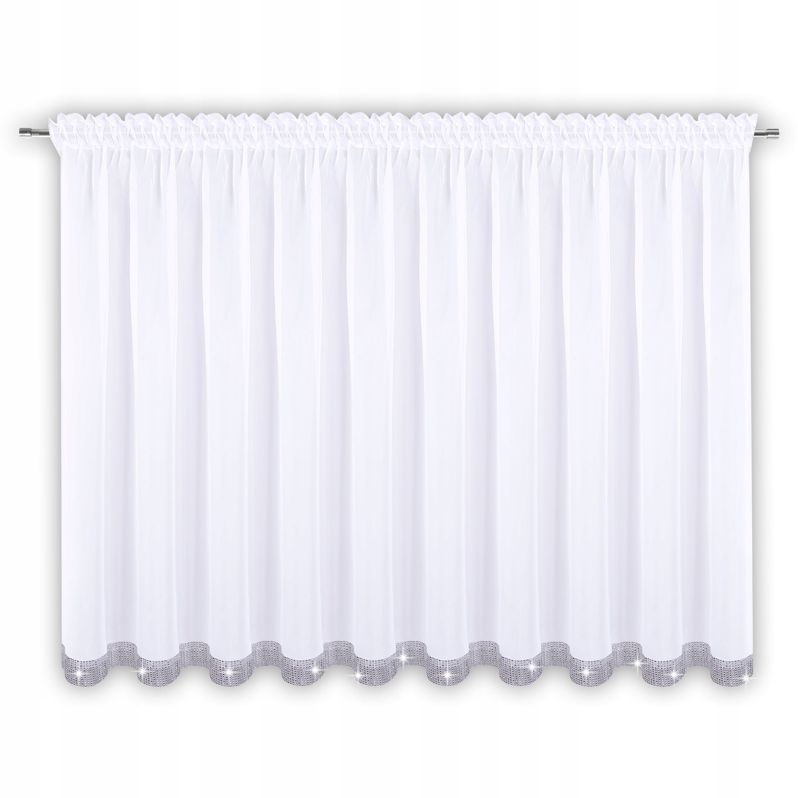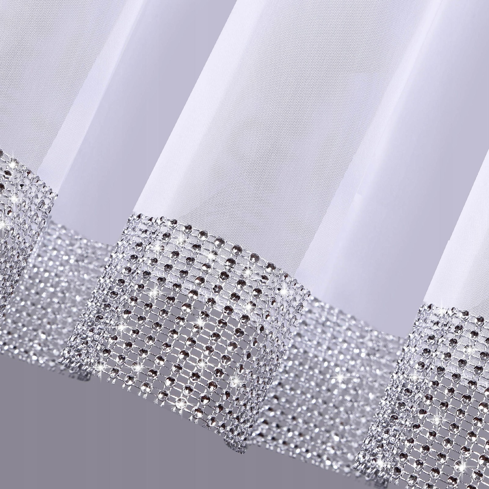 Ein eleganter, kurzer Vorhang aus hochwertigem Voile. Am unteren Rund mit einem Bund mit 6 cm breiten Zirkonen verziert, die sehr schön in der Sonne leuchten und dem Interieur einen luxuriösen Charakter verleihen.
