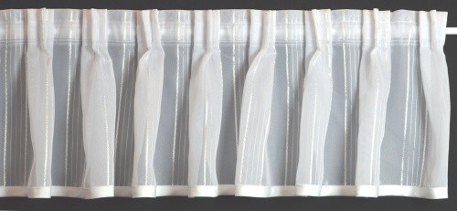 Diese Kurzgardine aus einem weißen Grundmaterial mit dezenten Glanzstreifen wurde rückseitig mit einem Bund ausgestattet, durch das ein dünner Scheibengardinenstab gezogen werden kann. Als unterer Abschluß wurde ein weißes Einfassbund aufgenäht. Durch d