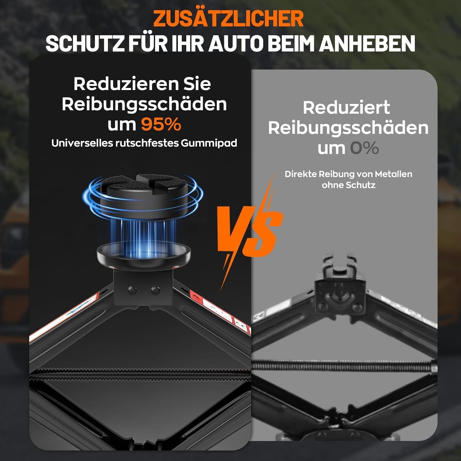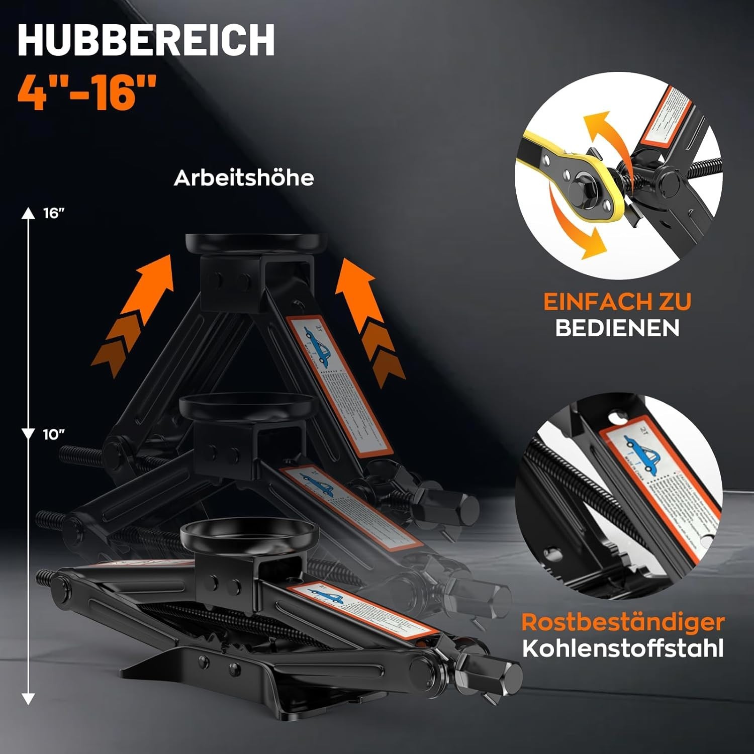 Der robuste Scherenwagenheber mit einer Tragfähigkeit von 2 Tonnen (4400 lbs) bietet einen flexiblen Hubbereich von 10 bis 42 cm. Er ist kompatibel mit Limousinen, SUVs, MPVs und mehr, ideal für Notfälle wie Reifenwechsel oder Fahrzeugreparaturen. gefertigt aus hochfestem kaltgewalzten Stahl mit stabiler Basis und rutschfesten Gummiauflagen, er zuverlässige Sicherheit und Schutz. Das benutzerfreundliche Design umfasst einen Radkreuzschlüssel, Hundschuhe und alles platzsparend verstaut für unterwegs oder in der Garage. Unser exzellenter Kundenservice sorgt für Ihre Zufriedenheit – zögern Sie nicht, uns bei Fragen zu kontaktieren.