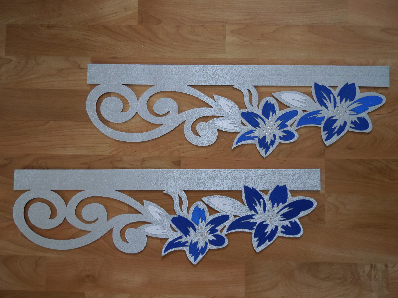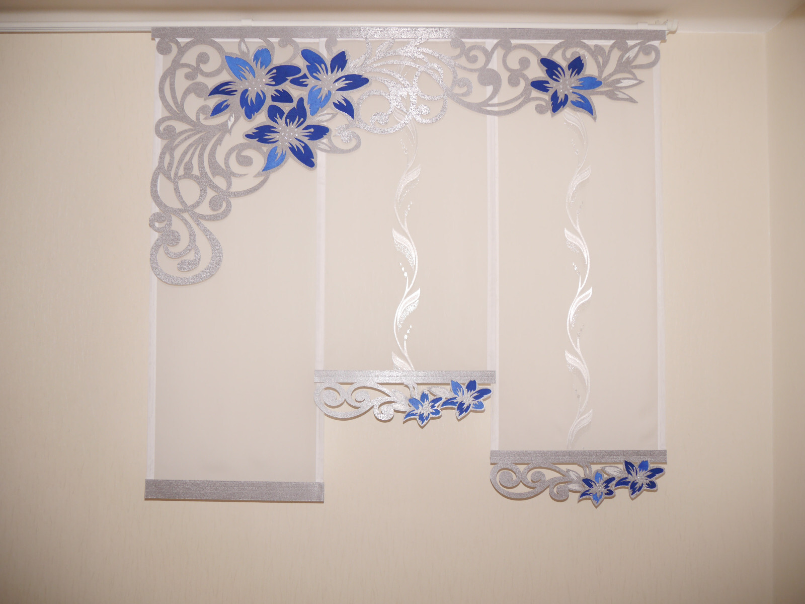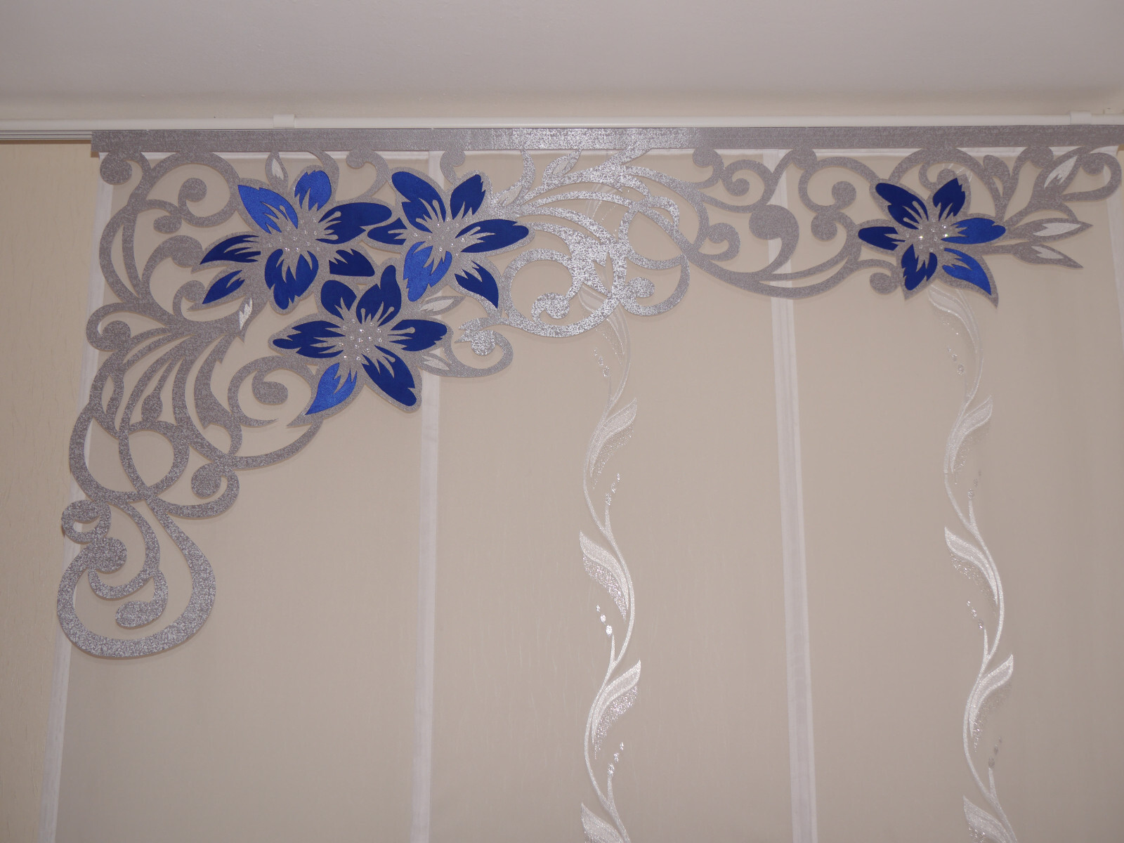 Wunderschöne Gardinen-Set besteht aus 4 Teile. Breite 170cm., Höhe 155cm. Querbehang mit Klettbund befestigt. Schiebevorgänge mit Gardinenbund angenäht. Farbe: silber-grau, weiß, blau.