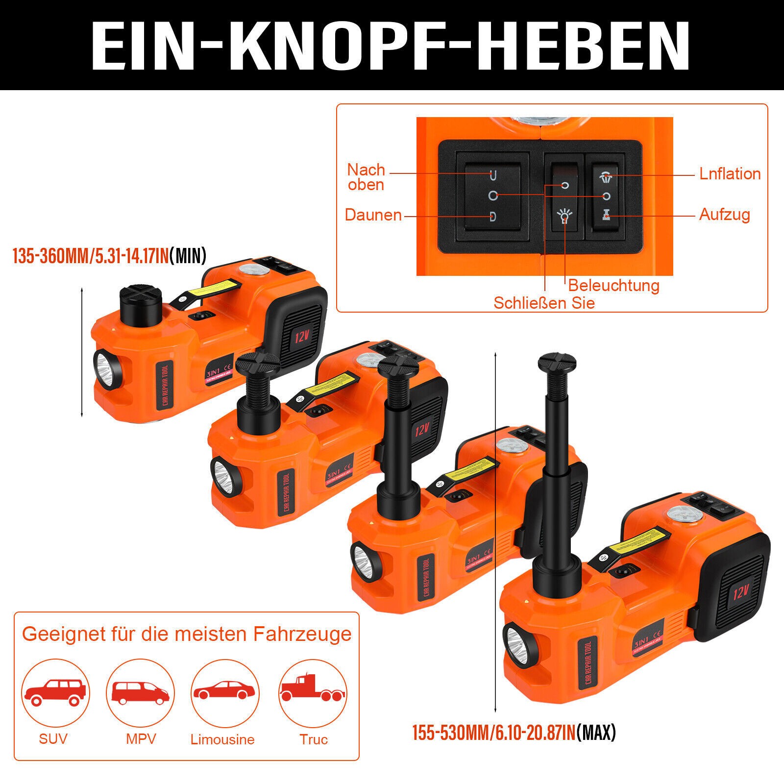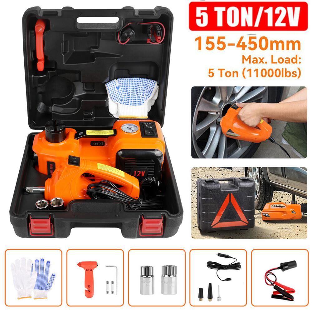 【BUCHSE: IHR BESTER PARTNER】 Die Arbeitskapazität kann bis zu 5,0 T (11023 lb) als Wagenheber erreichen. 6" - 18" Hubhöhe. Druckknopf-Controller mit 3,5 m Stromkabel, wird in die 12-Volt-Steckdose des Autos gesteckt, Niederdruckstange, Set für Sportwagen, Limousine und SUV usw. Ausgestattet mit einem Doppelmotortreiber im Inneren, kann es entweder an eine 12-V-Steckdose oder eine Autobatterie angeschlossen werden. Zwei Steckeroptionen machen es zu einem notwendigen Autoreparaturwerkzeug, wenn es in Notfälle am Straßenrund gerät.