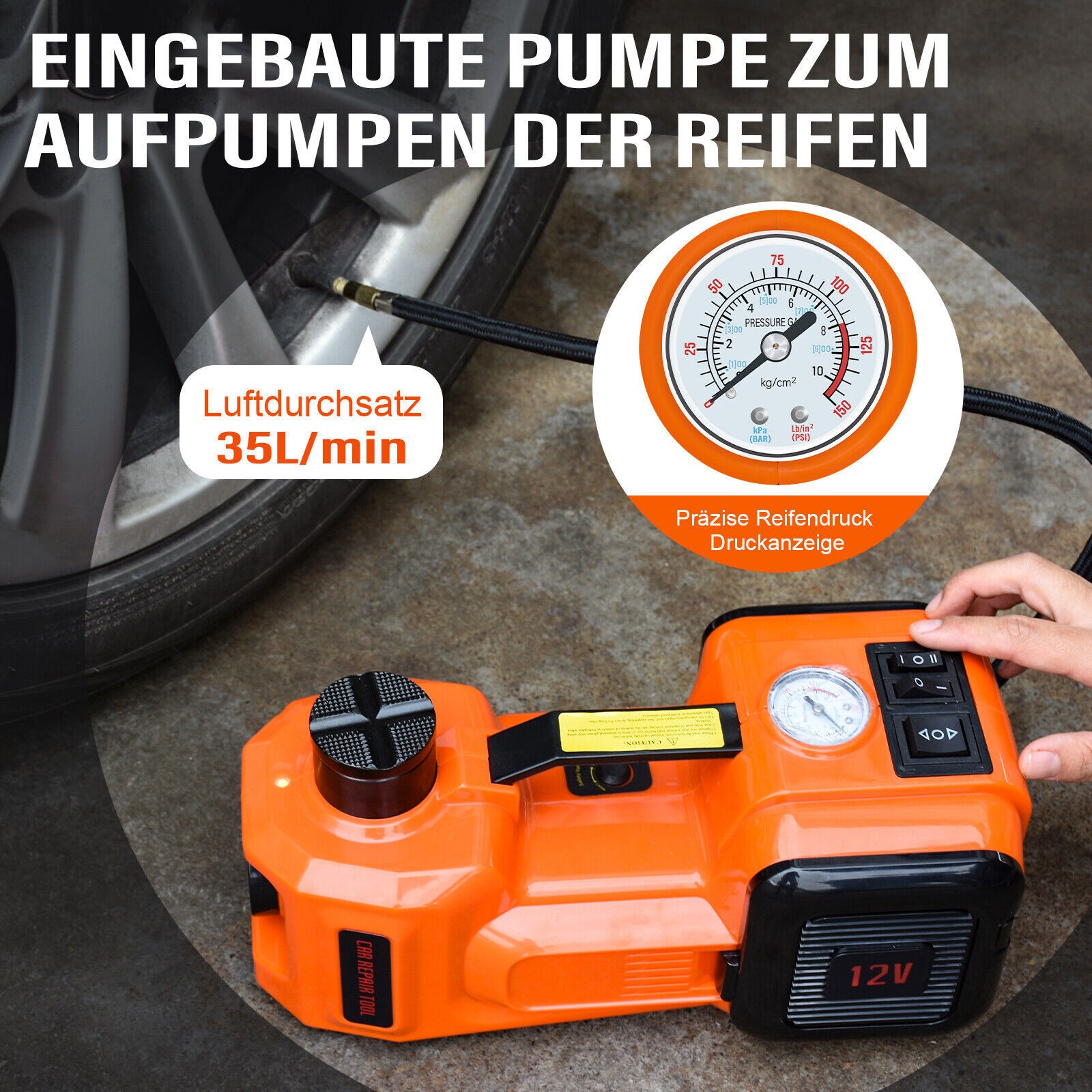Zwei-Wege-Stromversorgung: Elektrische Buchsen haben zwei Stromquellen: Autobatterie oder Zigarettenanzünderanschluss im Auto. Der Reifenpumpen-Inflator wird in den Wagenheber eingebaut. Ausgestattet mit einer Reifendruckanzeige können Sie den Reifendruck ganz einfach überwachen. Der robuste Wagenheber passt fast zu allen Autos, Limousinen, SUVs, MPVs, Pick-ups und Lastwagen. Machen Sie sich keine Sorgen über einen Reifennotfall mitten im Nirgendwo.