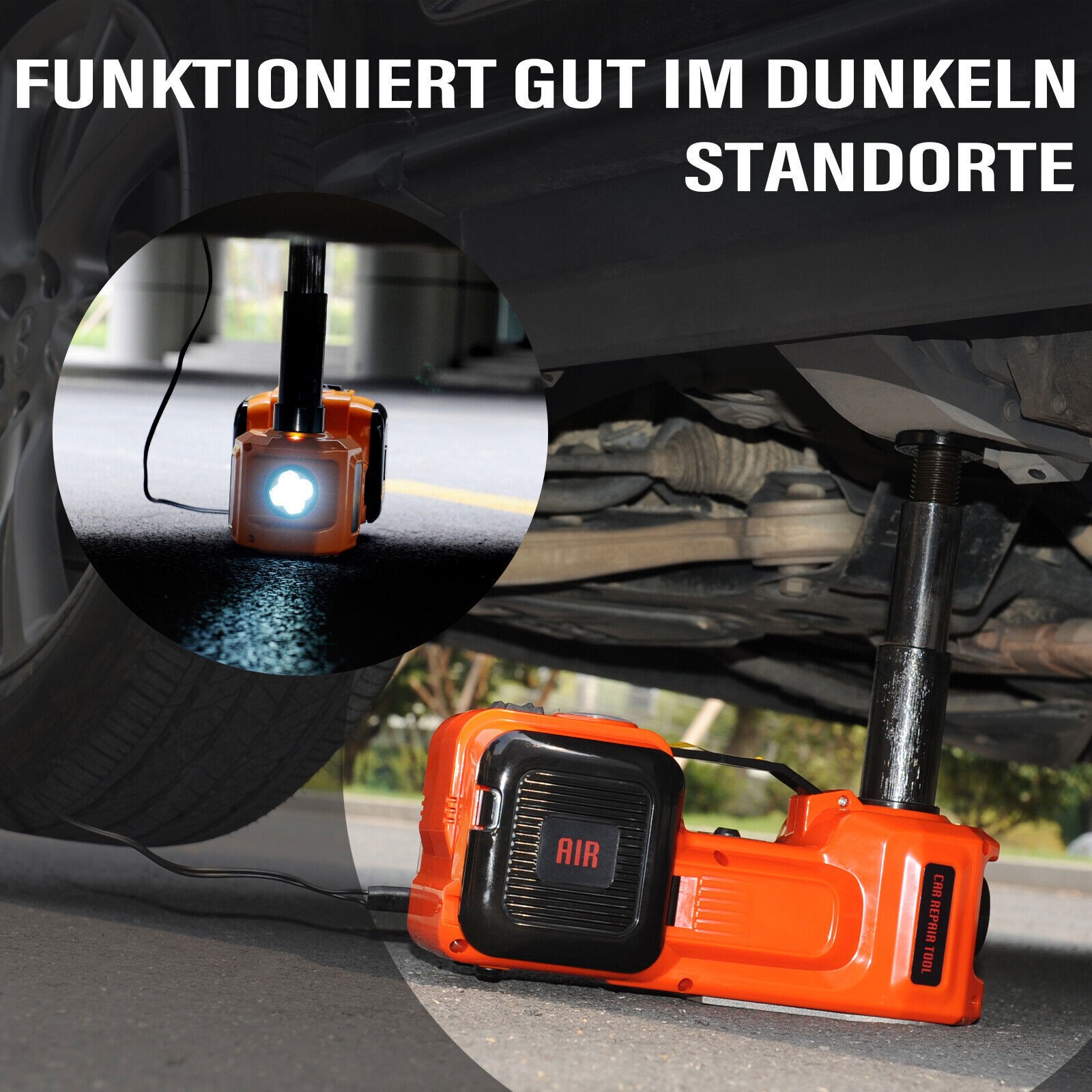 Keine Sicherheitsbedenken: Das Querrillendesign des Stützkopfes kann das aufgebockte Auto effektiv stabilisieren. Das eingebaute LED-Licht ist hell genug, um es nachts zu verwenden. Ein Sicherheitsventil zum manuellen Absenken ist vorhunden, so dass Sie sich keine Sorgen machen müssen, auch wenn der Strom versehentlich unterbrochen wird. Versteckte Werkzeugkästen auf beiden Seiten organisieren aufblasbare Nadeln, Zigarettenanzünderstecker, Sicherungen, Sechskantschlüssel und underes Zubehör in geordneter Weise. Und auch die Tastenbedienung ist mühelos.