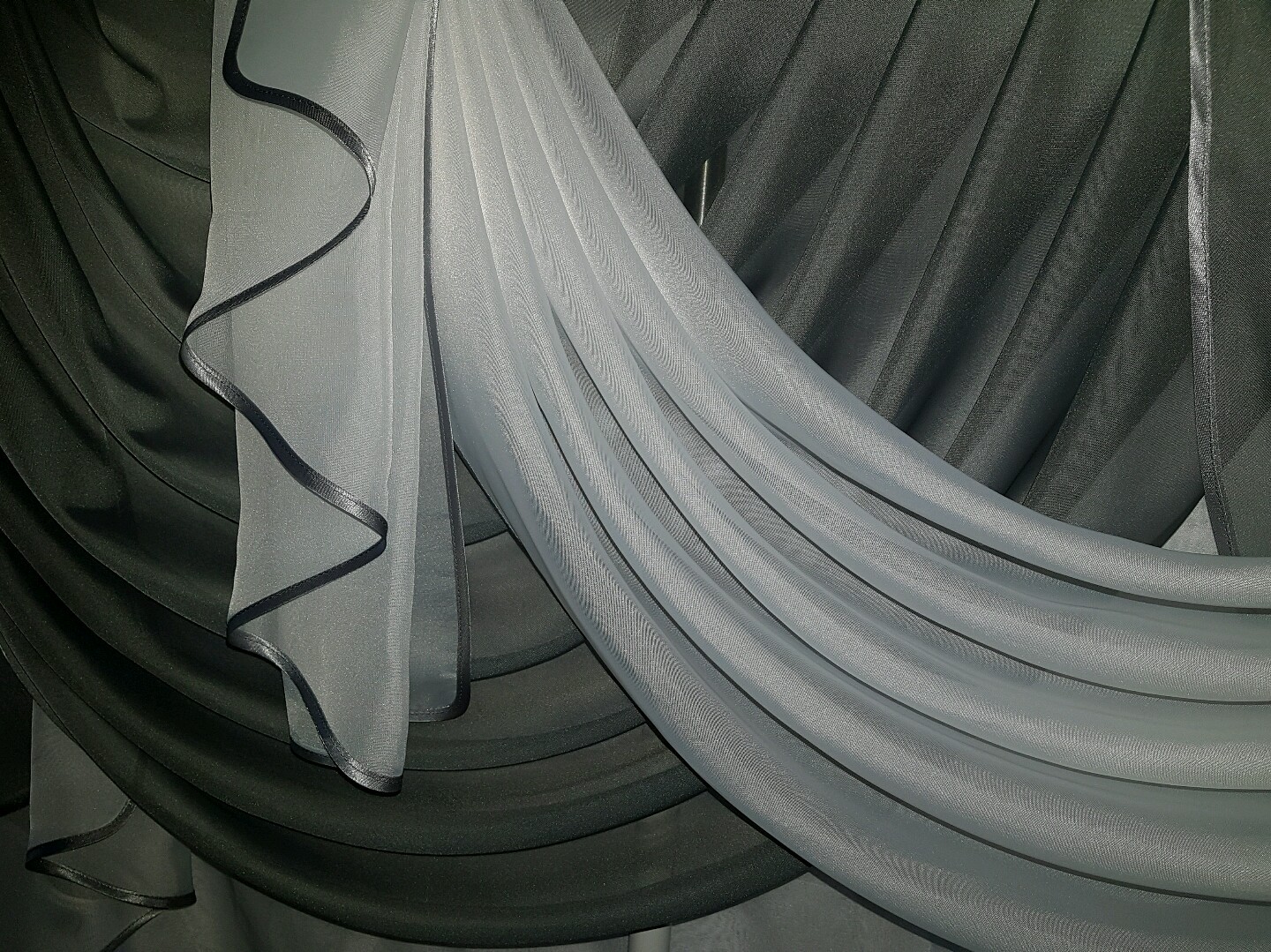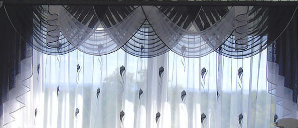 Alle Teile fertig konfektioniert,in Falten gelegt und auf einem Gardinenbund zusammen genäht.