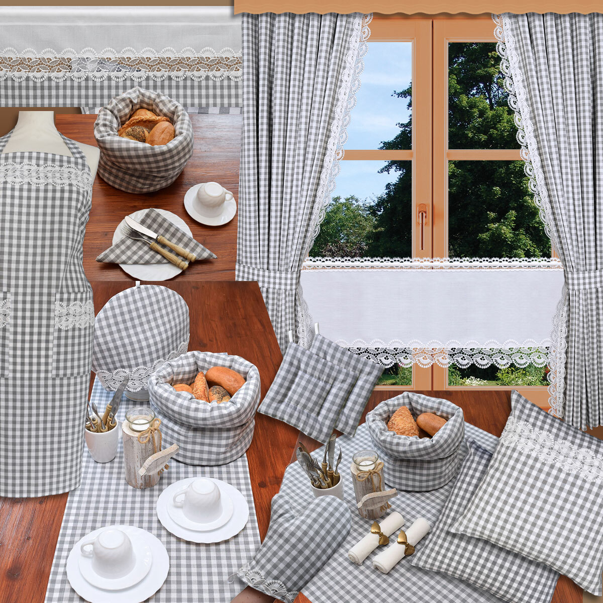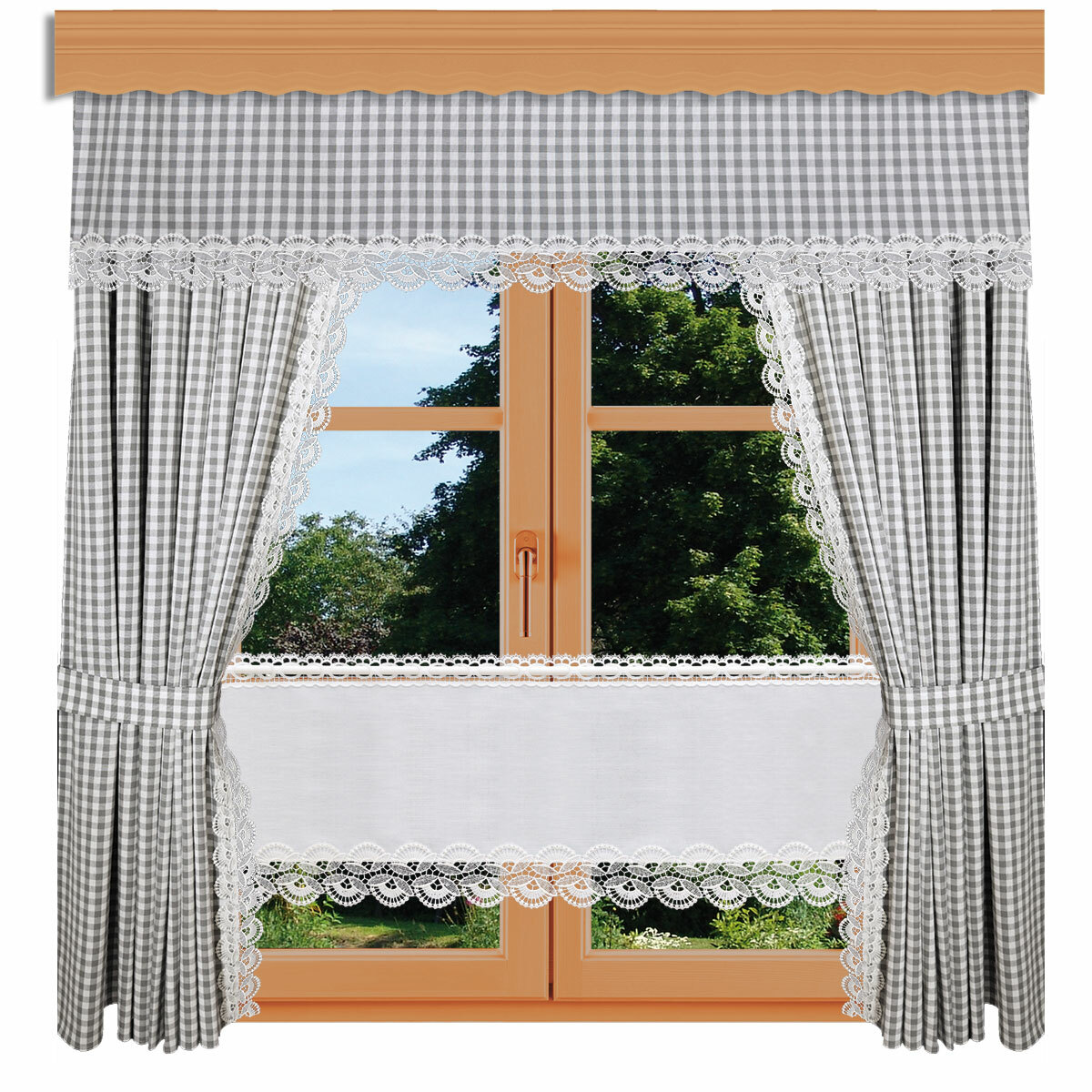 Suchen Sie eine Fensterdekoration, die sich harmonisch einfügt, ohne sich aufzudrängen? Die grau-weiß karierte Variante der Kollektion Hannah ist die perfekte Wahl für ein ruhiges und puristisches Lundhaus-Ambiente. Die zarte vogtländische Spitze rundet das Design stilvoll ab.