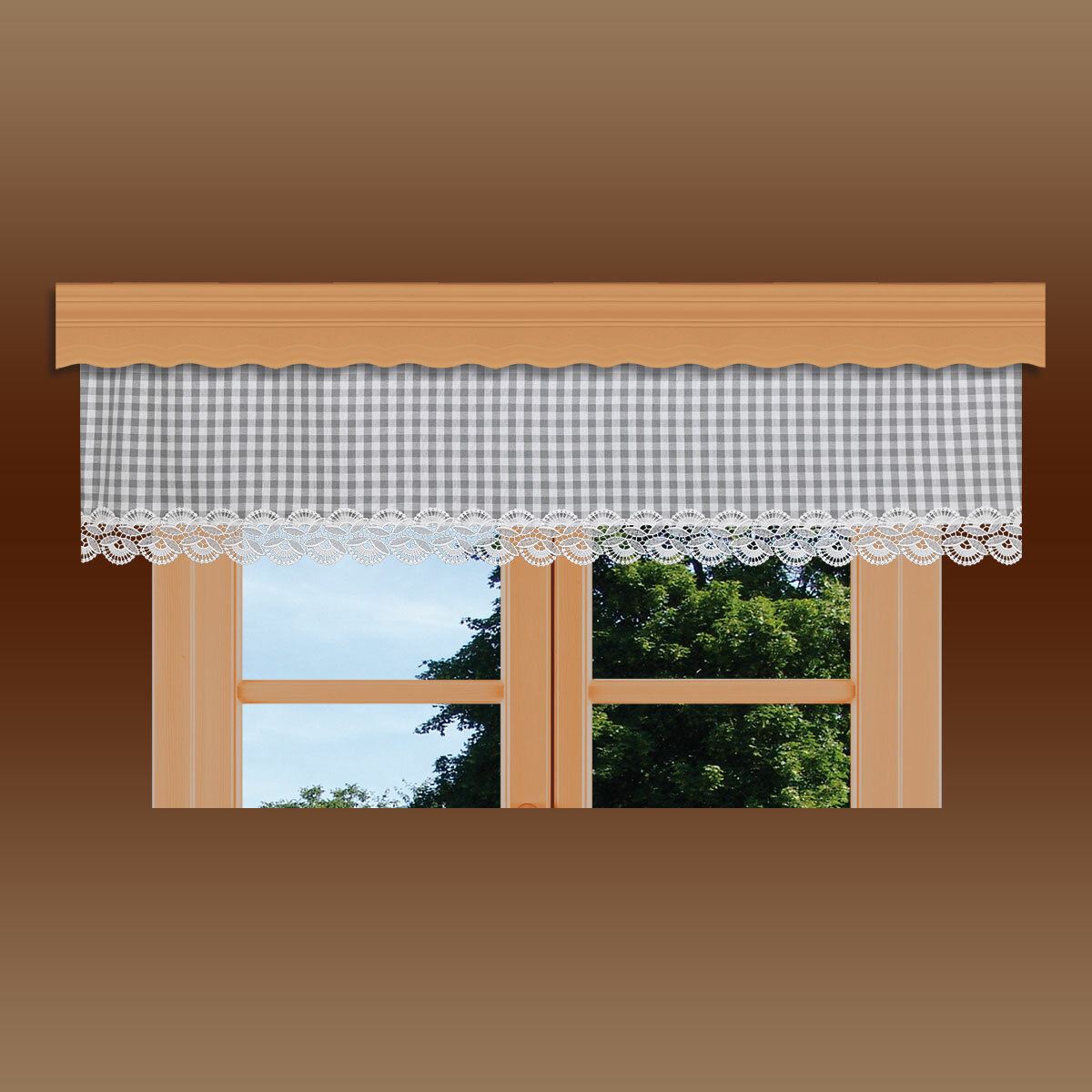 Sanfte Fensterdeko für ein harmonisches Heim. Der grau-weiß karierte Querbehang Hannah wirkt edel und dezent. Mit hochwertiger vogtländischer Spitze, hundgefertigt in Deutschlund – pflegeleicht und zeitlos schön.