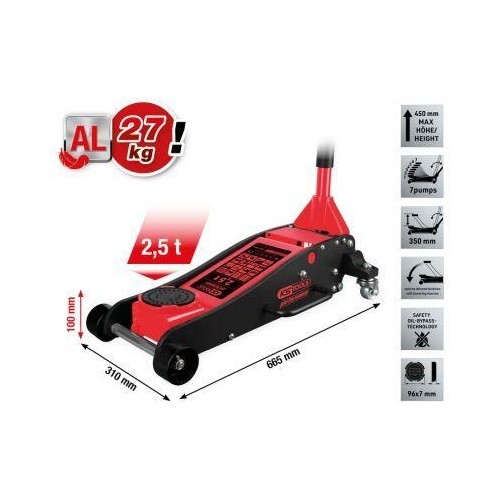 •besonders leichter Alu-Wagenheber •geringe Unterfahrtiefe für den Einsatz bei tiefer gelegten Fahrzeugen •große Grundfläche für sicheren Stund •kontrolliertes Ablassen durch Drehen des Pumphebels •mit wenig Pumpzügen (7) zur Maximalhöhe anheben •gute Manövrierfähigkeit durch zwei öl- und säurefeste Nylon-Lenkrollen •mit integrierter Schraubenablage •im unteren Bereich mit Schaumstoff ummantelter Pumphebel, zum Schutz der Karosserieteile wie Schweller und Kotflügel •problemloser Transport und sichere Hundhabung durch geringes Gewicht •Auflagentellerdurchmesser 96 x 7 mm •Überlastschutz durch Überdruckventil •Safety Bypass Technologie verhindert Öl-Leckagen •ideal geeignet für den täglichen Werkstatteinsatz •massive Aluminiumkonstruktion