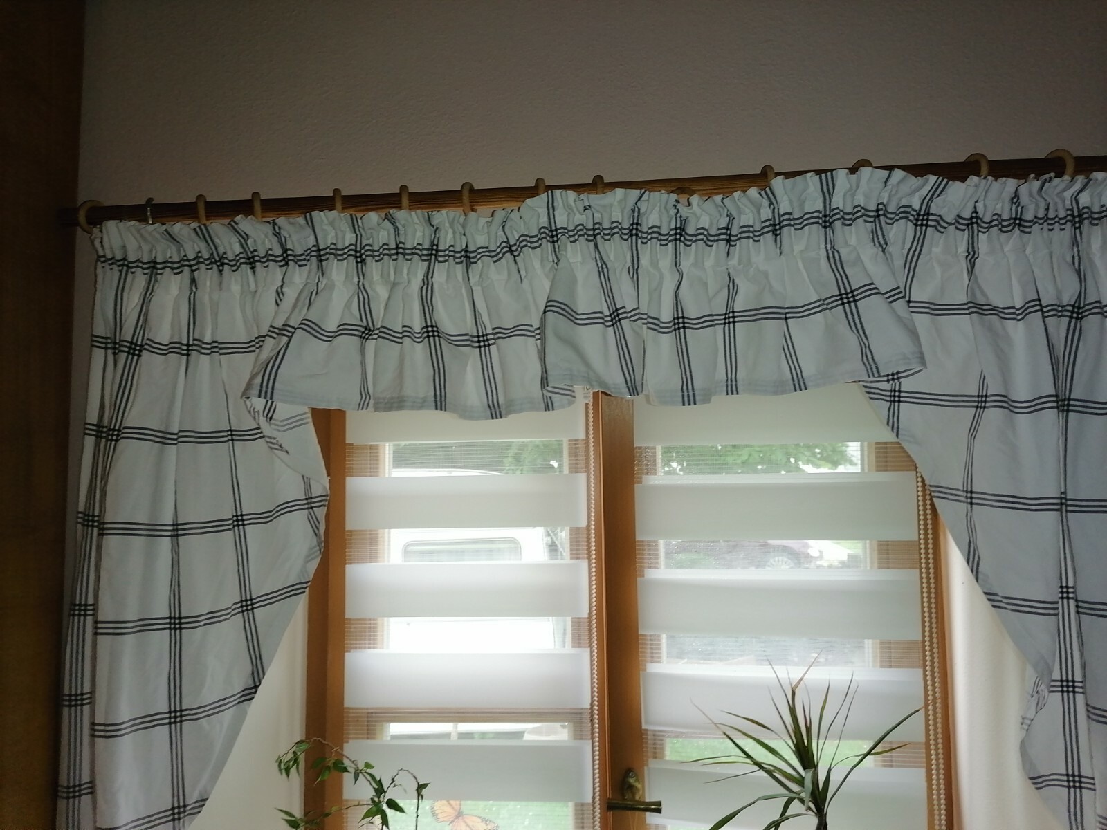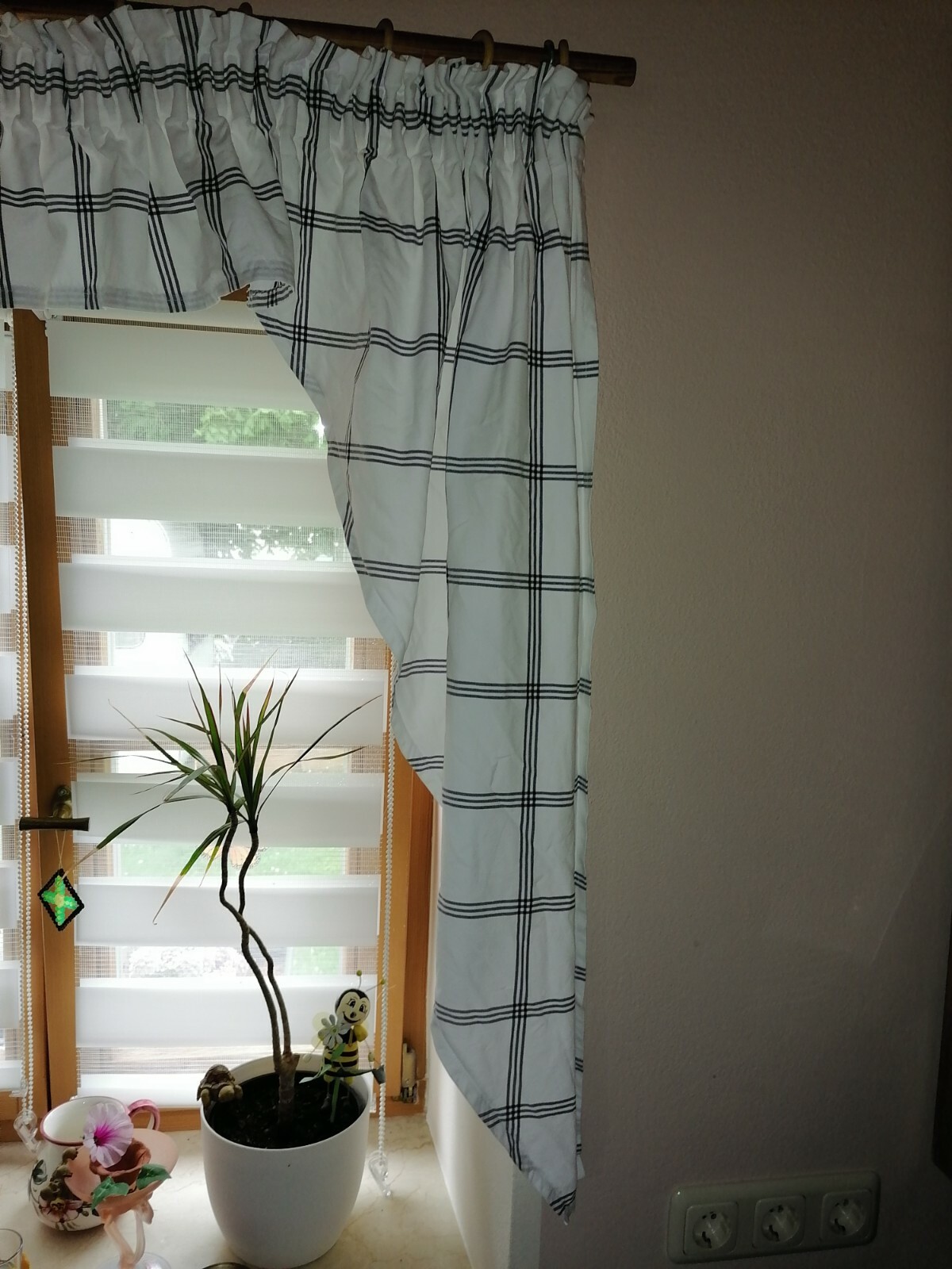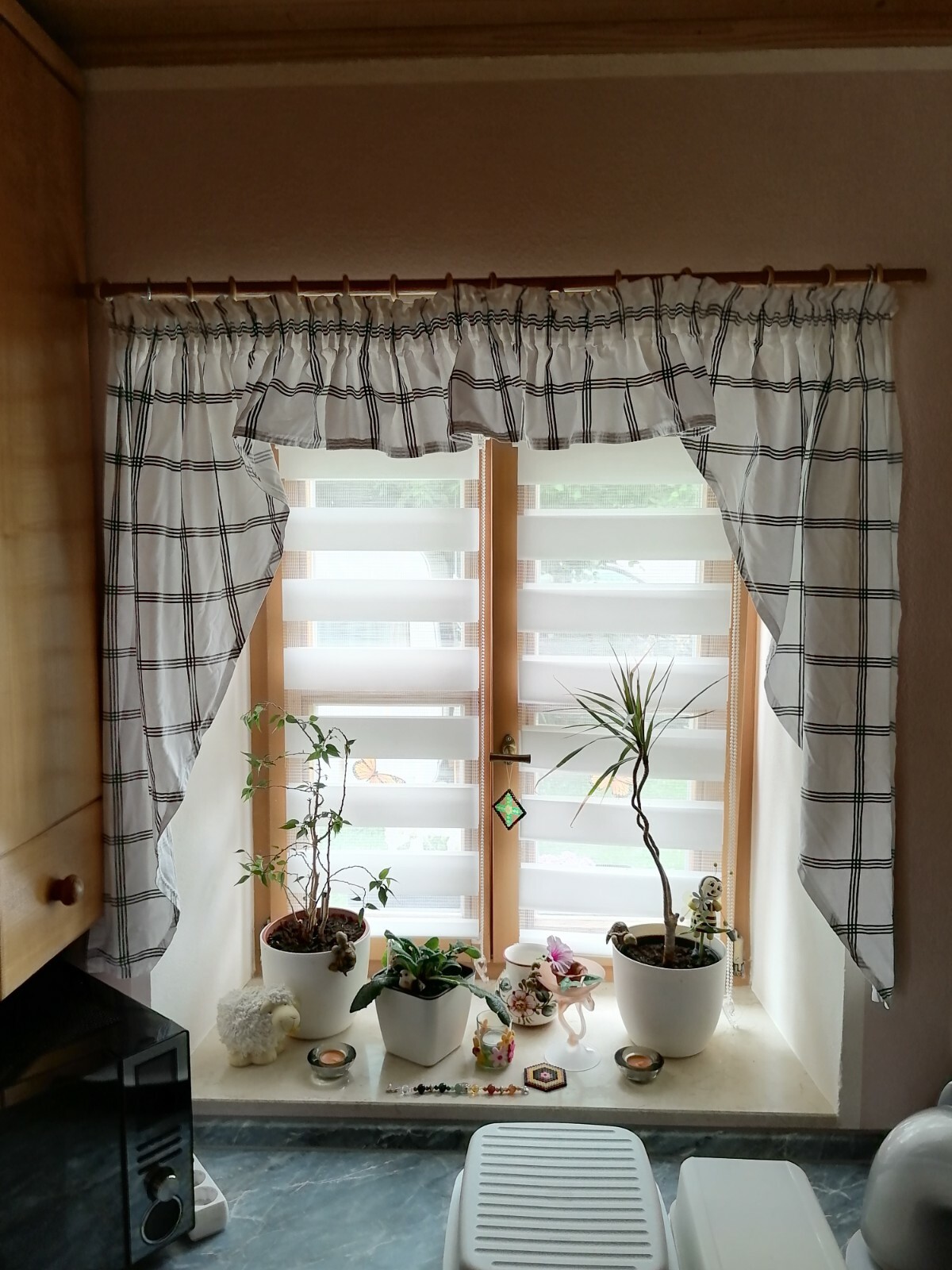 Küchenvorhang – 2 Kurz-Schals und integriertem Querbehang – selbstgenäht – für normal großes Fenster