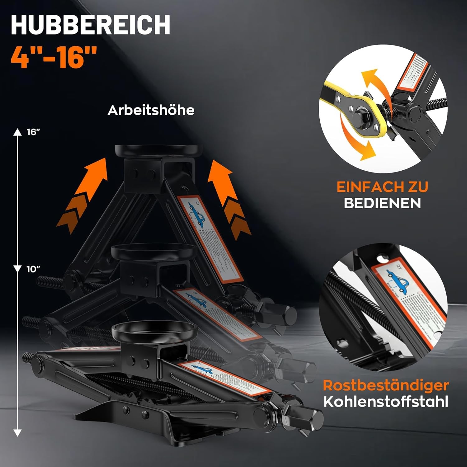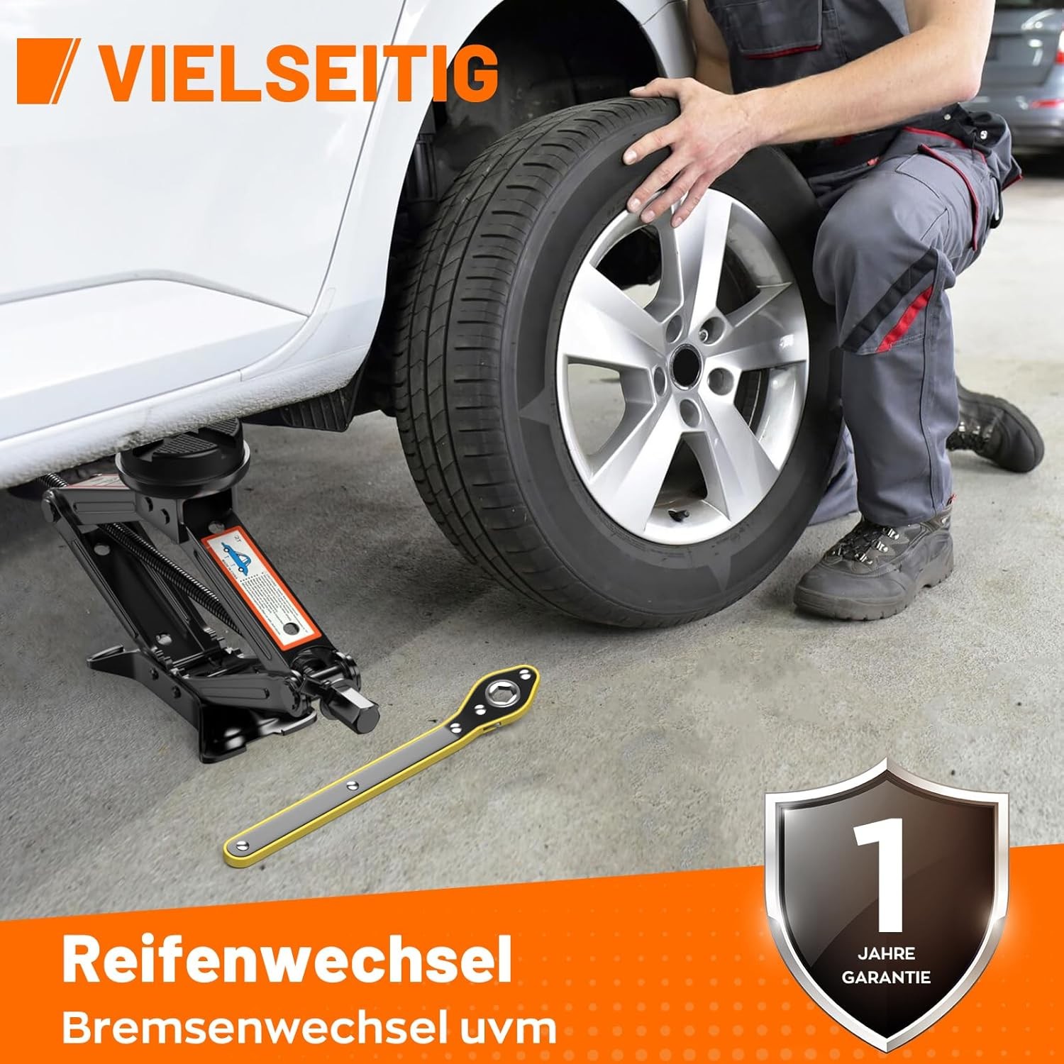 Dieser Scherenwagenheber ist für die sichere Hebung von Fahrzeugen bis zu 2 Tonnen geeignet. Der Wagenheber ermöglicht eine Hubhöhe von 10 cm bis 42 cm und ist für eine breite Palette von Fahrzeugtypen wie Limousinen und SUVs geeignet.