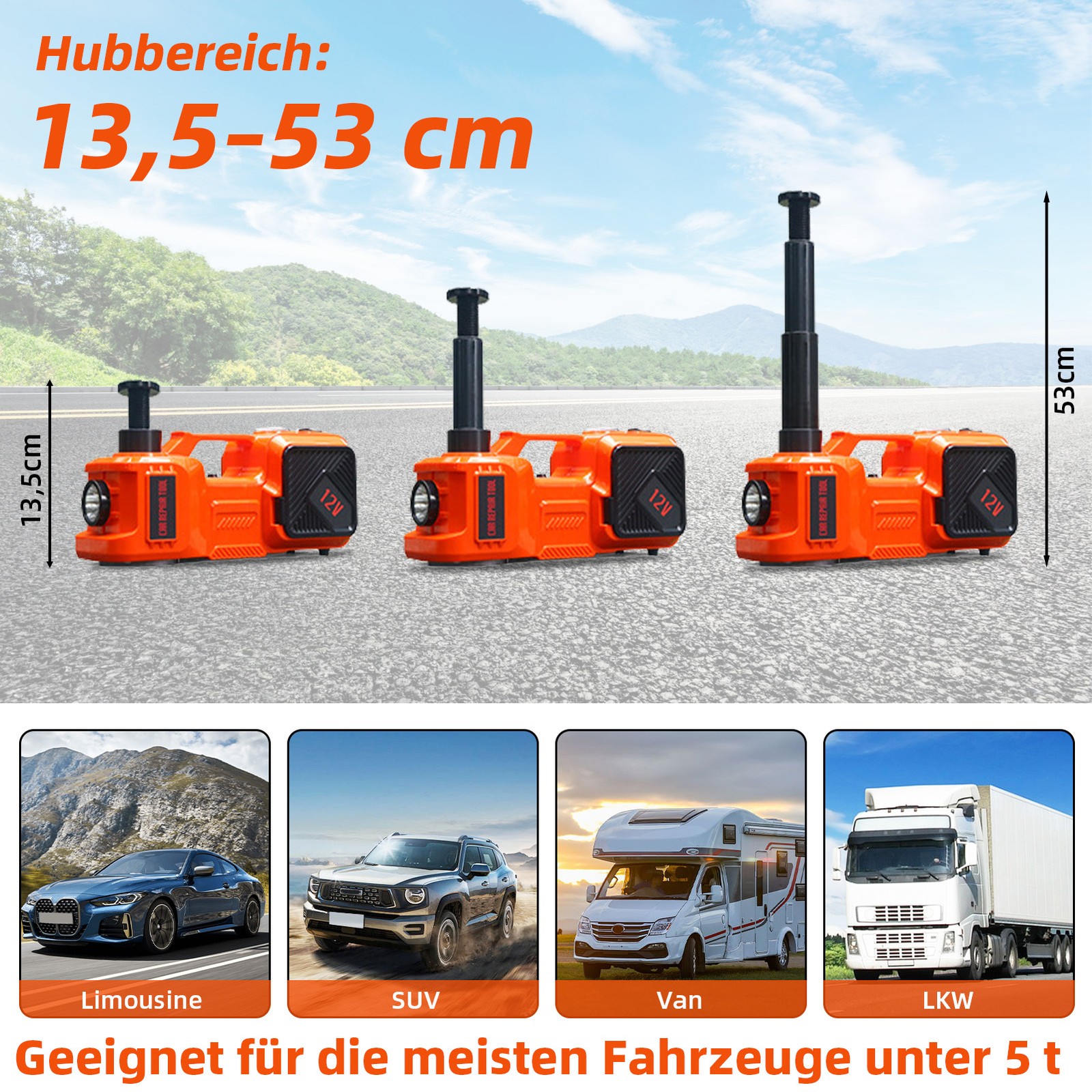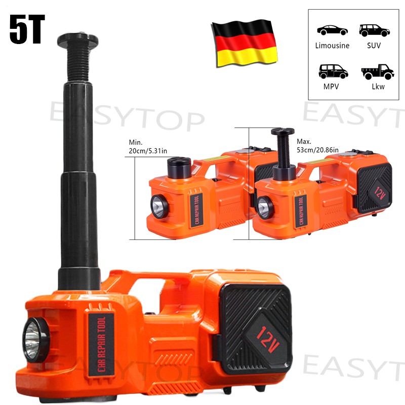 Leistungsstarker elektrischer Wagenheber: Hubkraft: 5,0 Tonnen. Hubbereich: 155–530 mm. Dieser elektrische Wagenheber ist ein Lebensretter im Straßenverkehr und kann auch für Reparaturen in der heimischen Garage eingesetzt werden. Er passt für jedes Auto, jede Limousine, jeden LKW und jedes Fahrzeug mit der entsprechenden Tragkraft.