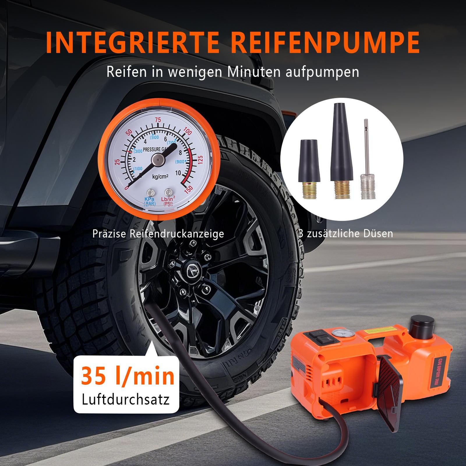 Schnelles Reifenpumpen: Der elektrische hydraulische Wagenheber verfügt über eine integrierte Reifenpumpe, sodass Sie sich nie wieder Sorgen um einen platten Reifen in der Wildnis machen müssen. Versteckte Werkzeugfächer an beiden Seiten halten Reifenschlauch und Nadel übersichtlich für schnelles Reifenpumpen. Dank der Reifendruckanzeige können Sie den Reifendruck während des Pumpens überwachen. Ihr Auto wird es Ihnen danken!