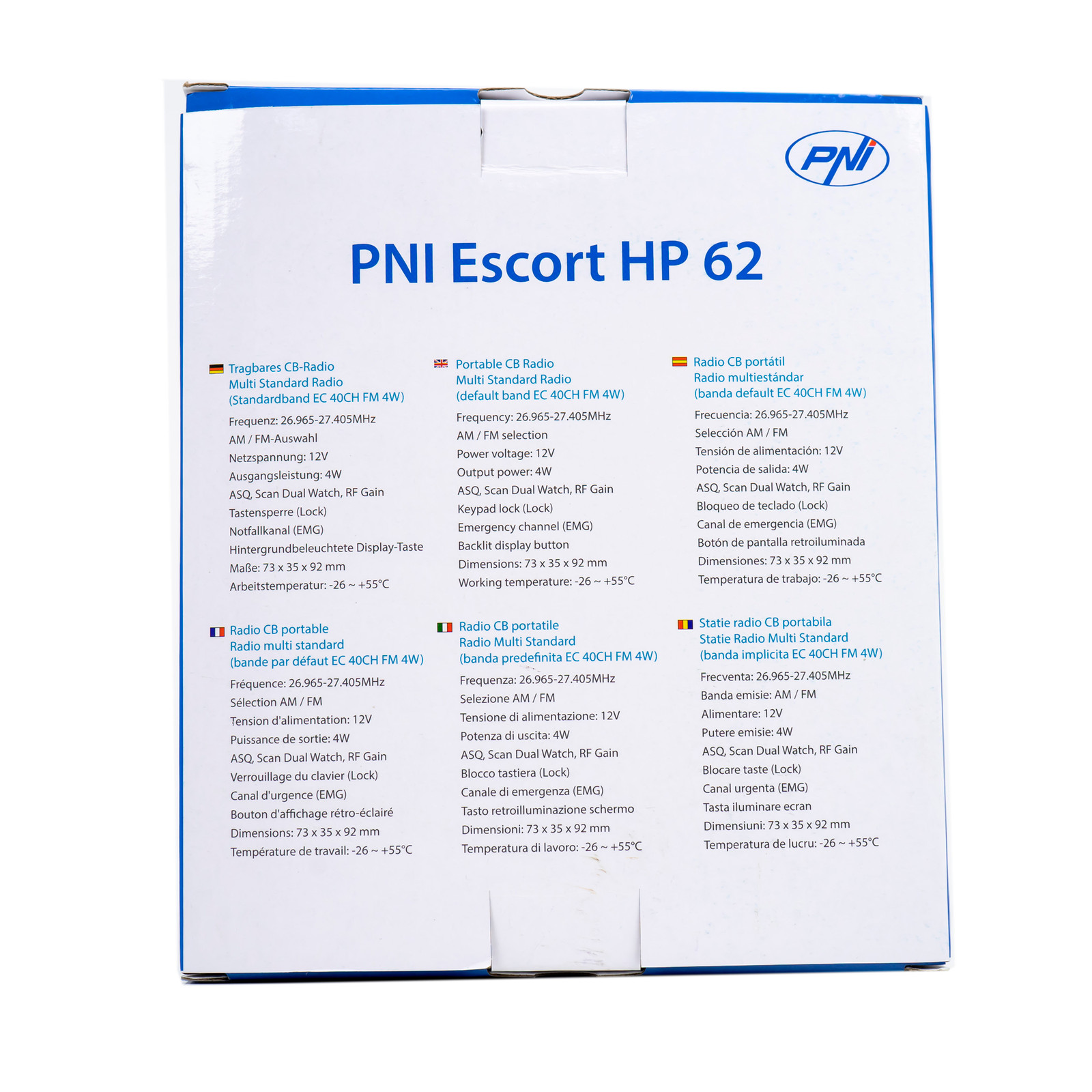 La station radio PNI Escort HP 62 CB a une double utilisation : dans la voiture comme station mobile avec l'antenne montée sur la carrosserie et à l'extérieur comme station portable en installant une antenne BNC et des batteries (accessoires en option). Les connexions microphone et haut-parleur permettent la connexion d'un casque à 2 broches avec lequel nous pouvons communiquer en mains libres.