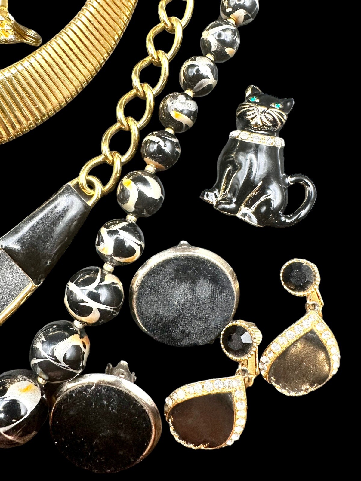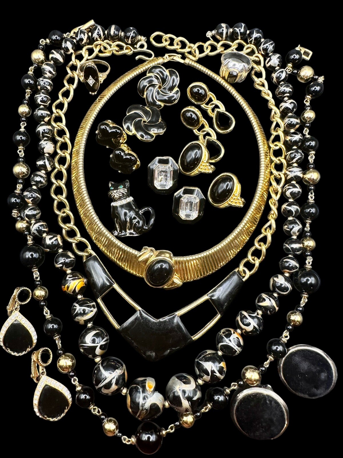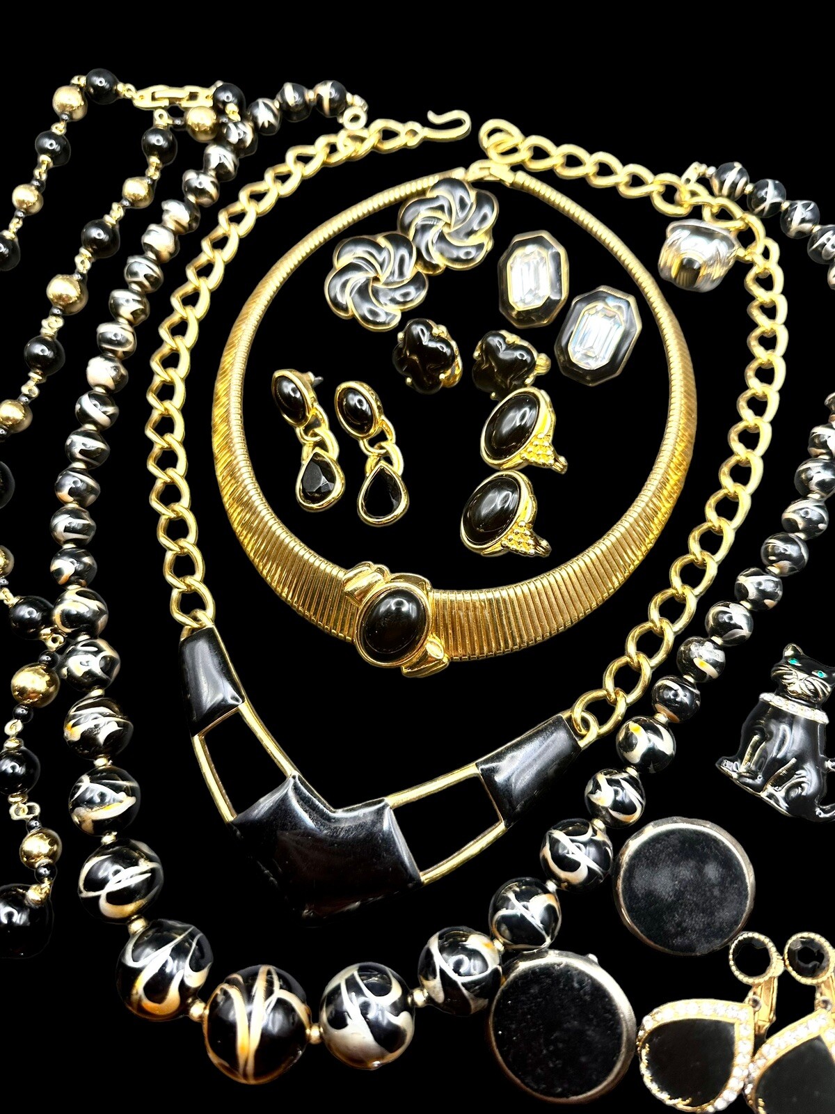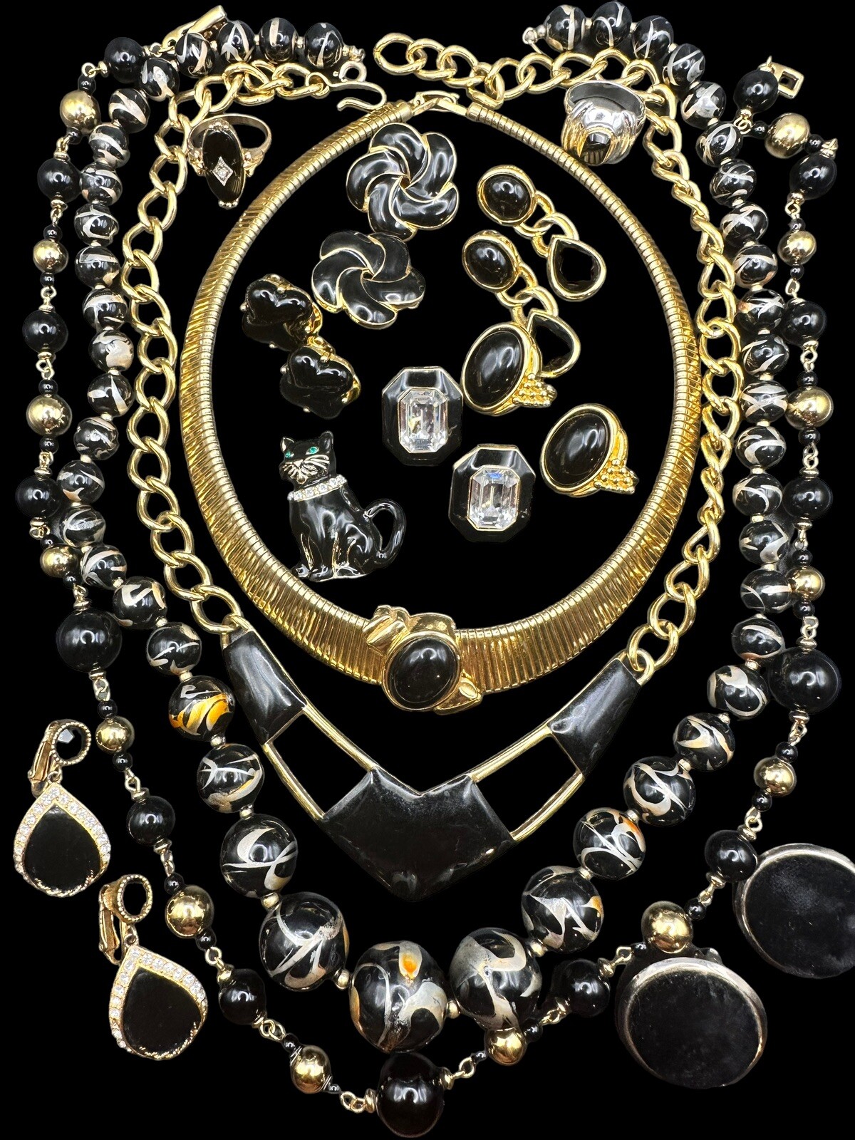 Vtg Black & Gold Jewelry Enamel Rhinestone Lot Monet Trifari Napier Etc 14 Pc