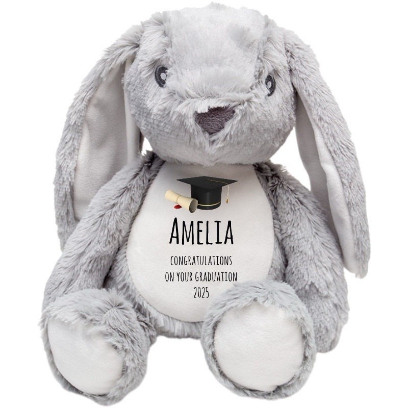 The soft and cuddly bunny is personalised with the graduate's name and graduation year along with the wording "Congratulations on your graduation" printed directly on to the bunny using the latest in sublimation printing technology. The image of the mortarboard and certificate also printed.