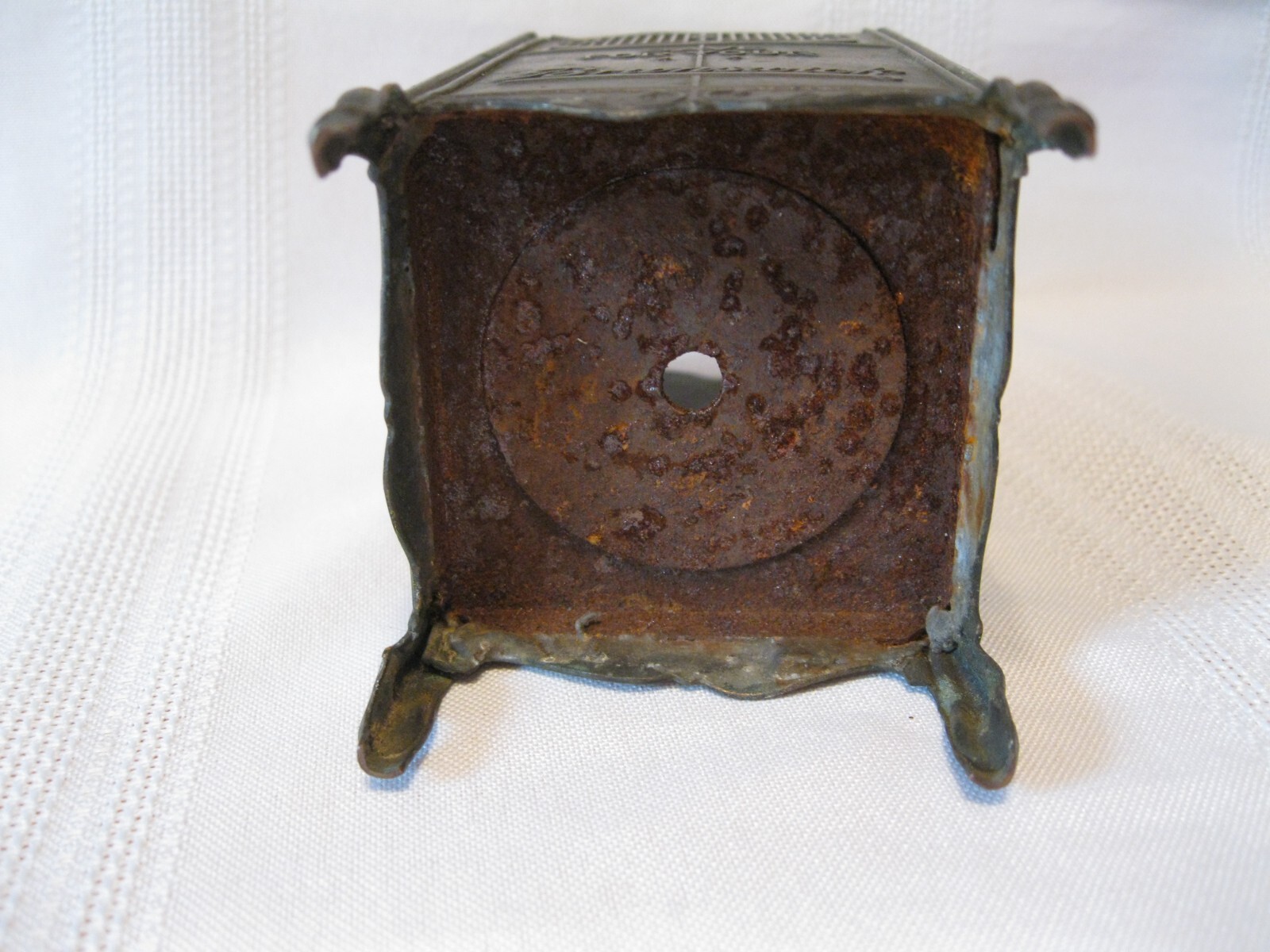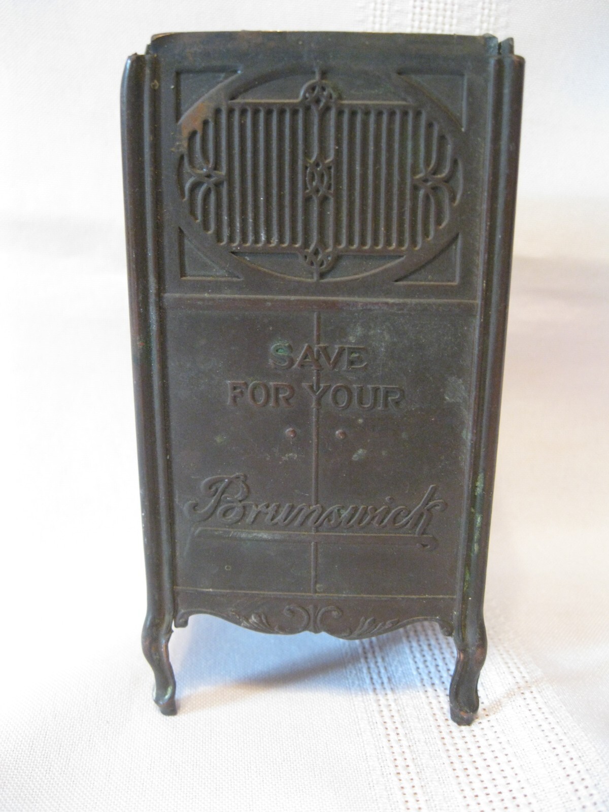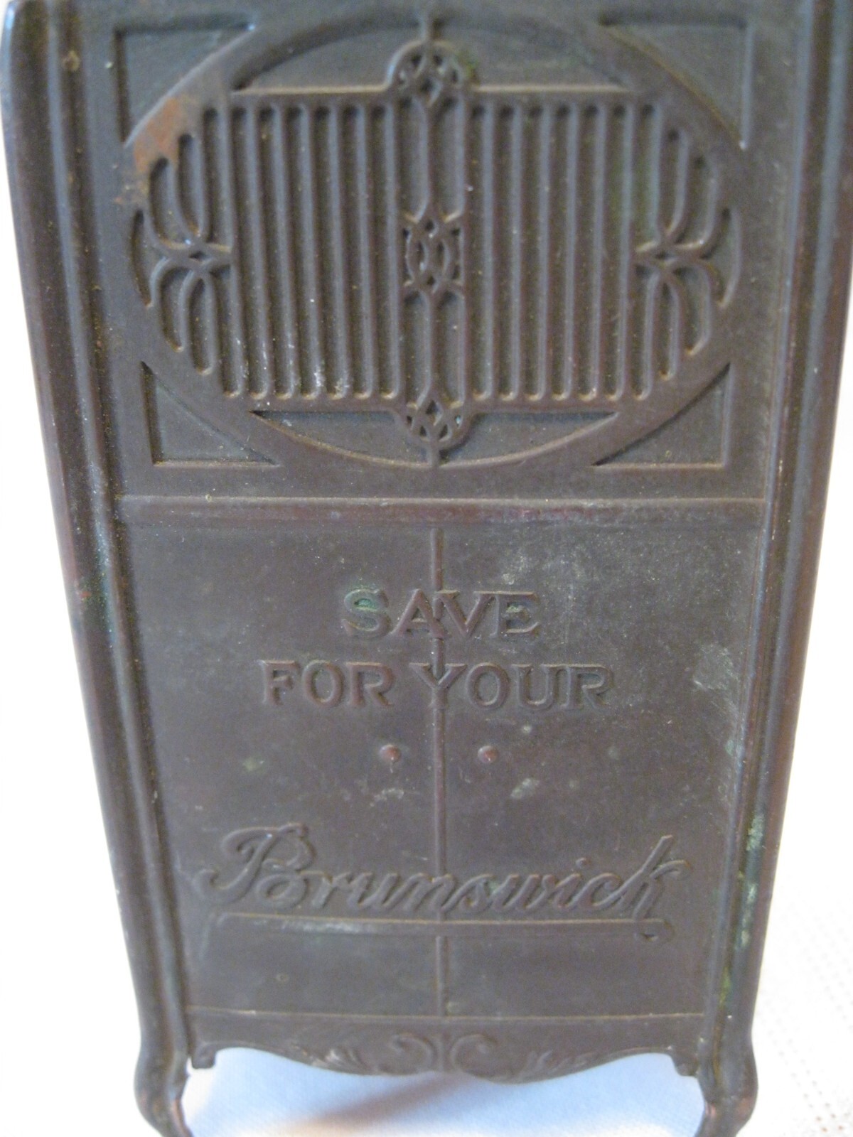 Heavy metal savings bank advertising Brunswick Phonograph. Top is missing but advertising on front is legible. Some corroding and splotches. Rust on bottom. Sold as is. Front of item displays well. Please look at all photos.