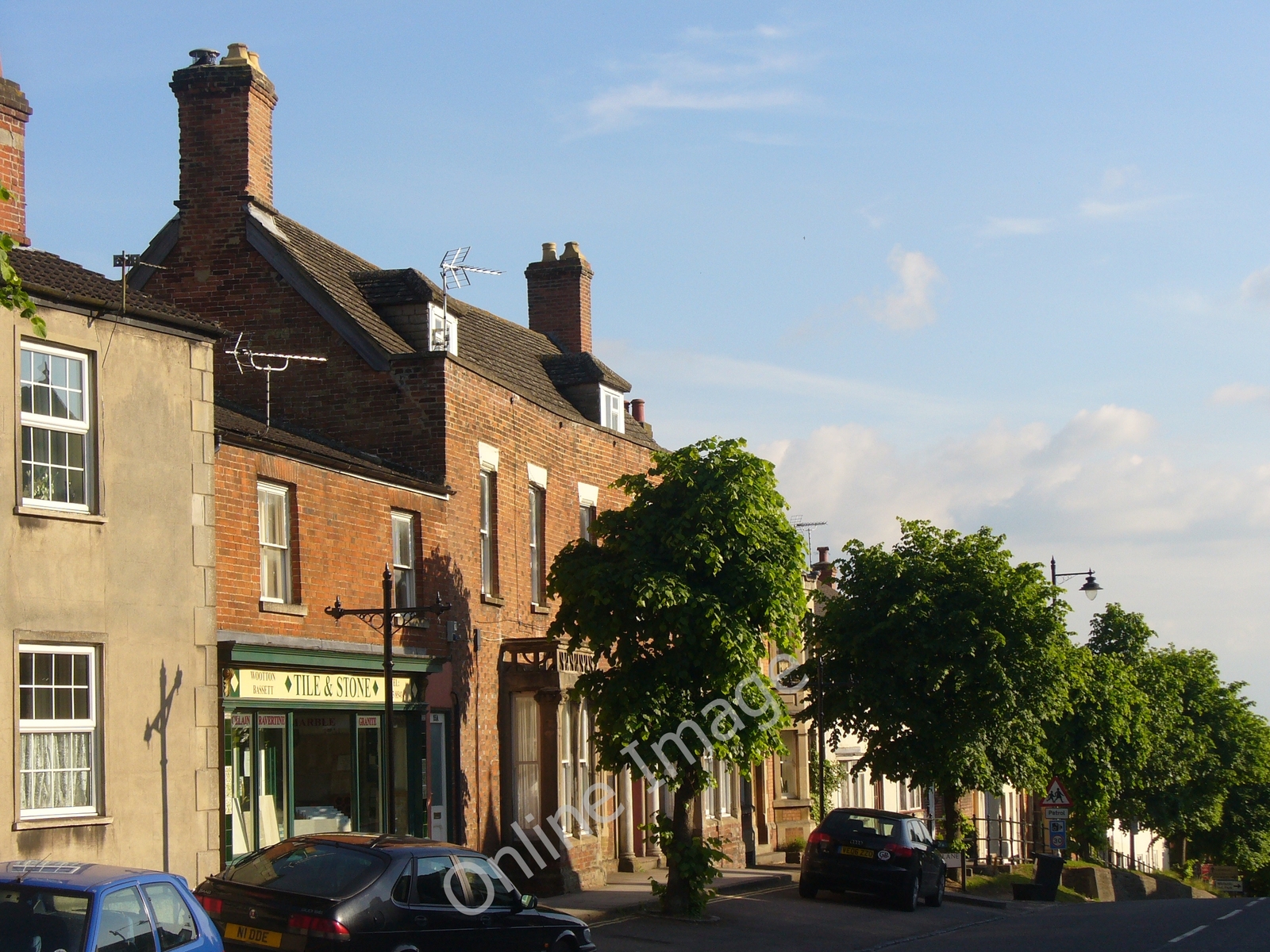 Photograph Notes: Old red brick and stone houses along the tree-lined street as it descends from the town centre. The old street is wide enough (former market) to offer ample parking.