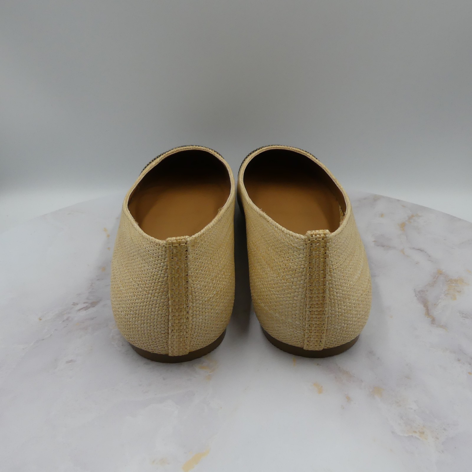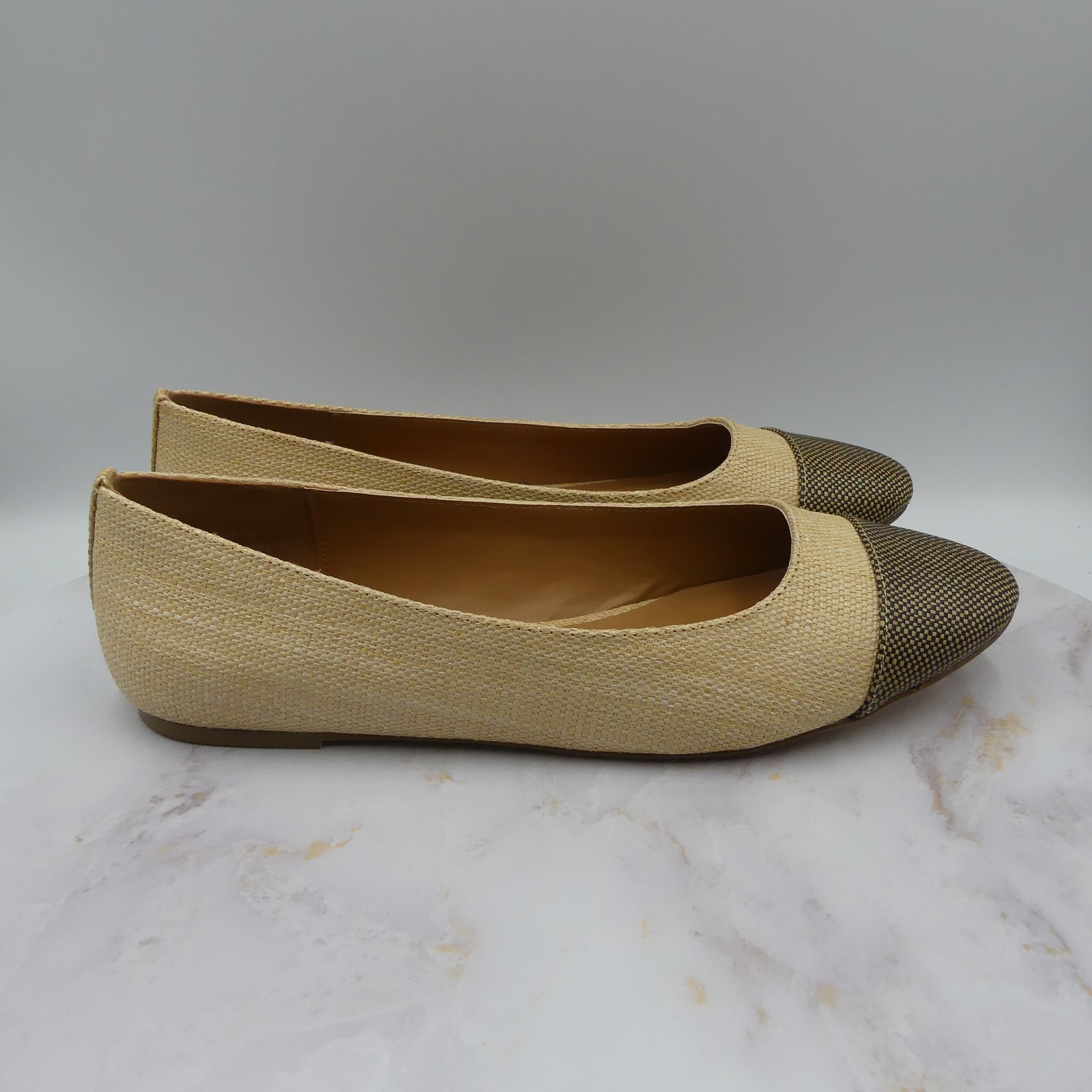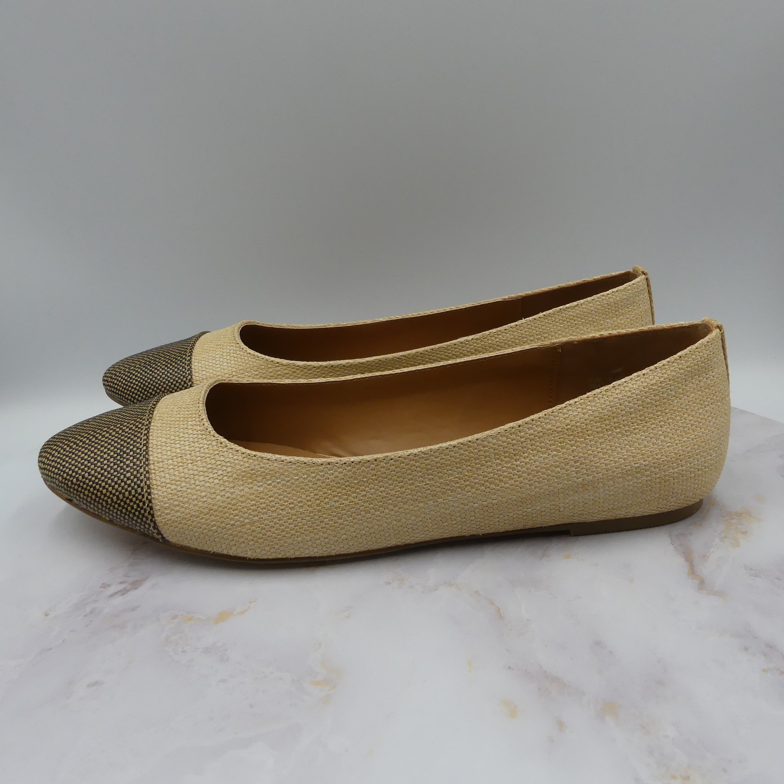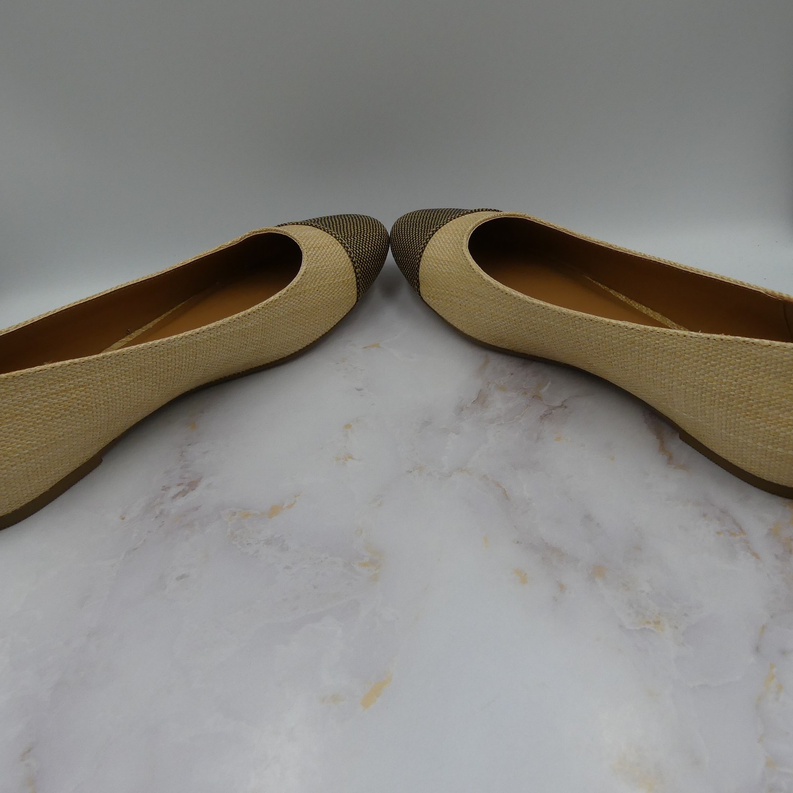 Ballet flats with natural woven textile upper and brown/black textured cap toe