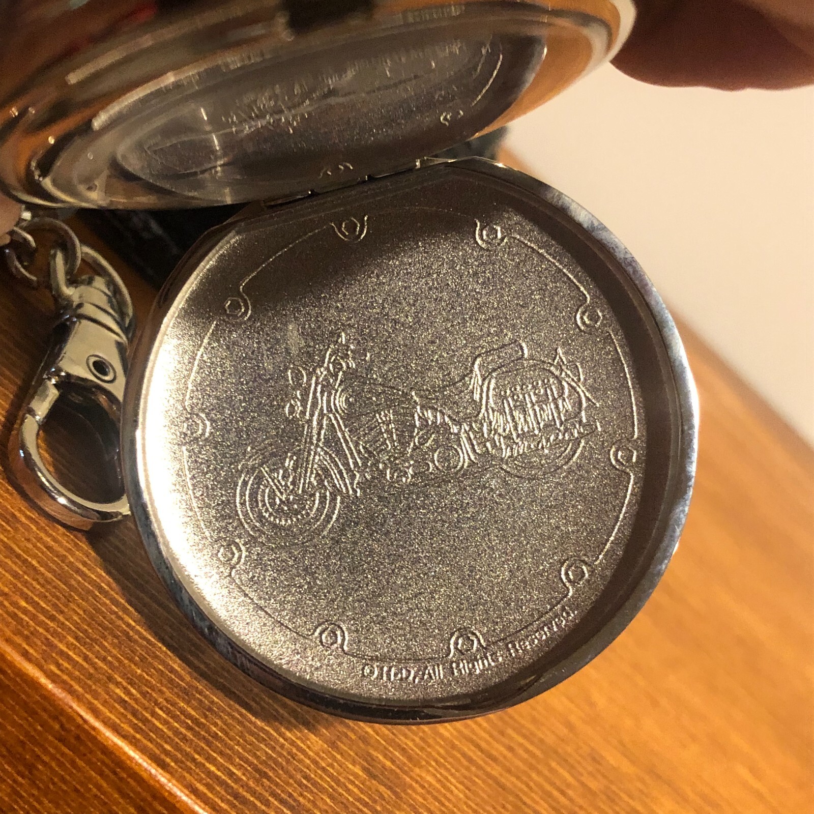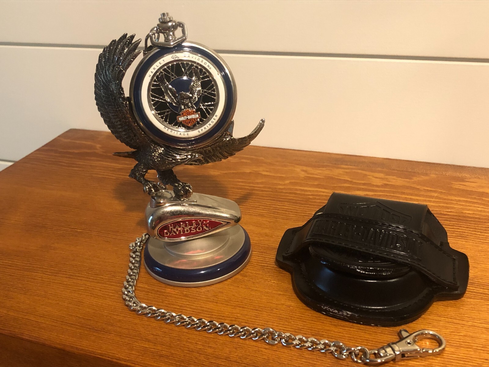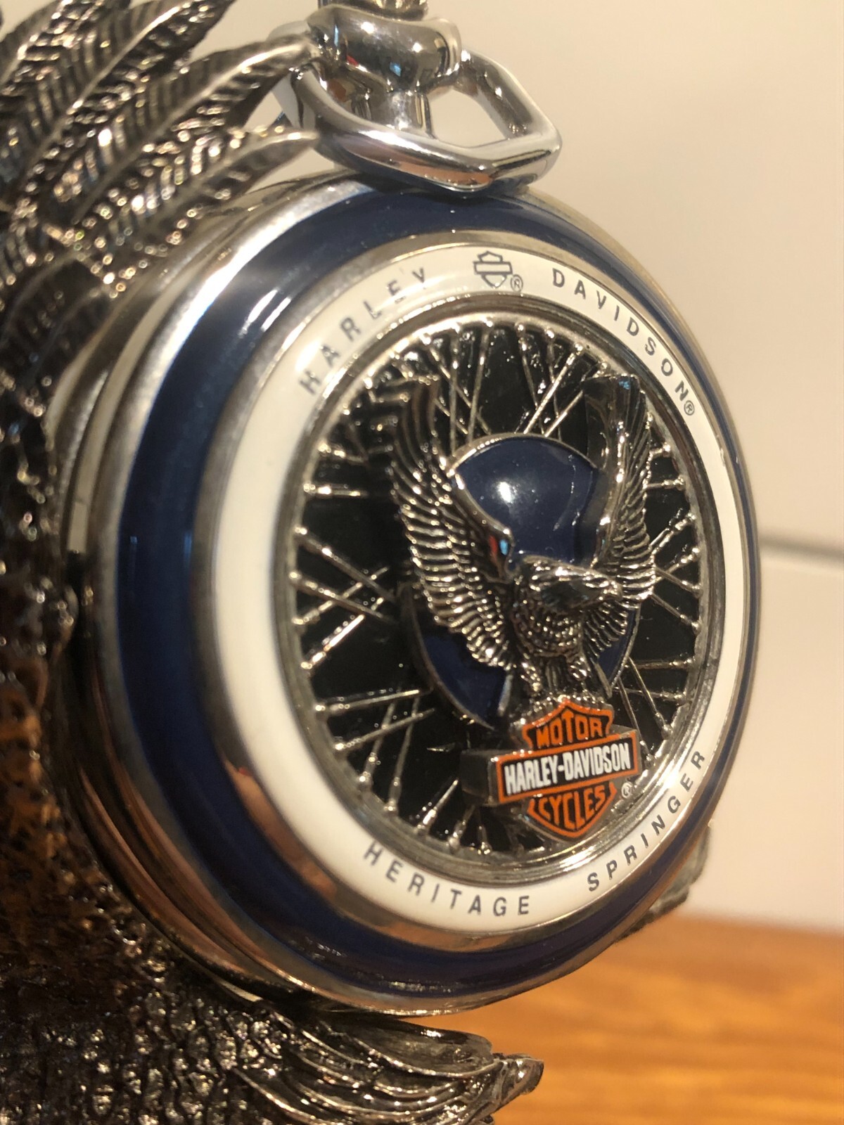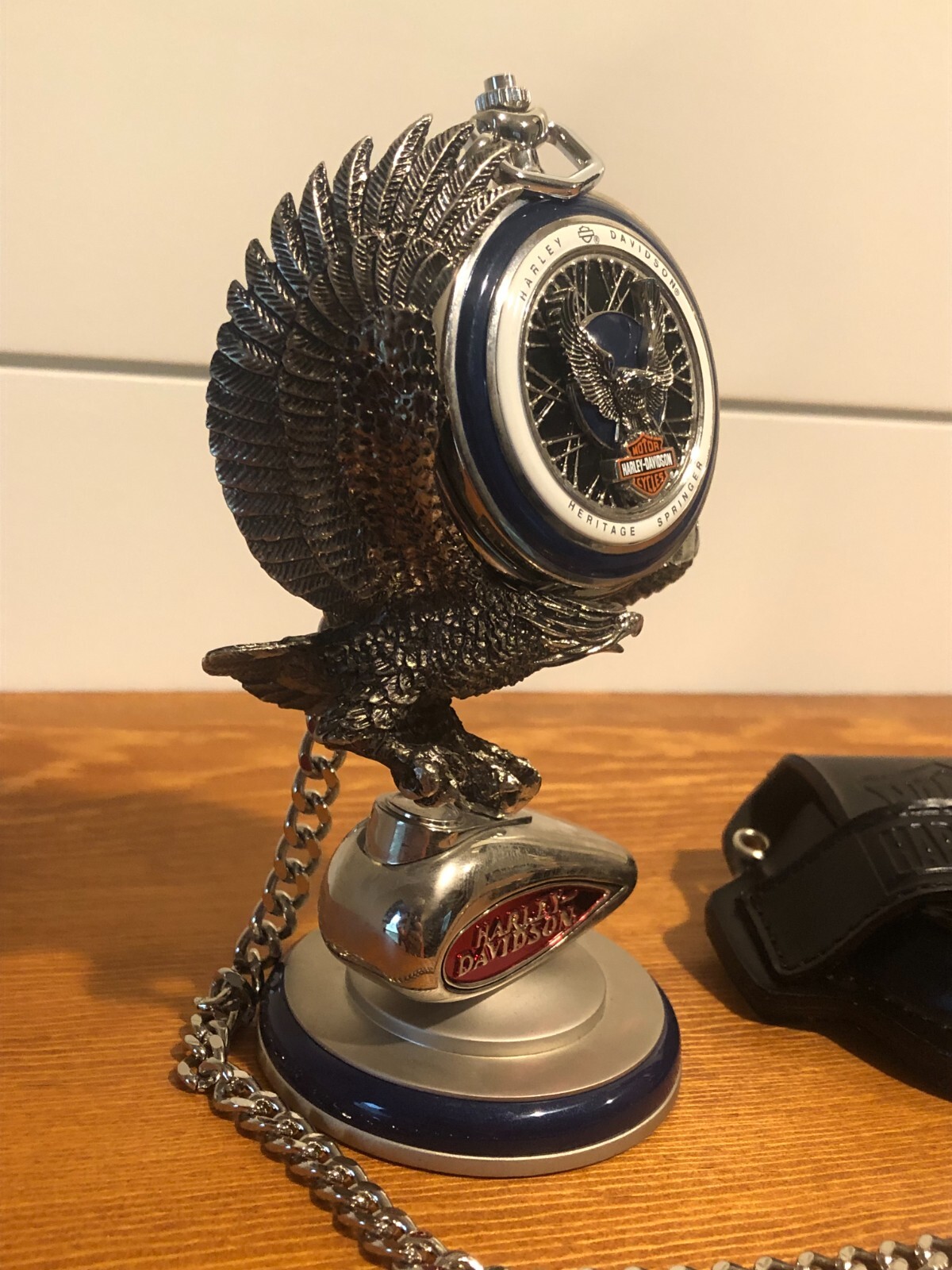 I have some very nice Harley Pocket Watches for sale. I like this one the best. The stand is really cool with a gas tank and a large eagle wing. Use them for a watch or add them to your Harley collection or both.
