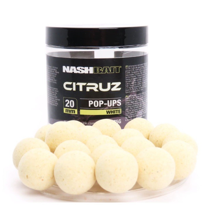 Nash Citrus Pop Ups bait is a 20mm model with positive buoyancy, suitable for coarse fishing targeting carp and barbel. Made by Nash Baits in the United Kingdom, these white pop ups have a long-lasting scent, concentrated formula, and do not require refrigeration. Each tub of pop ups weigh 75g and is designed to attract freshwater fish without sinking.includes flavour booster Can be used critically balanced close to the lake bed or popped up off the bottom or even fished mid water as a zig bait
