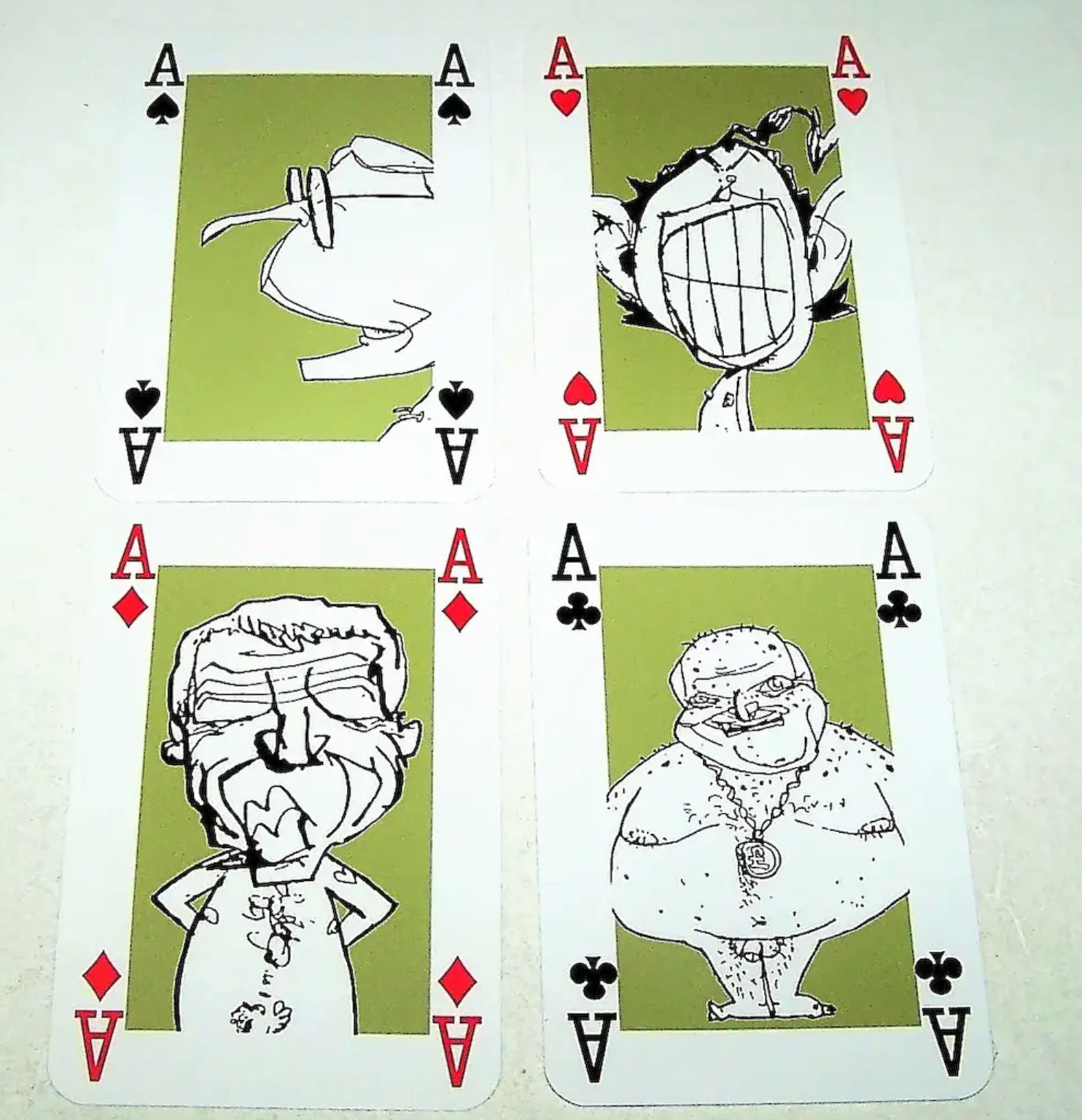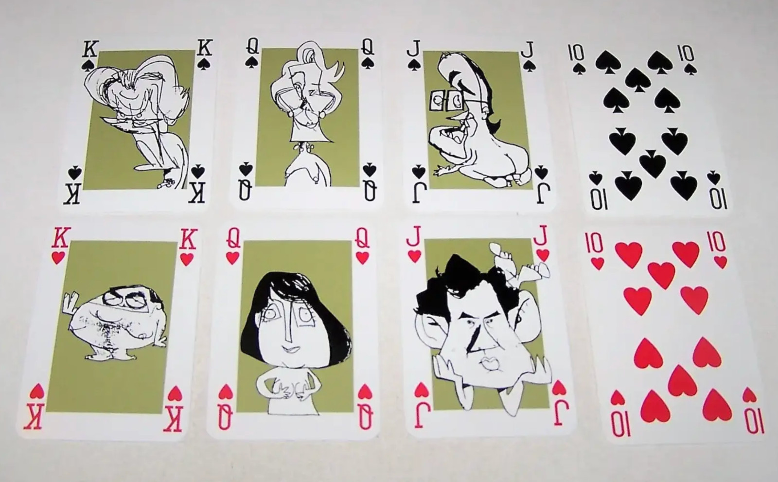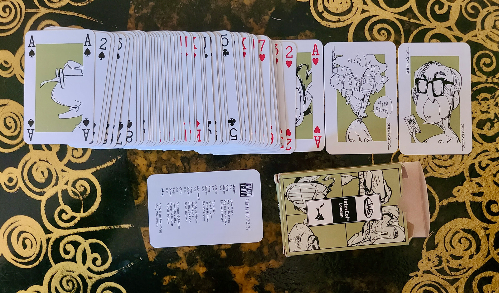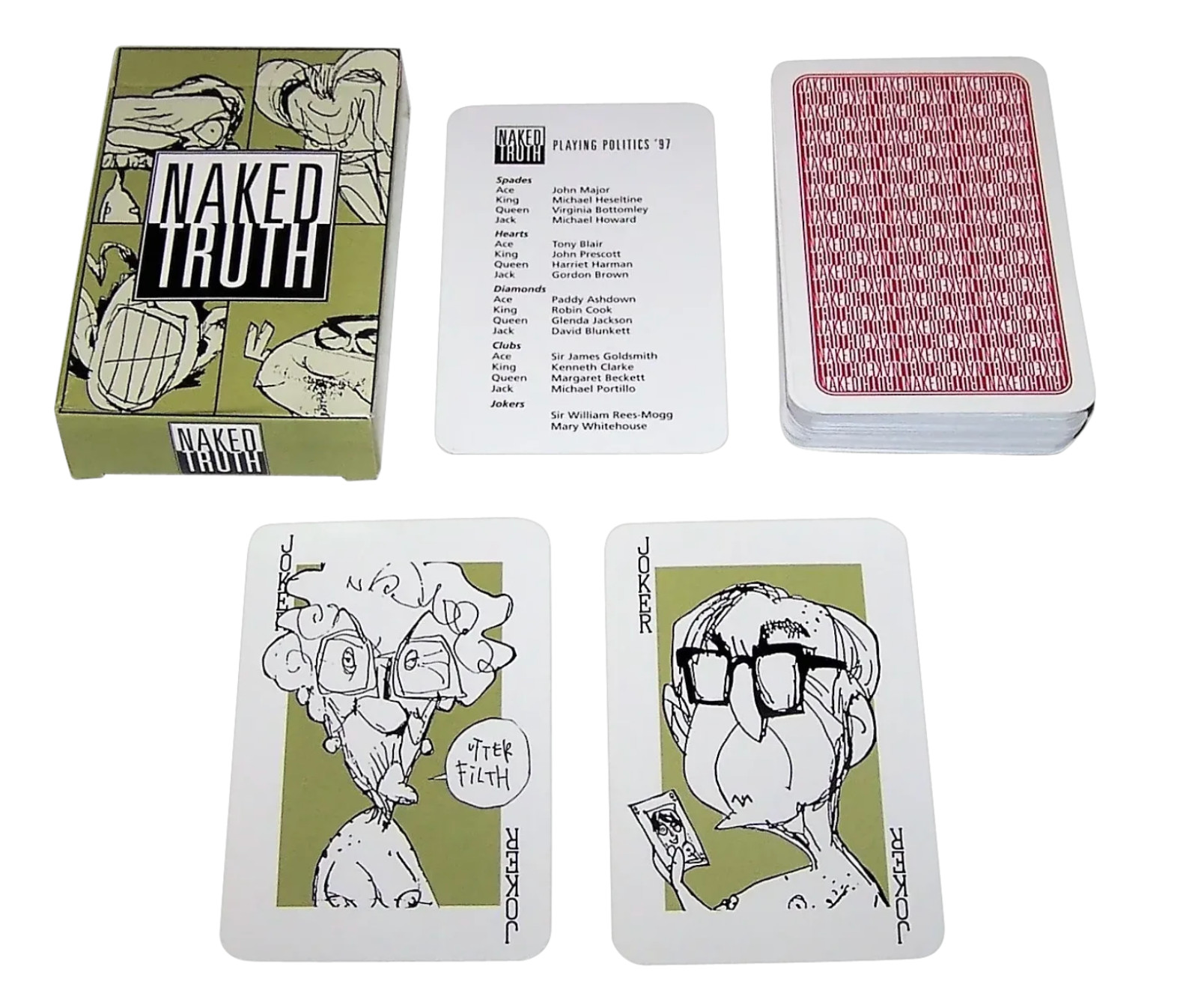 The deck has 52 suited cards, plus 2 Jokers, plus an unbacked card with a listing of the politicians depicted on one side and a description of Jason Pratt and Intercol on the other. The cards are slightly small bridge size, measuring 86mm x 56mm, and come in the original box.