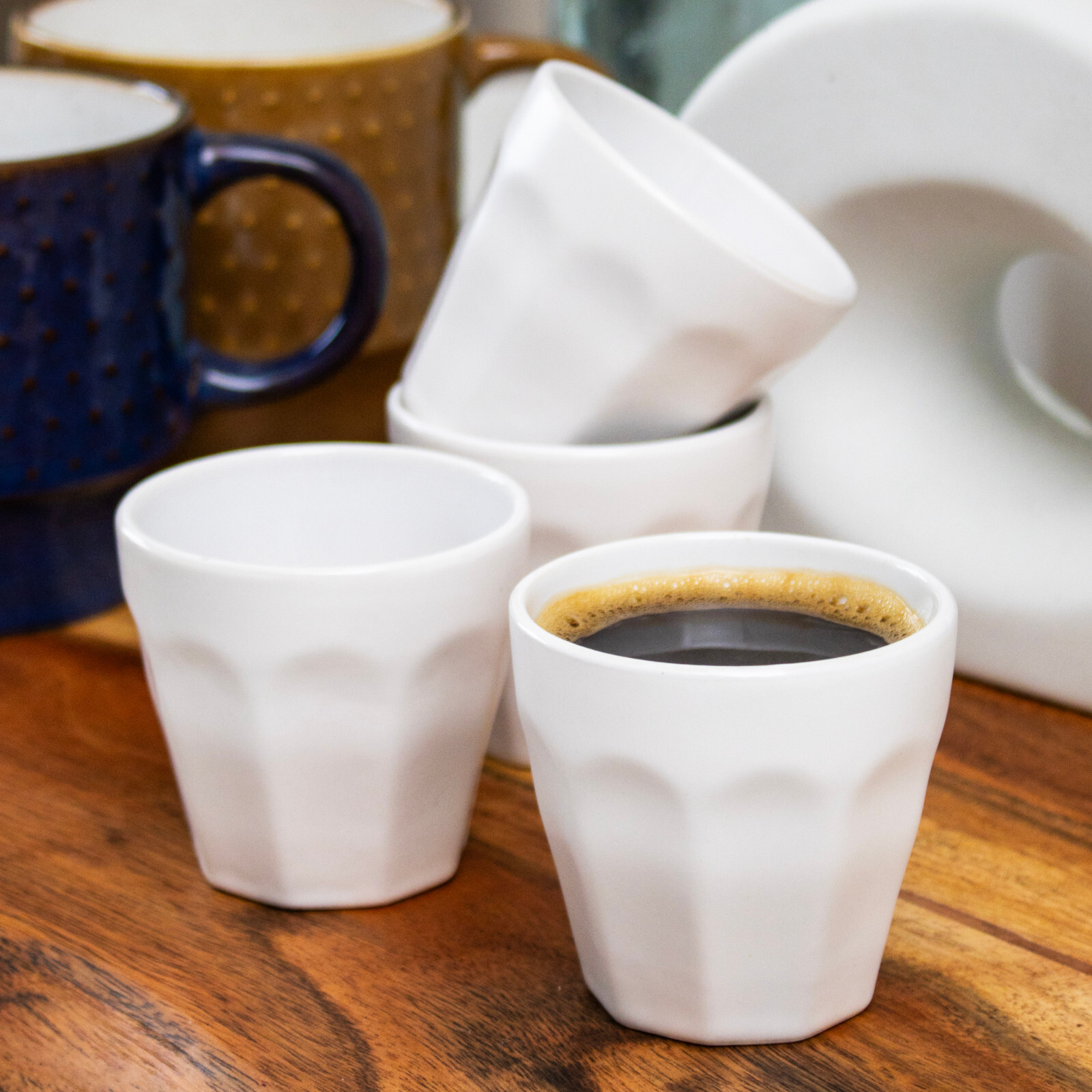 With a 90ml capacity, they are perfect for espresso shots, macchiatos, or after-dinner coffees. Made from glazed stoneware, these durable cups retain heat well, ensuring your coffee stays warm for longer.