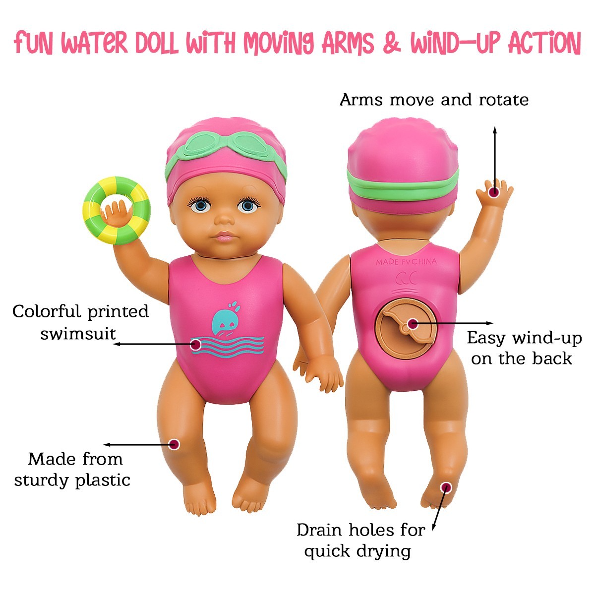 Wind-Up Swimming Action: Twist the easy-to-use wind-up knob on the back and watch the doll’s arms move in realistic swimming motions. Can swim on its front or back for freestyle and backstroke fun. No batteries required.