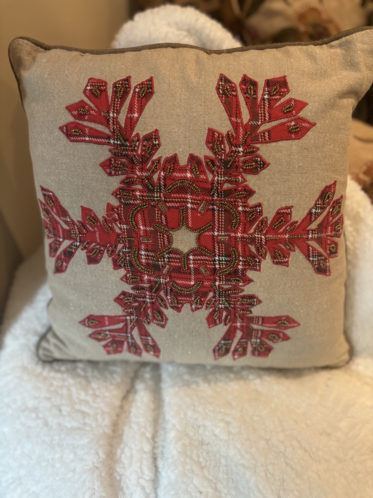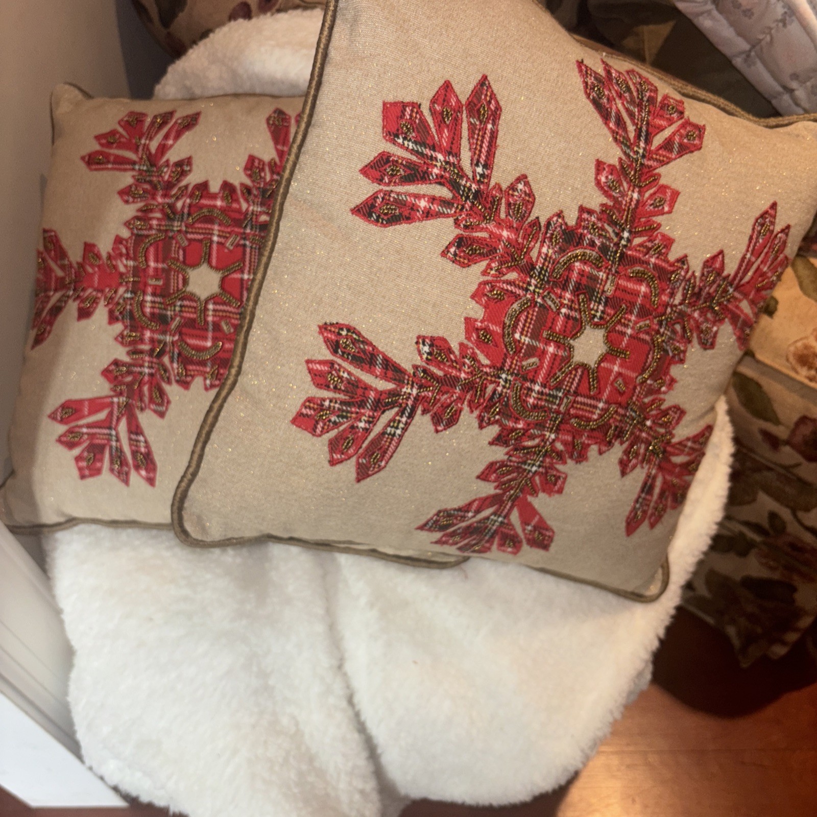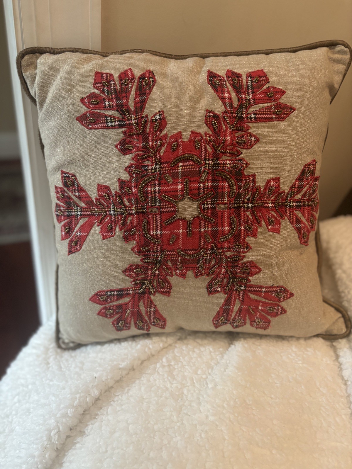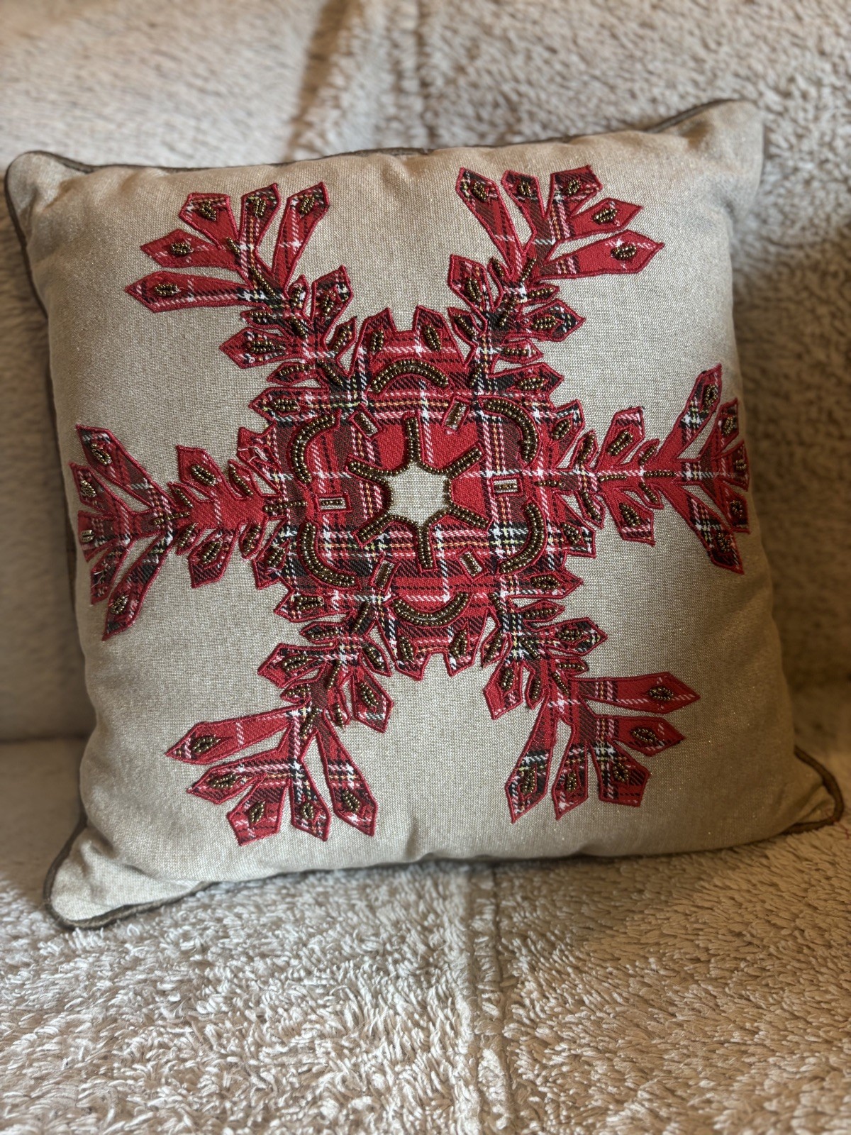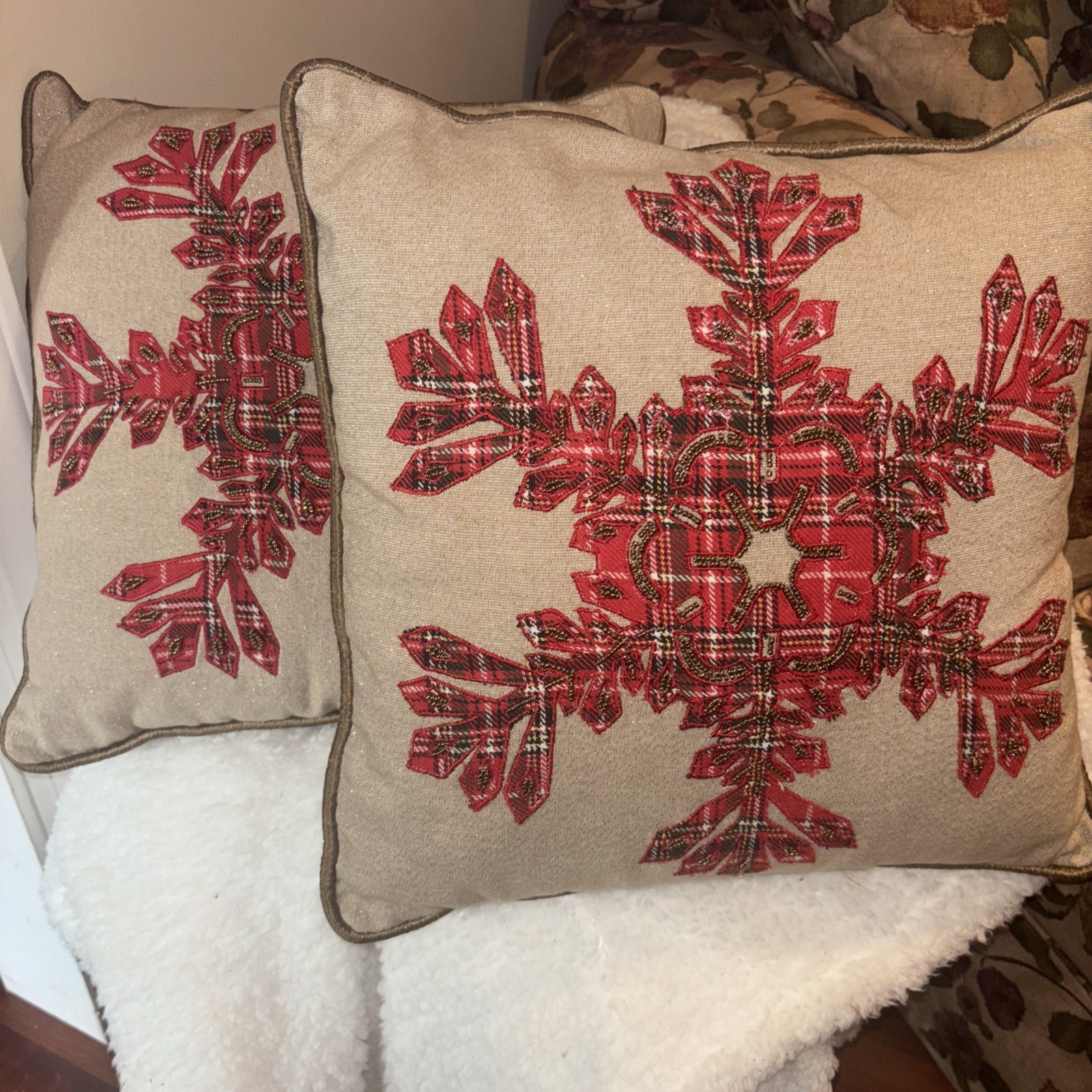 Excellent condition set of 2 beautifully beaded snowflake pillows by Pier 1.