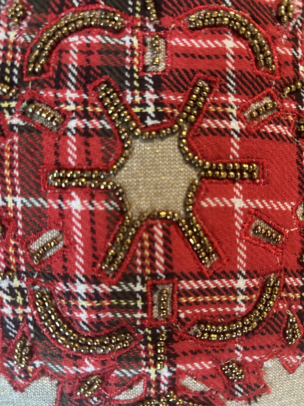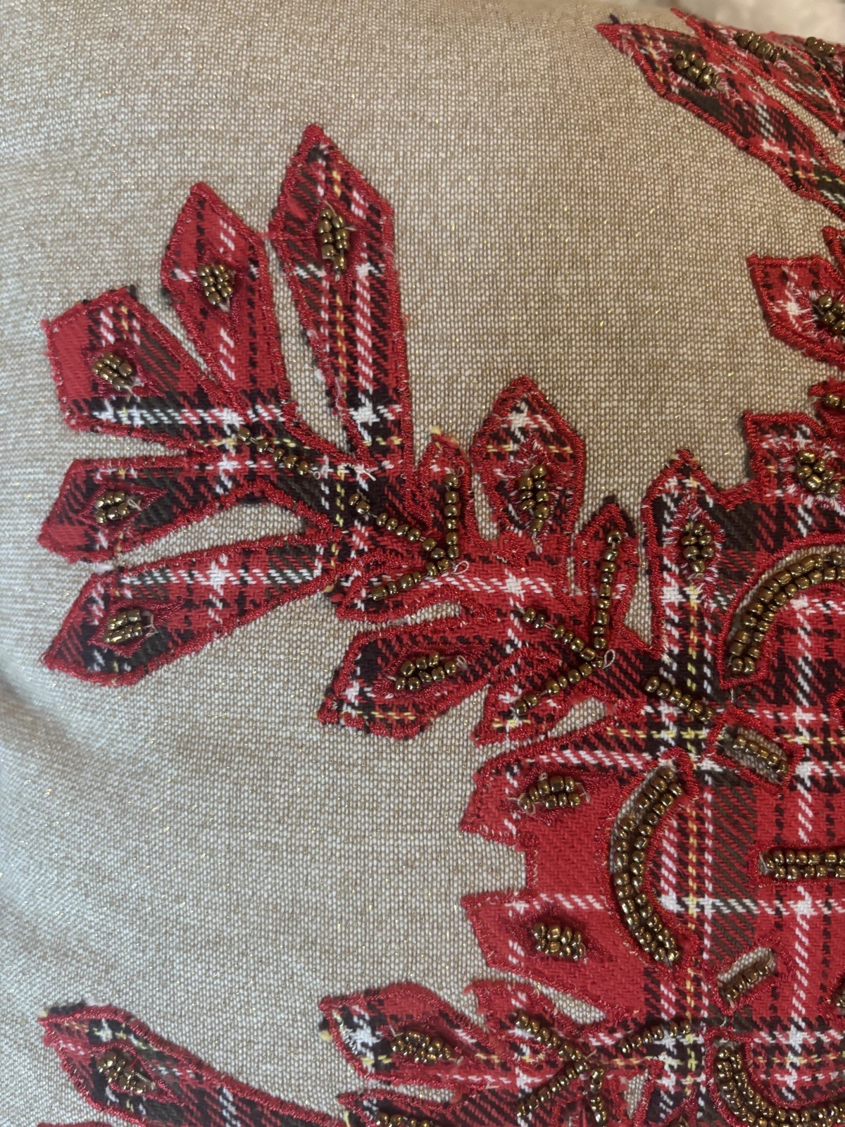 The Pier 1 Imports beaded Sparkly Christmas Snowflake Holiday Embellished 2 Pillows are decorative throw pillows featuring a tartan pattern with a square shape and multicolor design. Made of 100% polyester, these 16 x 16 inch pillows are adorned with beaded, embroidered, and appliqué details, perfect for adding a festive touch to any room during the holiday season. With a zip closure and spot clean only care instructions, these whimsical pillows from India are sure to bring a touch of Christmas cheer to your decor.